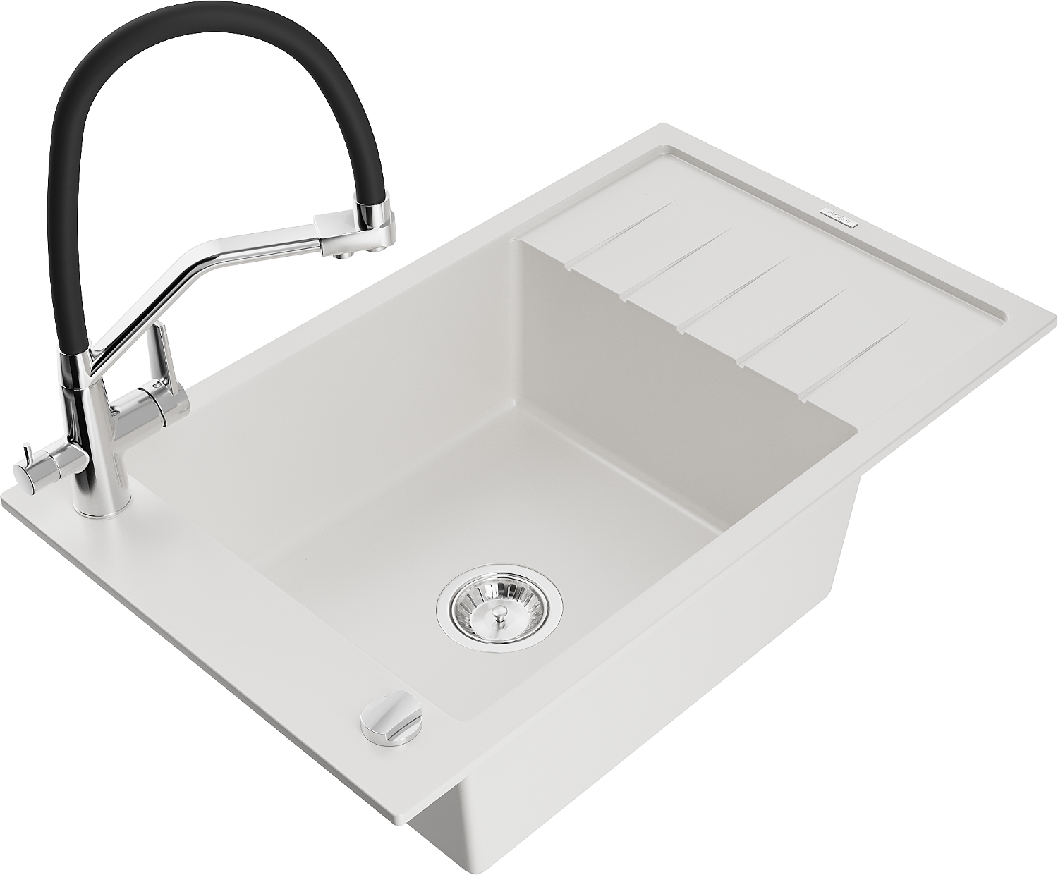 Mexen Elias zlewozmywak granitowy 1-komorowy z ociekaczem i baterią kuchenną Duo, biały - 6511-20-671701-07