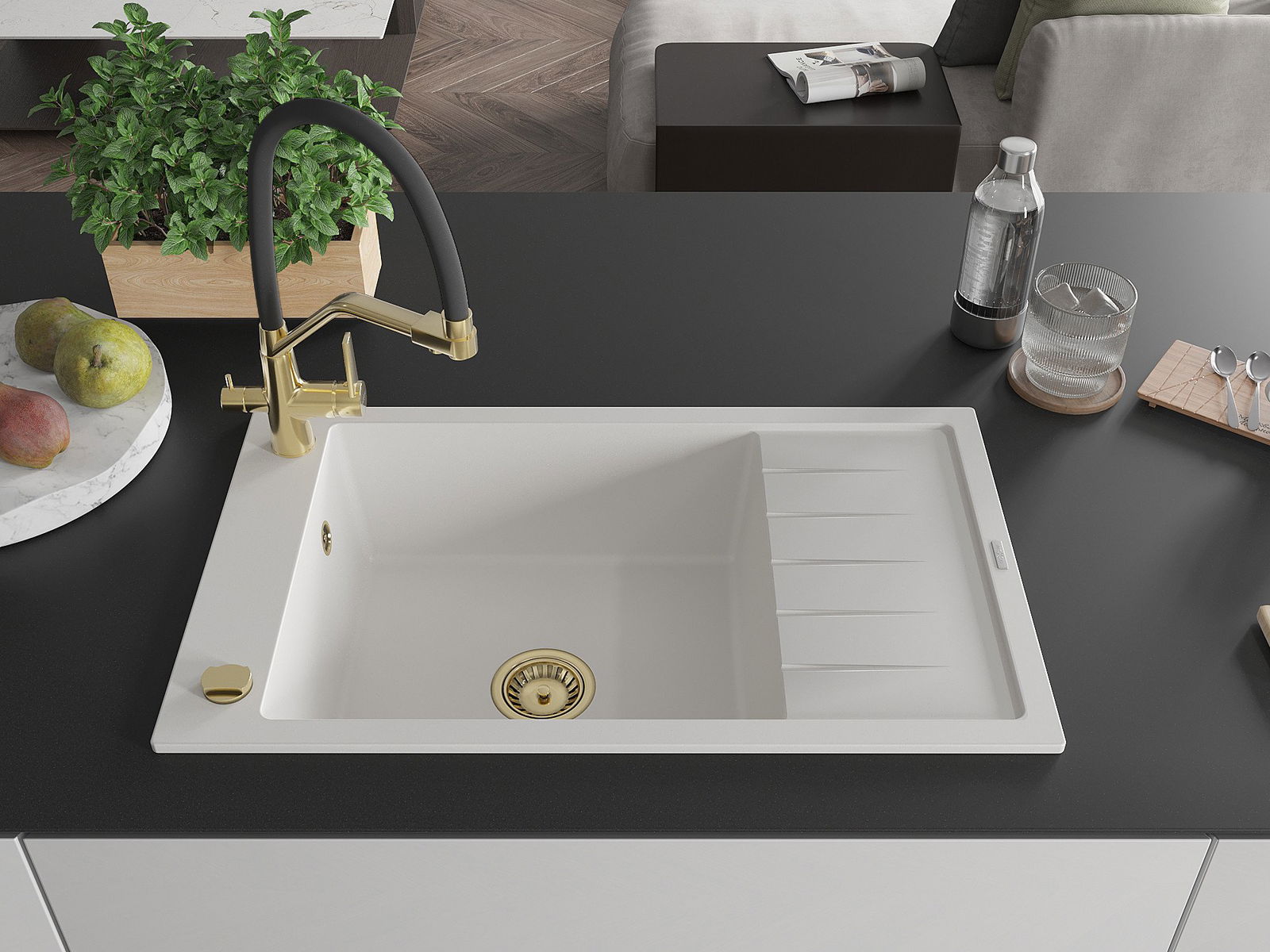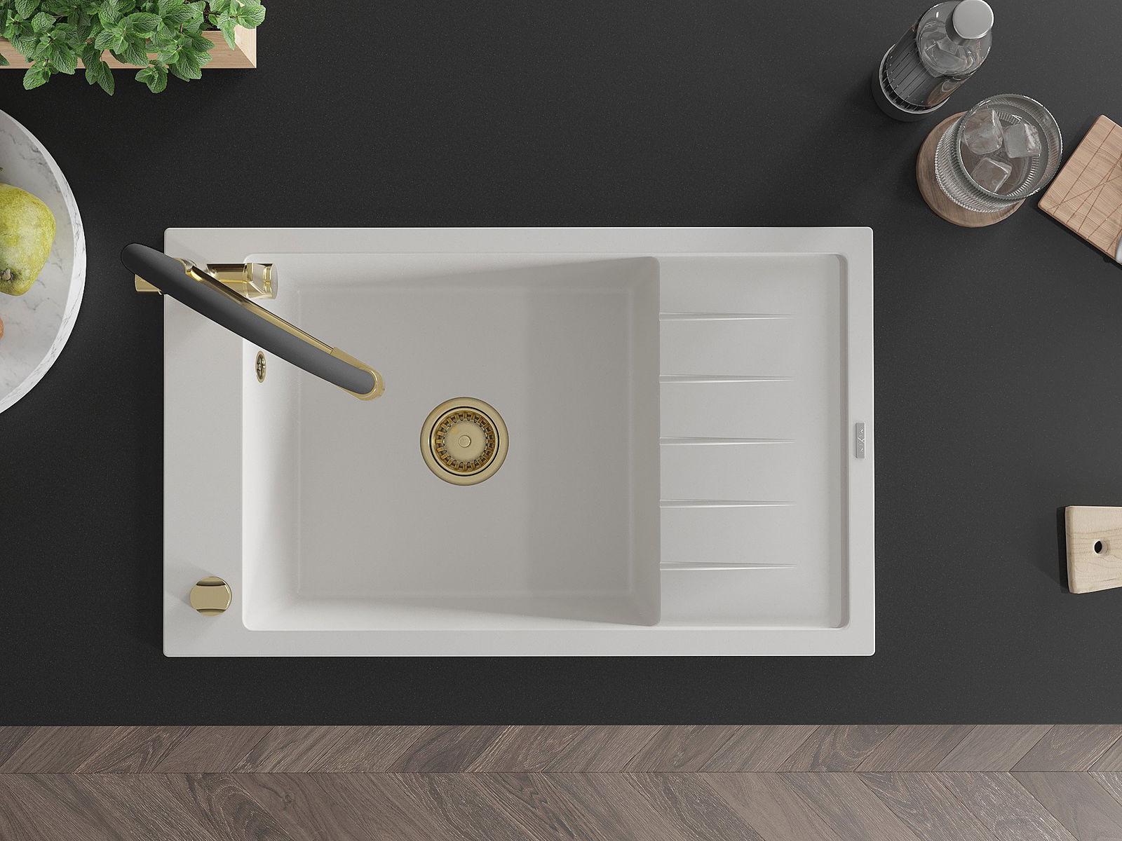 Zlew posiada podfrezowany otwór o średnicy 35 mm do samodzielnego wybicia. Można go wykorzystać m.in. do montażu dozownika na płyn, który wyeliminuje obecność plastikowych butelek w kuchni i nada jej eleganckiego wykończenia.