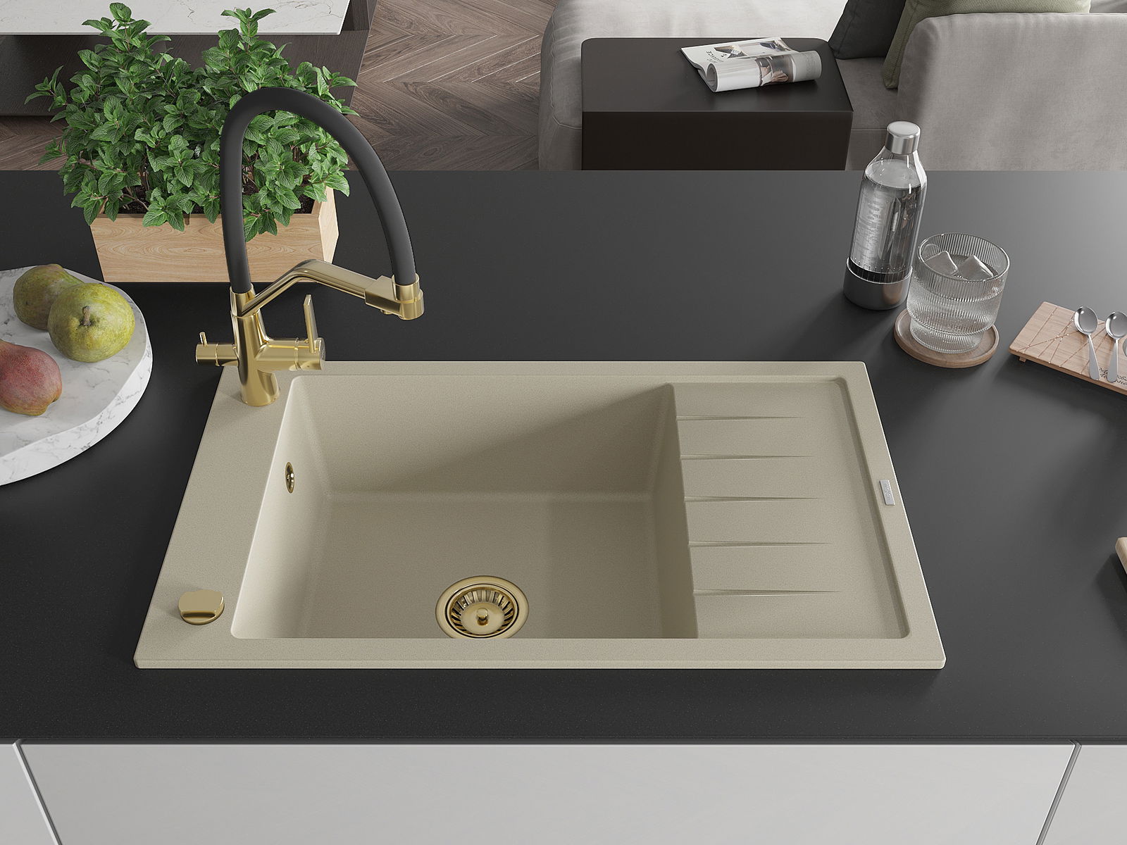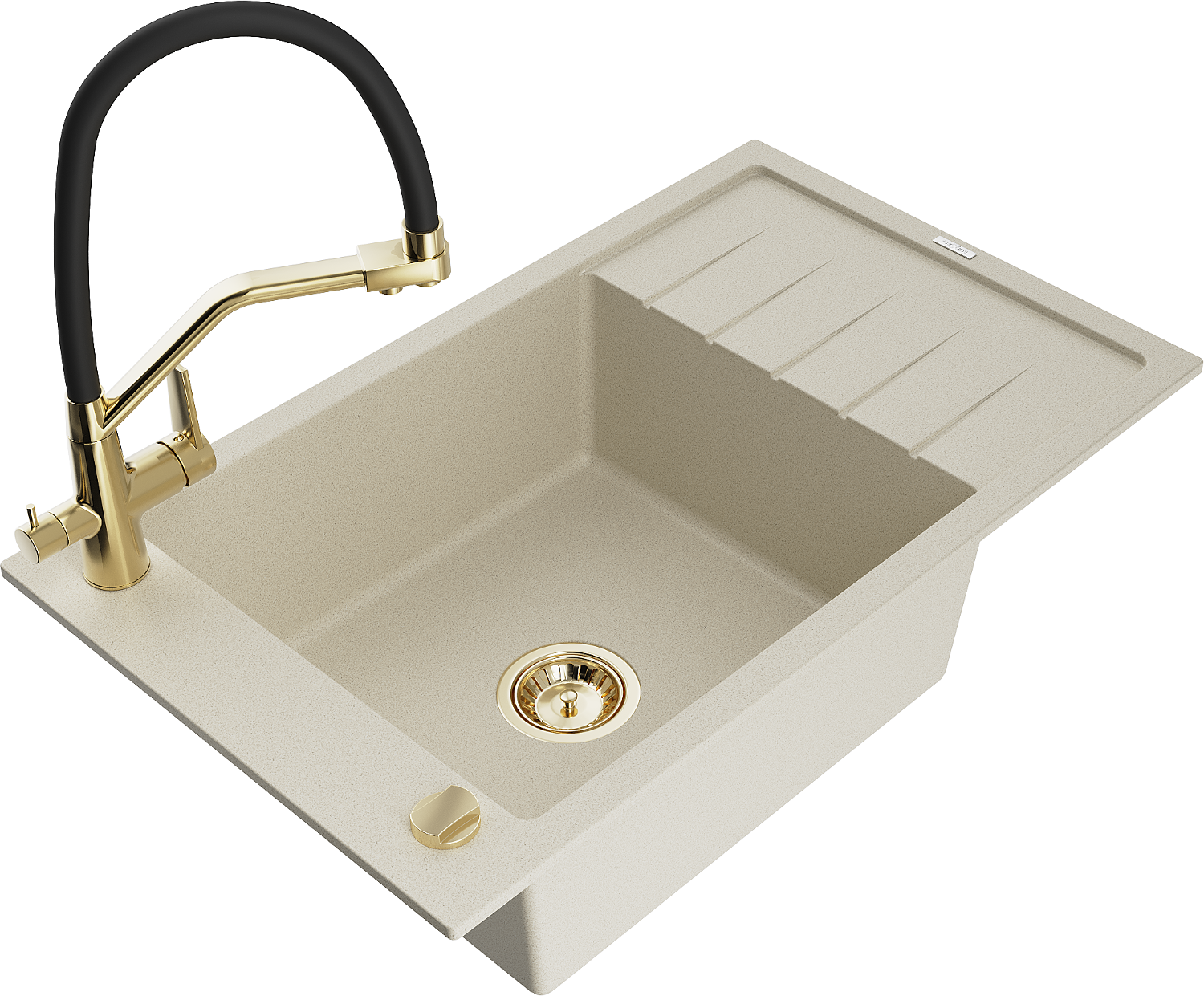 Mexen Elias zlewozmywak granitowy 1-komorowy z ociekaczem i baterią kuchenną Duo, beżowy - 6511-69-671701-57-G