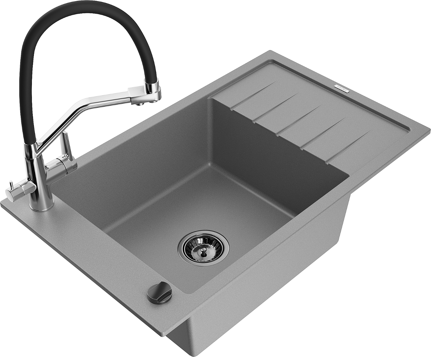 Mexen Elias zlewozmywak granitowy 1-komorowy z ociekaczem i baterią kuchenną Duo, szary - 6511-71-671701-07-B