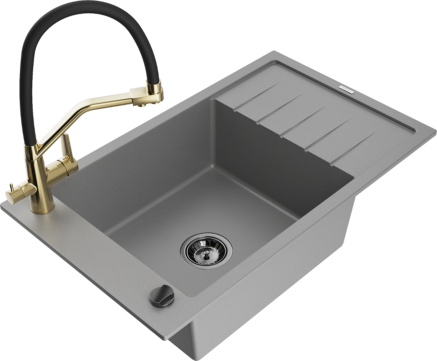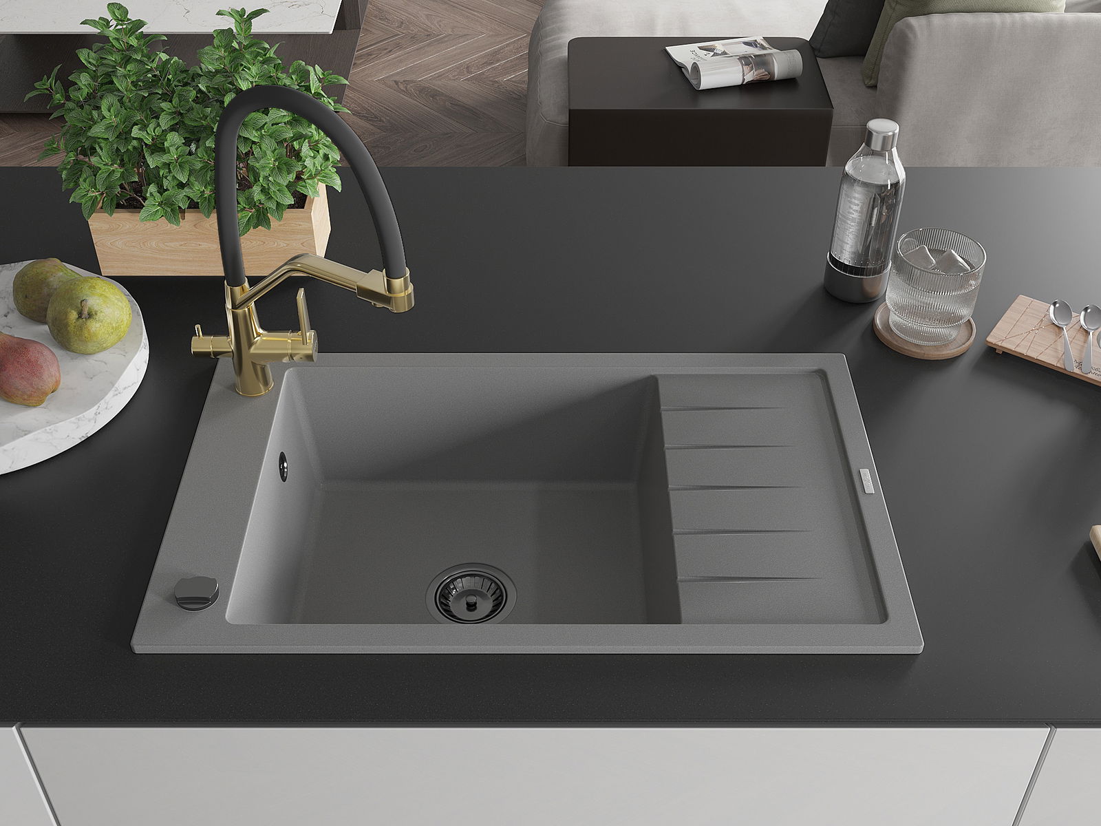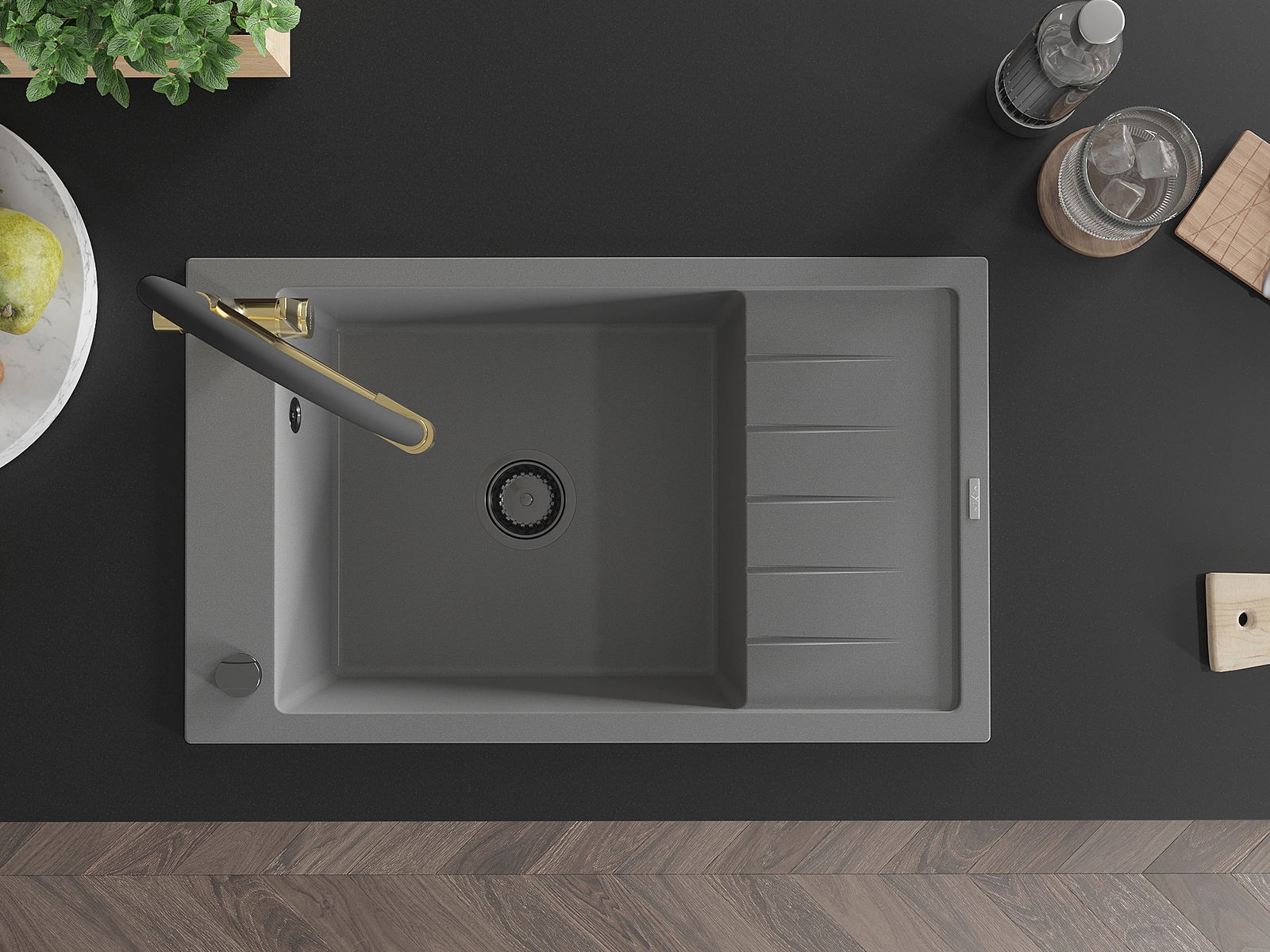 Mexen Elias zlewozmywak granitowy 1-komorowy z ociekaczem i baterią kuchenną Duo, szary - 6511-71-671701-57-B