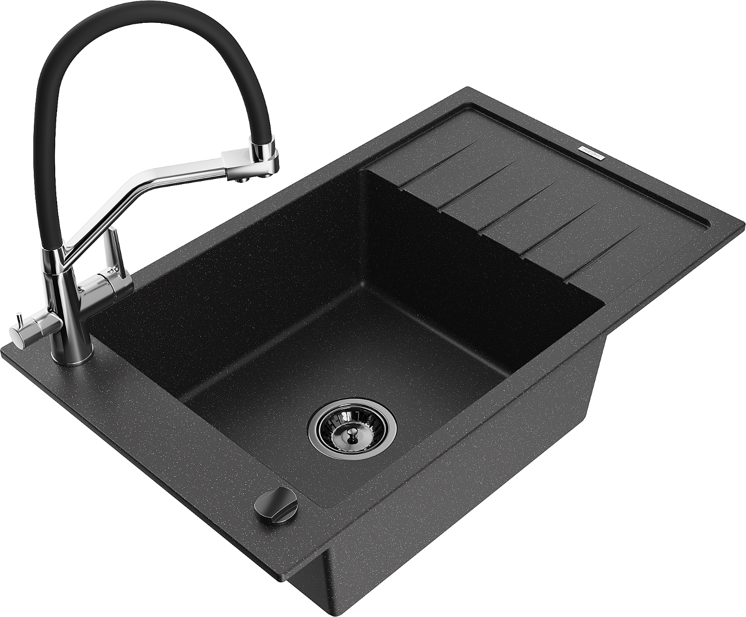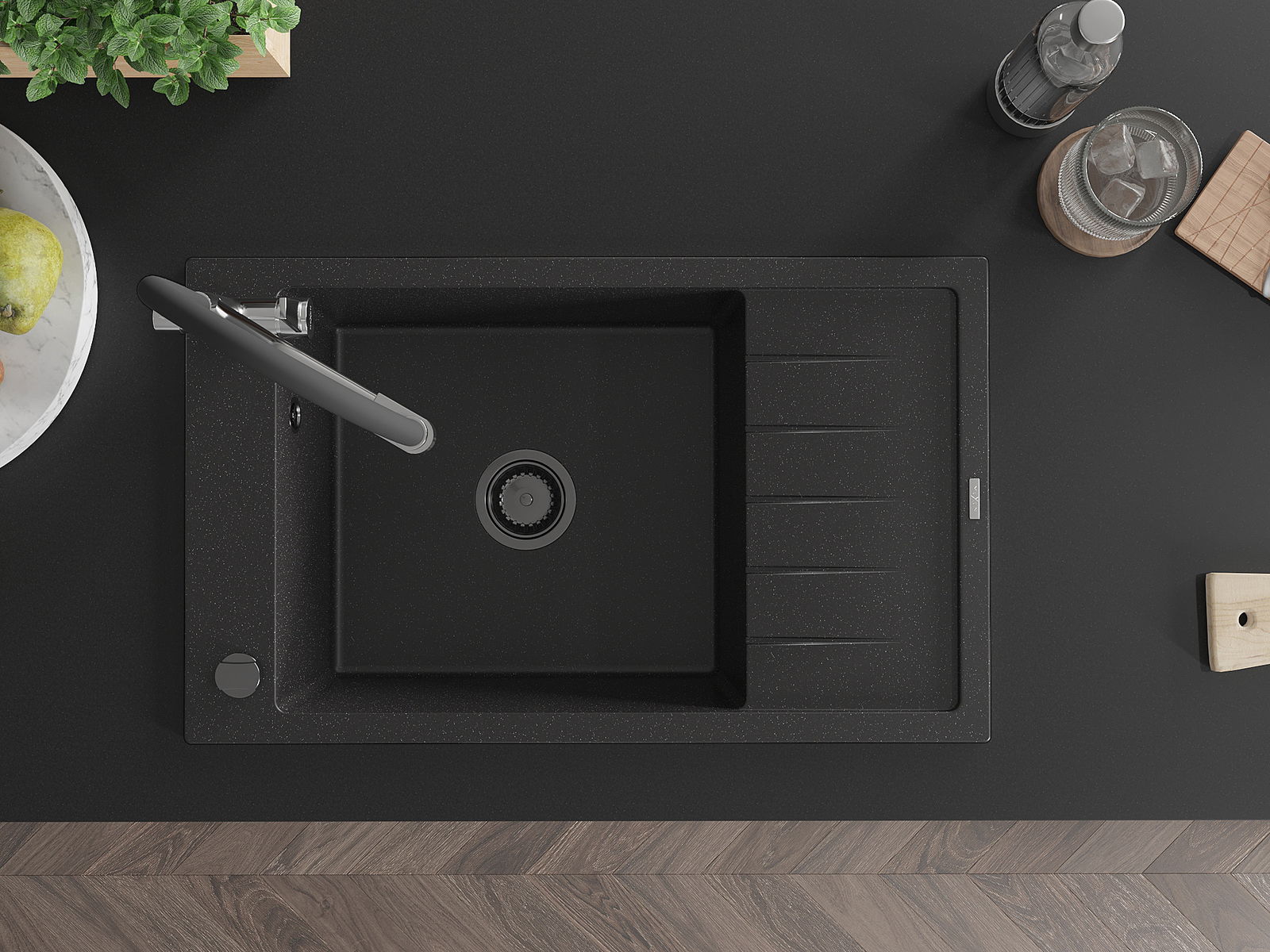 Mexen Elias zlewozmywak granitowy 1-komorowy z ociekaczem i baterią kuchenną Duo, czarny/srebrny metalik - 6511-73-671701-07-B