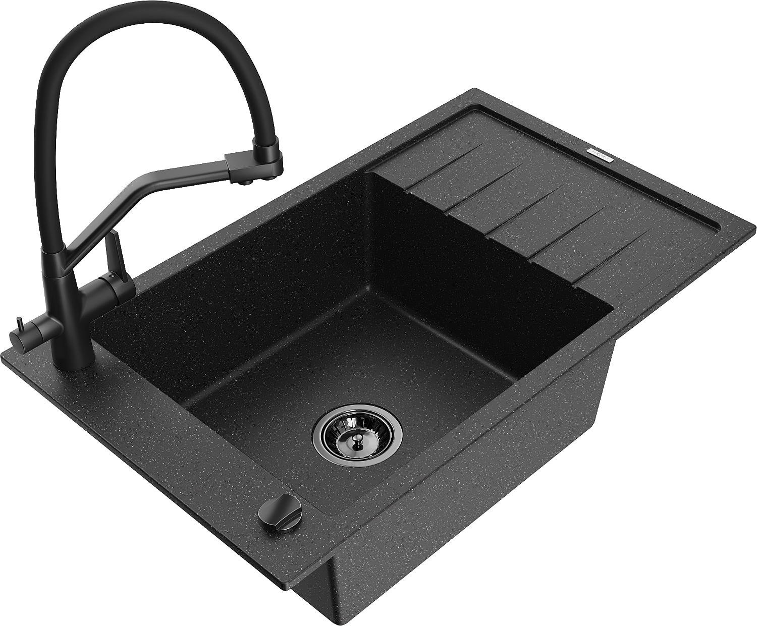 Mexen Elias zlewozmywak granitowy 1-komorowy z ociekaczem i baterią kuchenną Duo, czarny/srebrny metalik - 6511-73-671701-70-B