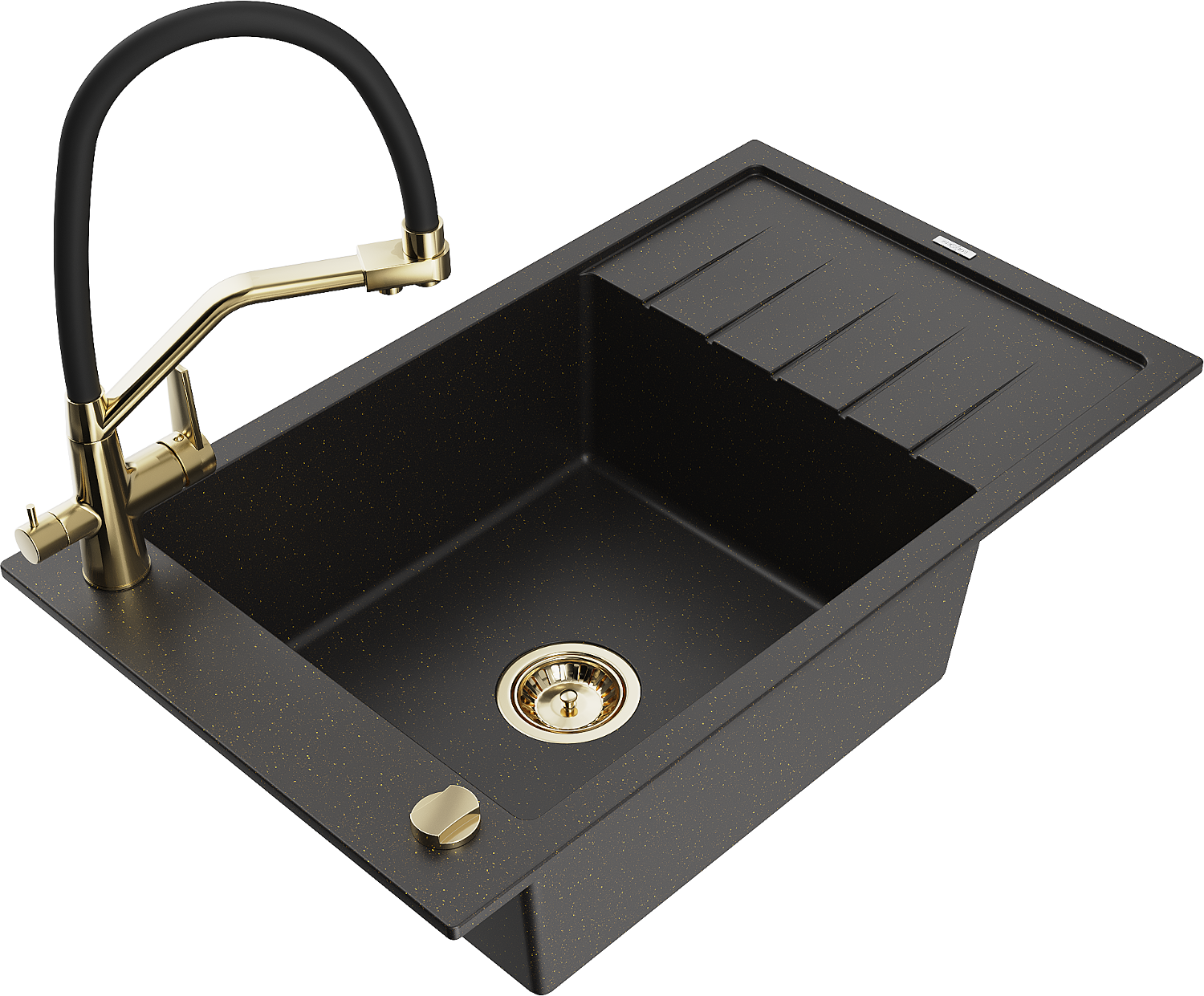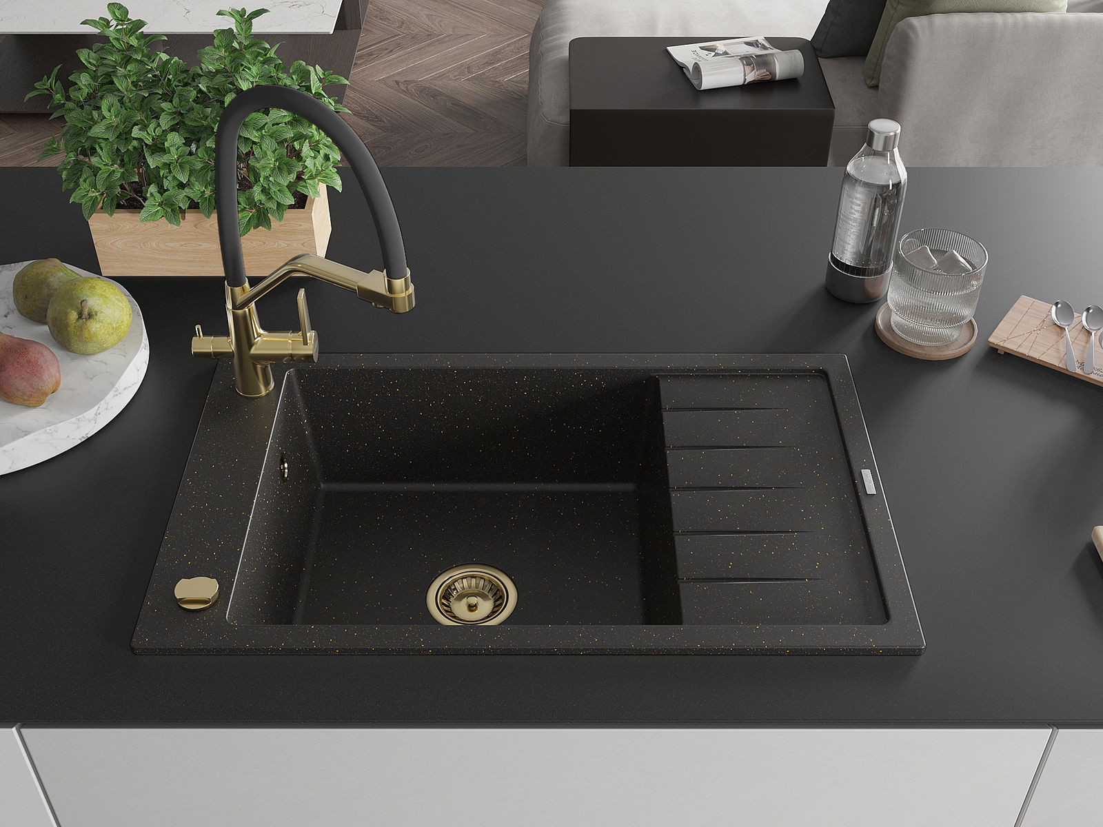 Mexen Elias zlewozmywak granitowy 1-komorowy z ociekaczem i baterią kuchenną Duo, czarny/złoty metalik - 6511-75-671701-57-G