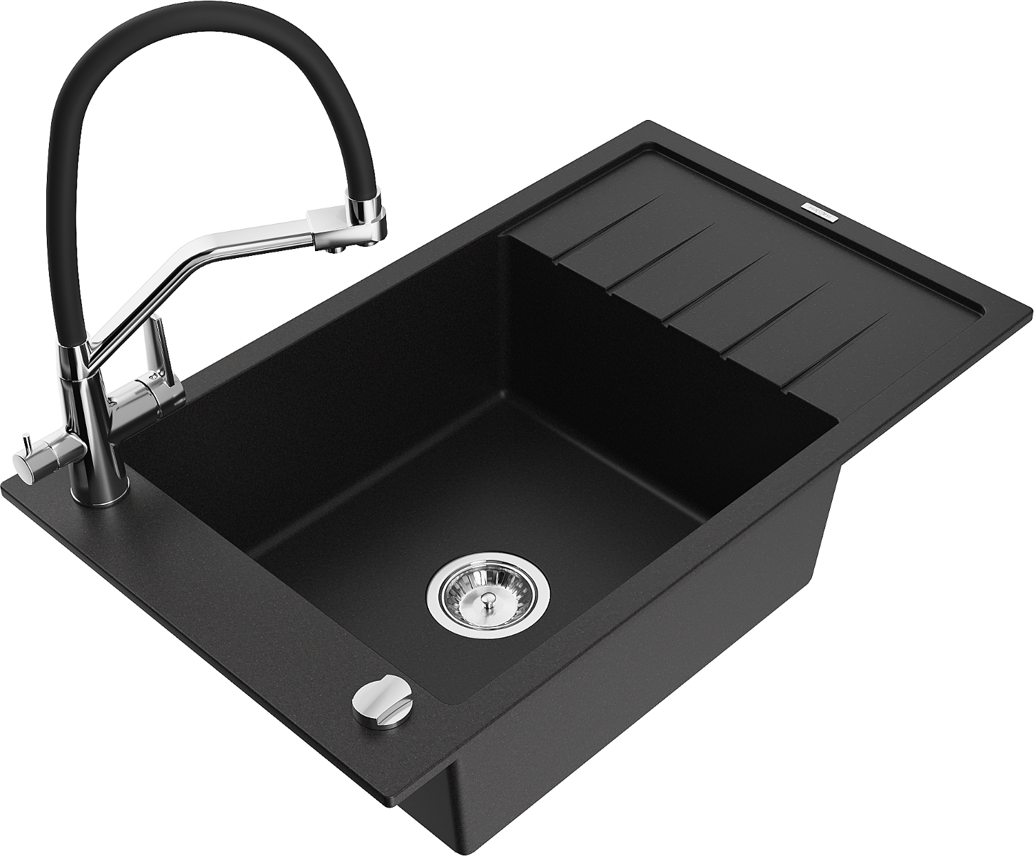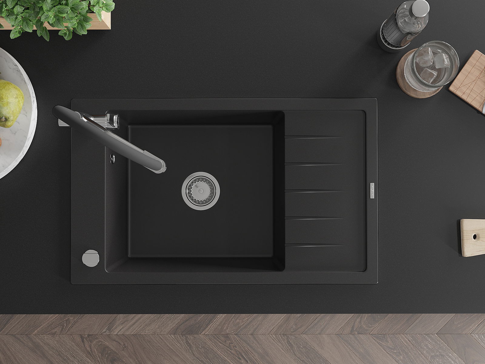 Mexen Elias zlewozmywak granitowy 1-komorowy z ociekaczem i baterią kuchenną Duo, czarny - 6511-77-671701-07