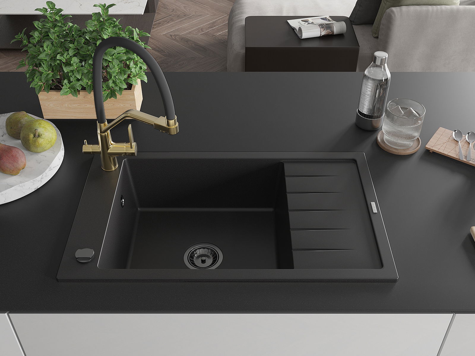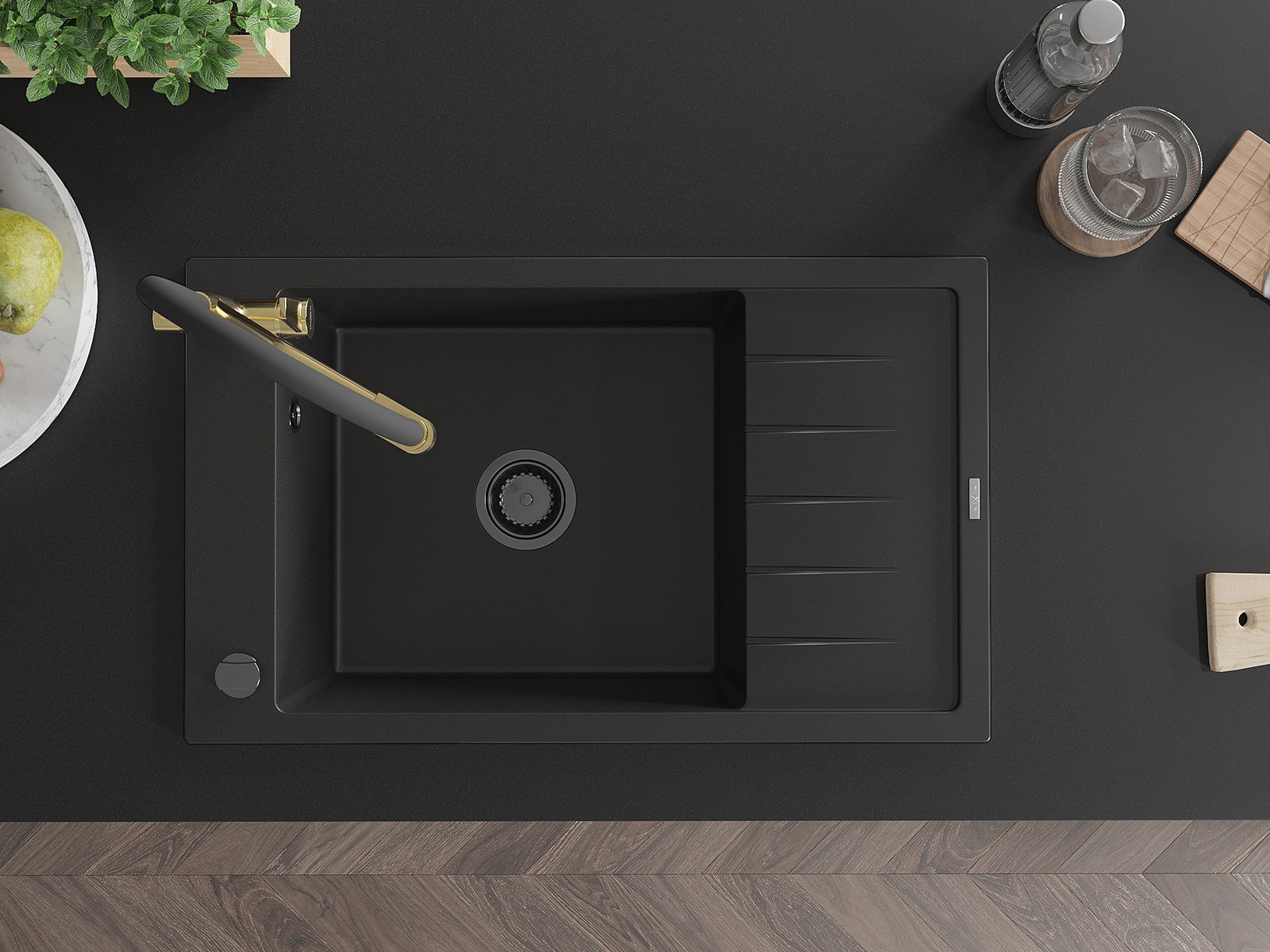 Zlew posiada podfrezowany otwór o średnicy 35 mm do samodzielnego wybicia. Można go wykorzystać m.in. do montażu dozownika na płyn, który wyeliminuje obecność plastikowych butelek w kuchni i nada jej eleganckiego wykończenia.