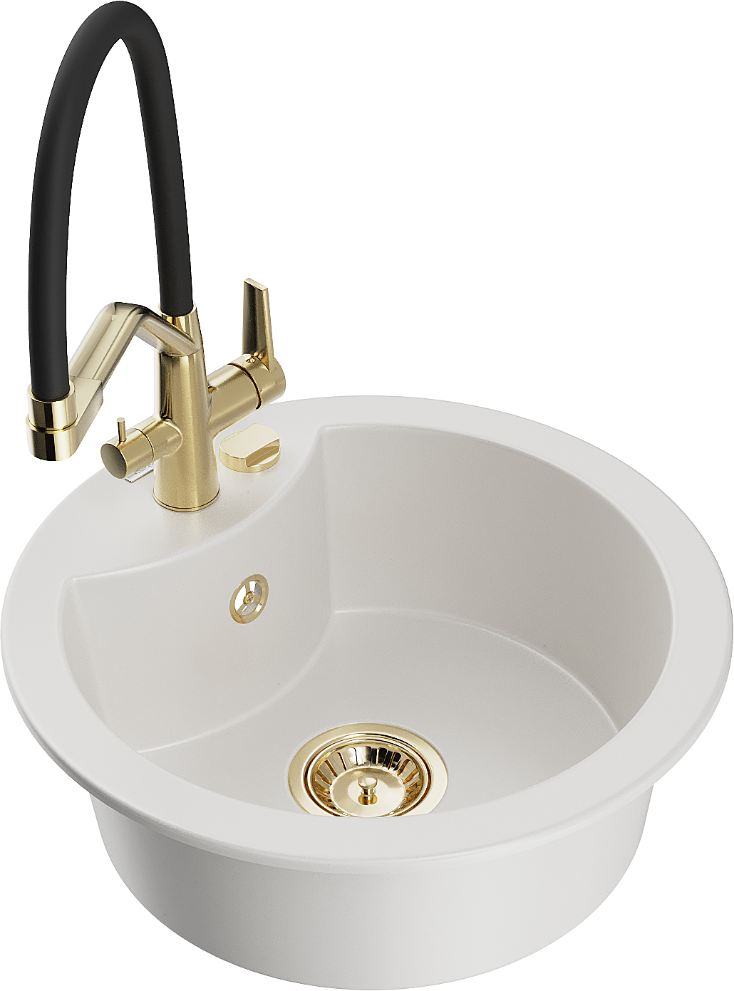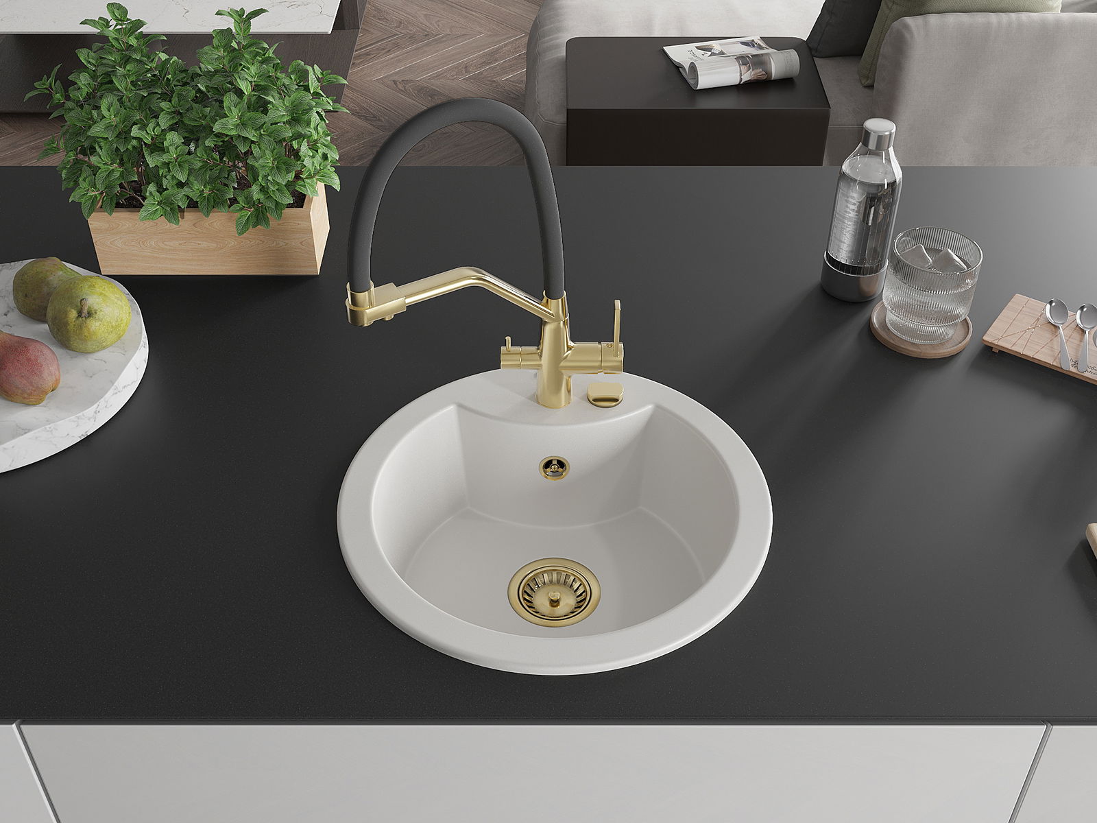 Zlew posiada podfrezowany otwór o średnicy 35 mm do samodzielnego wybicia. Można go wykorzystać m.in. do montażu dozownika na płyn, który wyeliminuje obecność plastikowych butelek w kuchni i nada jej eleganckiego wykończenia.