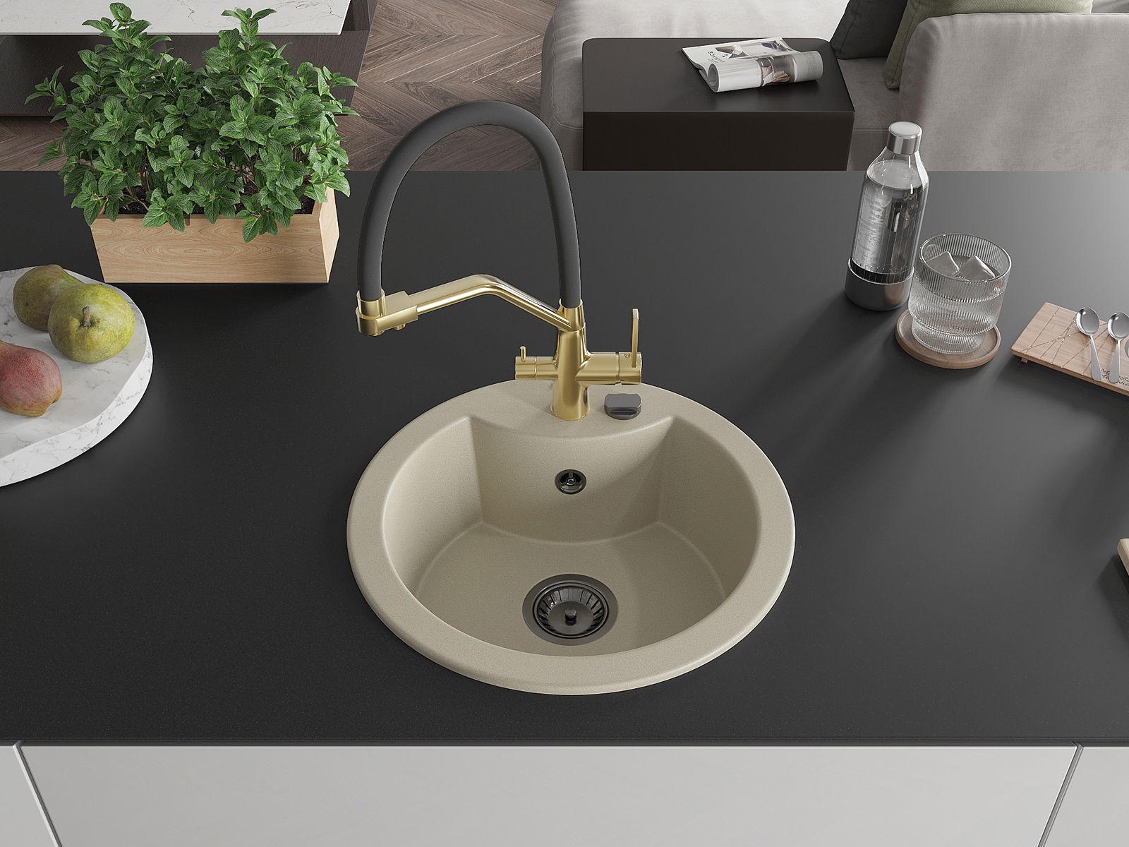 Zlew posiada podfrezowany otwór o średnicy 35 mm do samodzielnego wybicia. Można go wykorzystać m.in. do montażu dozownika na płyn, który wyeliminuje obecność plastikowych butelek w kuchni i nada jej eleganckiego wykończenia.