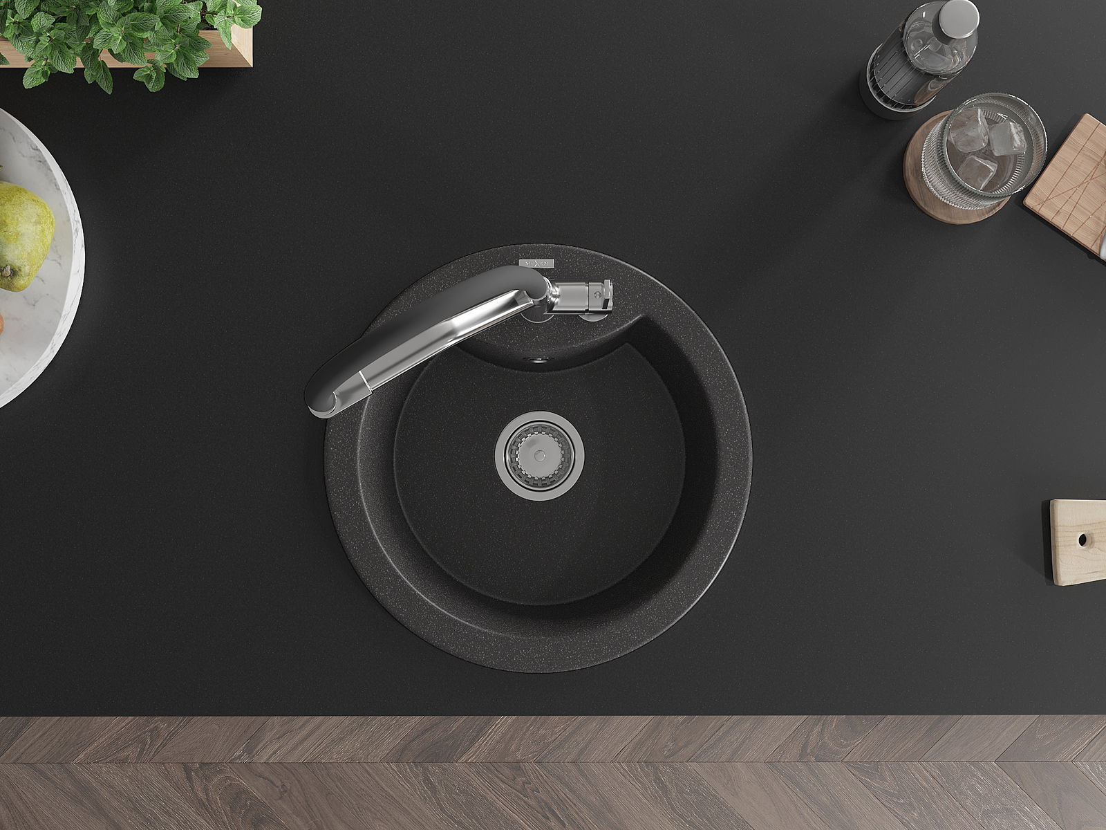 Zlew posiada podfrezowany otwór o średnicy 35 mm do samodzielnego wybicia. Można go wykorzystać m.in. do montażu dozownika na płyn, który wyeliminuje obecność plastikowych butelek w kuchni i nada jej eleganckiego wykończenia.