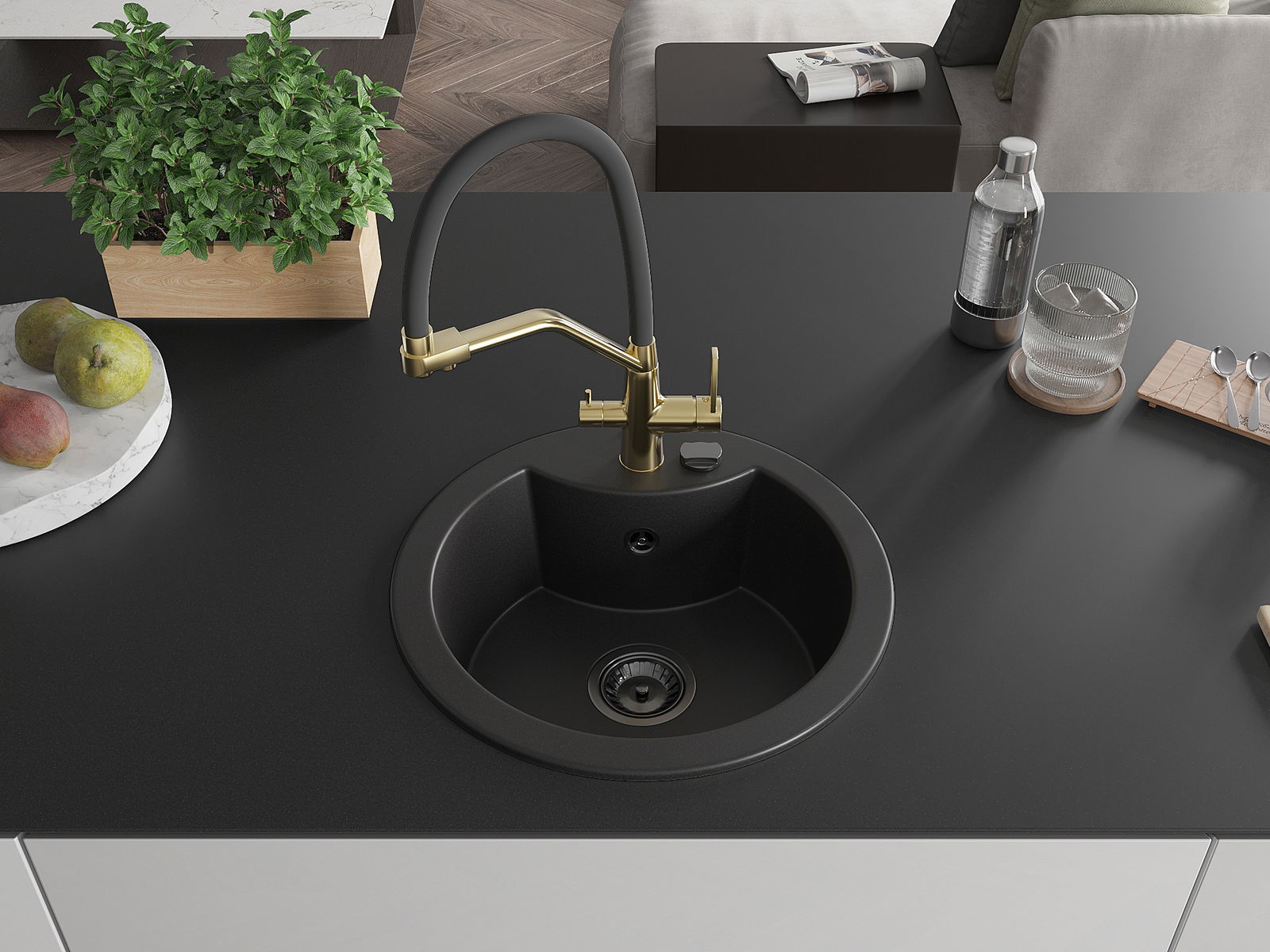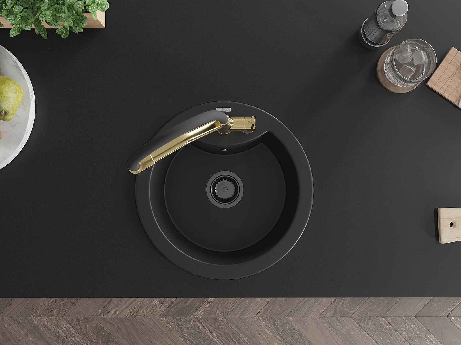 Zlew posiada podfrezowany otwór o średnicy 35 mm do samodzielnego wybicia. Można go wykorzystać m.in. do montażu dozownika na płyn, który wyeliminuje obecność plastikowych butelek w kuchni i nada jej eleganckiego wykończenia.