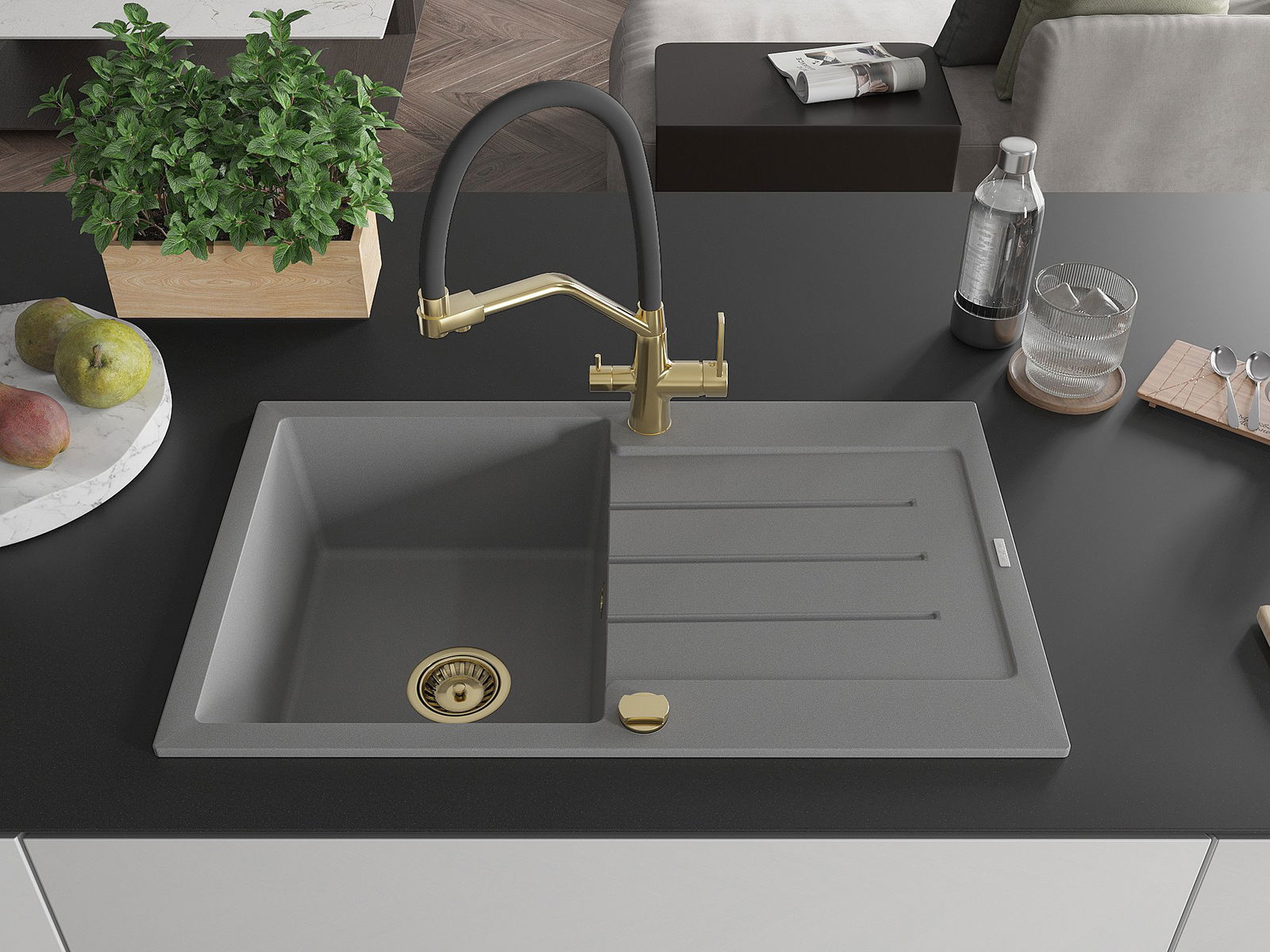 Mexen Bruno zlewozmywak granitowy 1-komorowy z ociekaczem i baterią kuchenną Duo, szary - 6513-71-671701-57-G