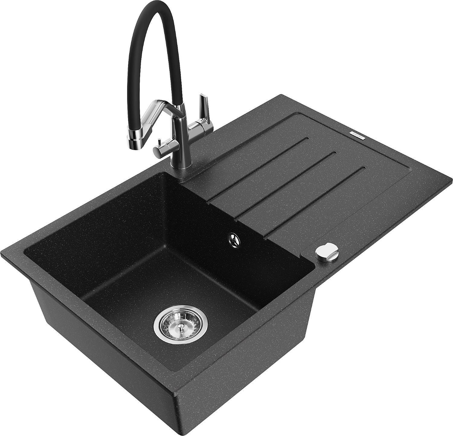Mexen Bruno zlewozmywak granitowy 1-komorowy z ociekaczem i baterią kuchenną Duo, czarny/srebrny metalik - 6513-73-671701-07