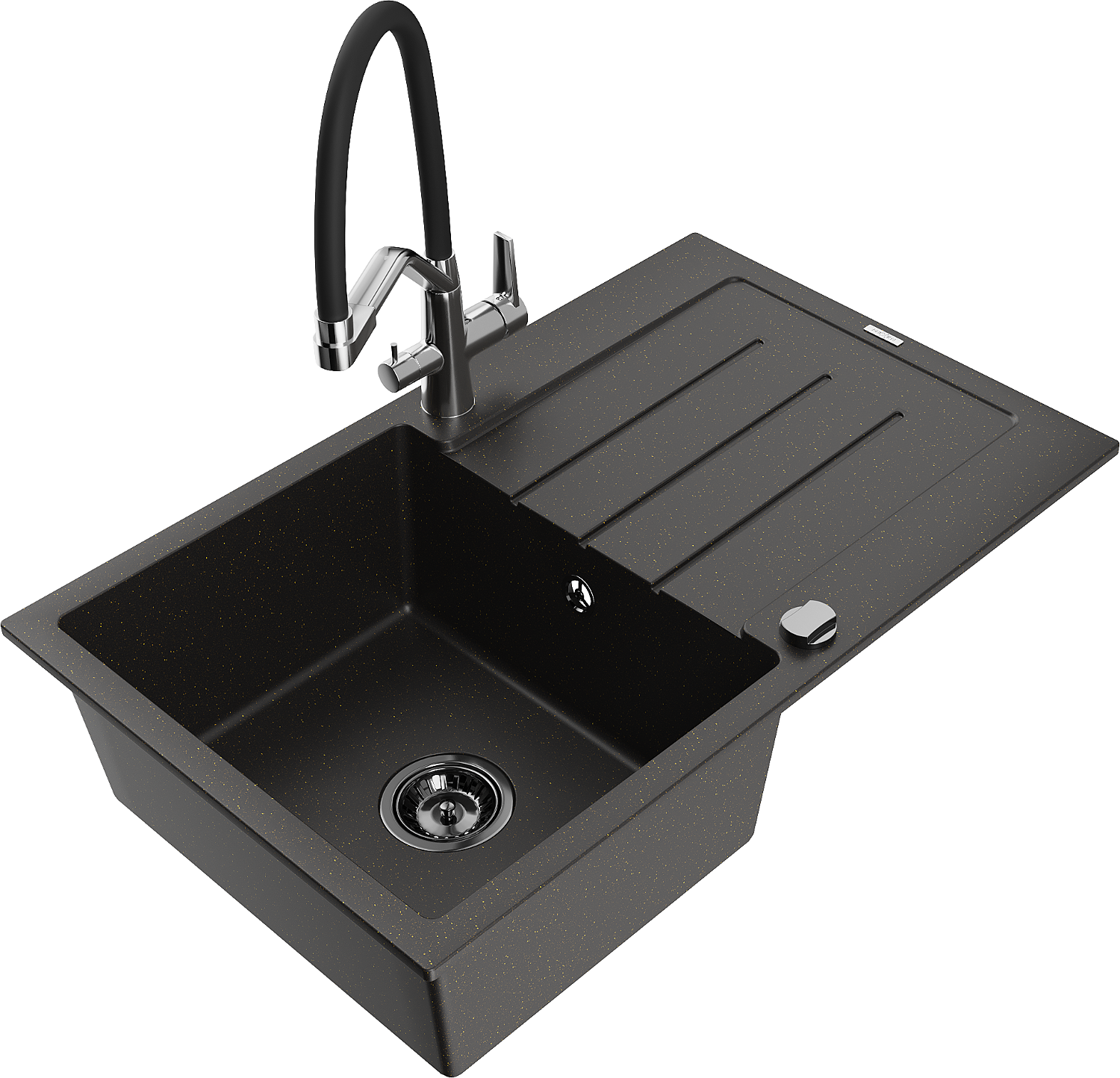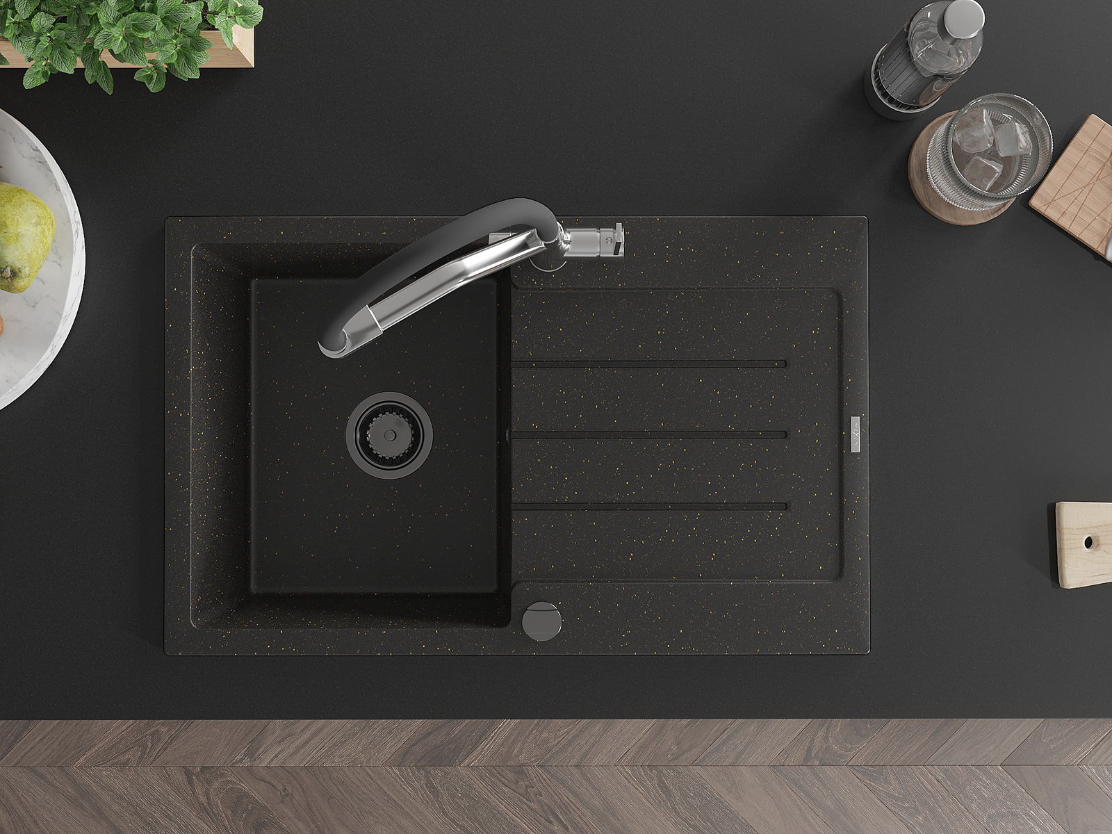 Mexen Bruno zlewozmywak granitowy 1-komorowy z ociekaczem i baterią kuchenną Duo, czarny/złoty metalik - 6513-75-671701-07-B