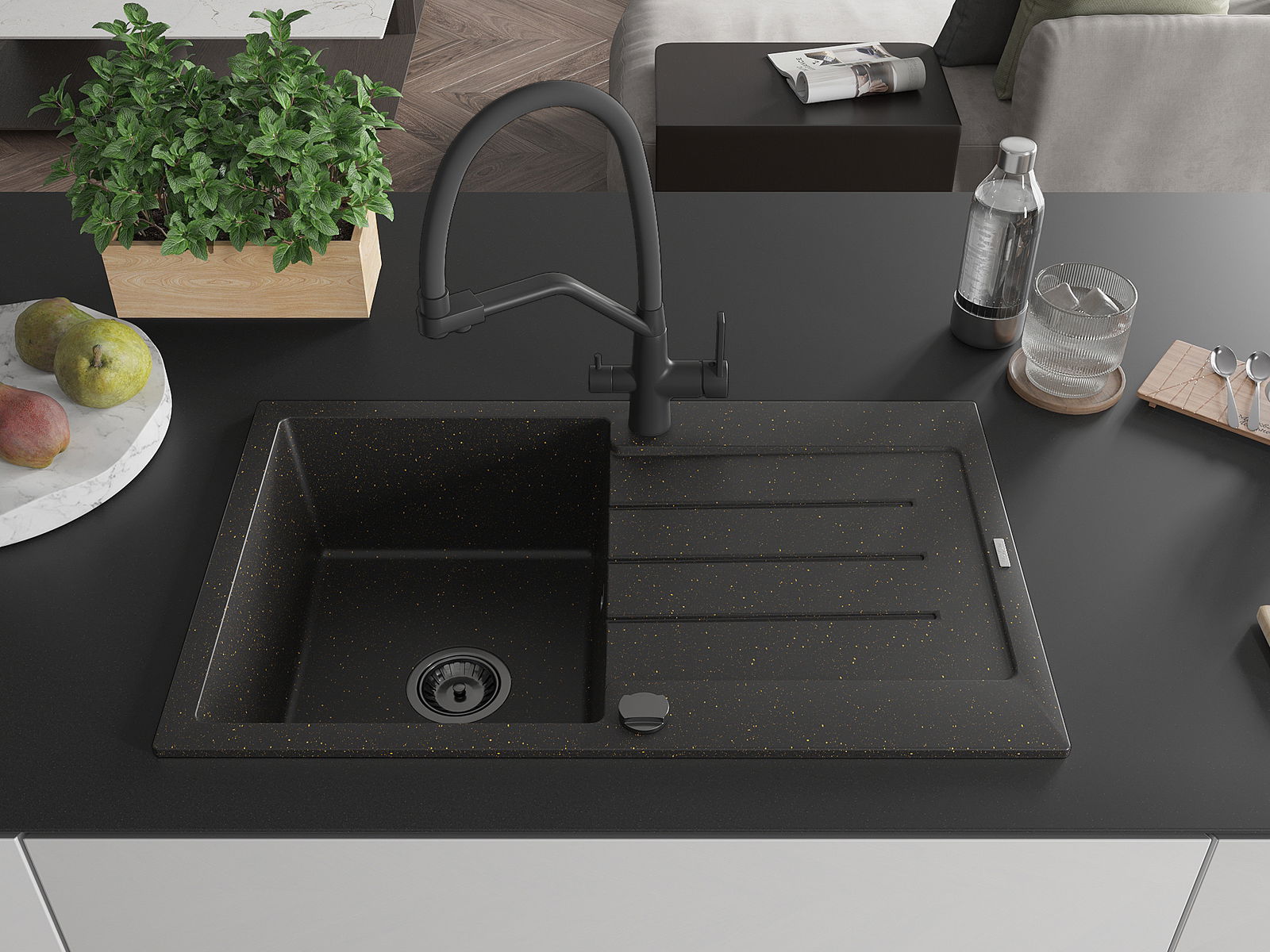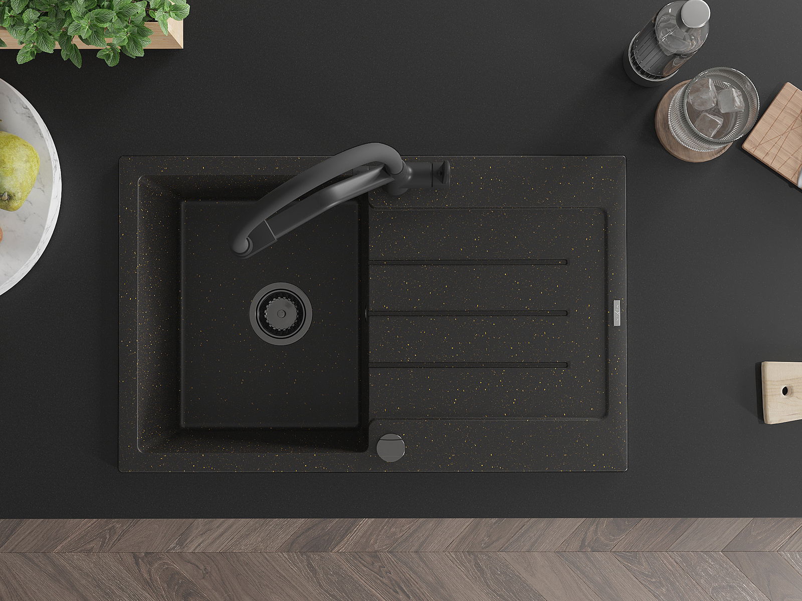 Mexen Bruno zlewozmywak granitowy 1-komorowy z ociekaczem i baterią kuchenną Duo, czarny/złoty metalik - 6513-75-671701-70-B