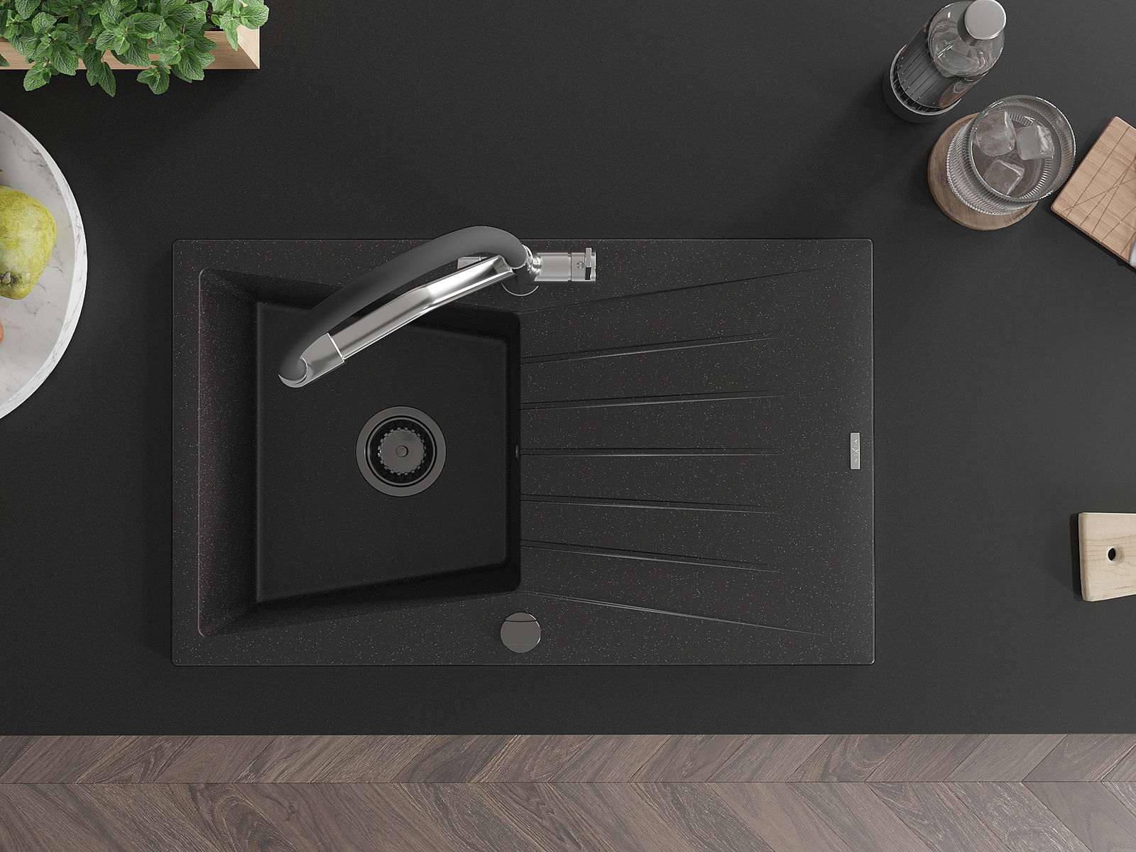 Mexen Cesar zlewozmywak granitowy 1-komorowy z ociekaczem i baterią kuchenną Duo, czarny/srebrny metalik - 6514-73-671701-07-B