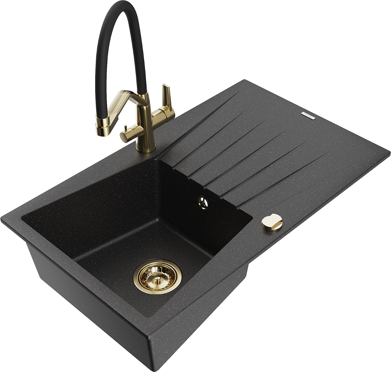 Mexen Cesar zlewozmywak granitowy 1-komorowy z ociekaczem i baterią kuchenną Duo, czarny/srebrny metalik - 6514-73-671701-57-G
