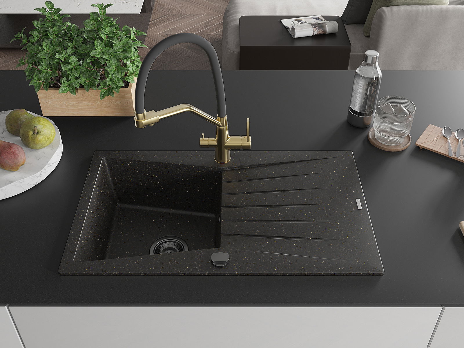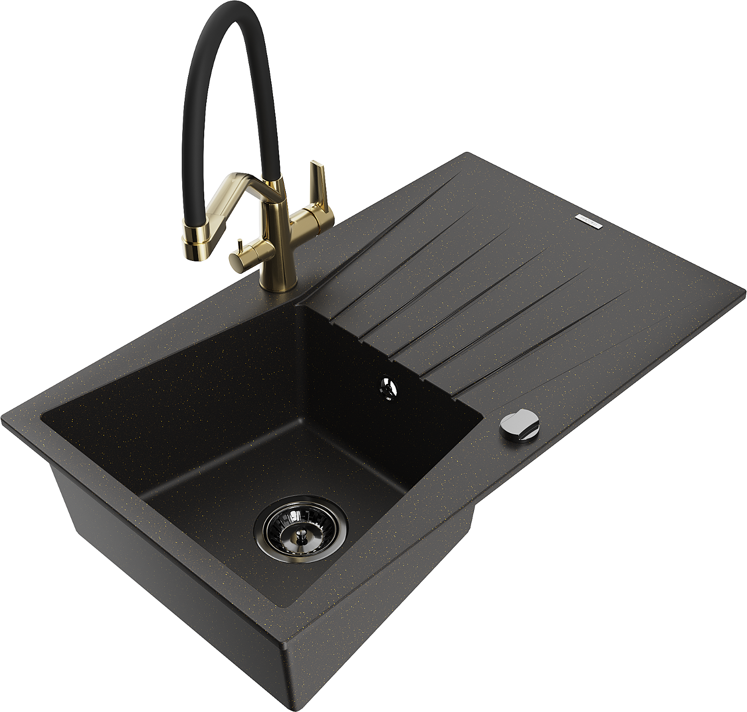 Mexen Cesar zlewozmywak granitowy 1-komorowy z ociekaczem i baterią kuchenną Duo, czarny/złoty metalik - 6514-75-671701-57-B