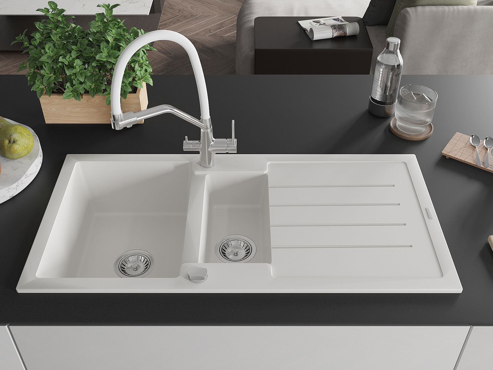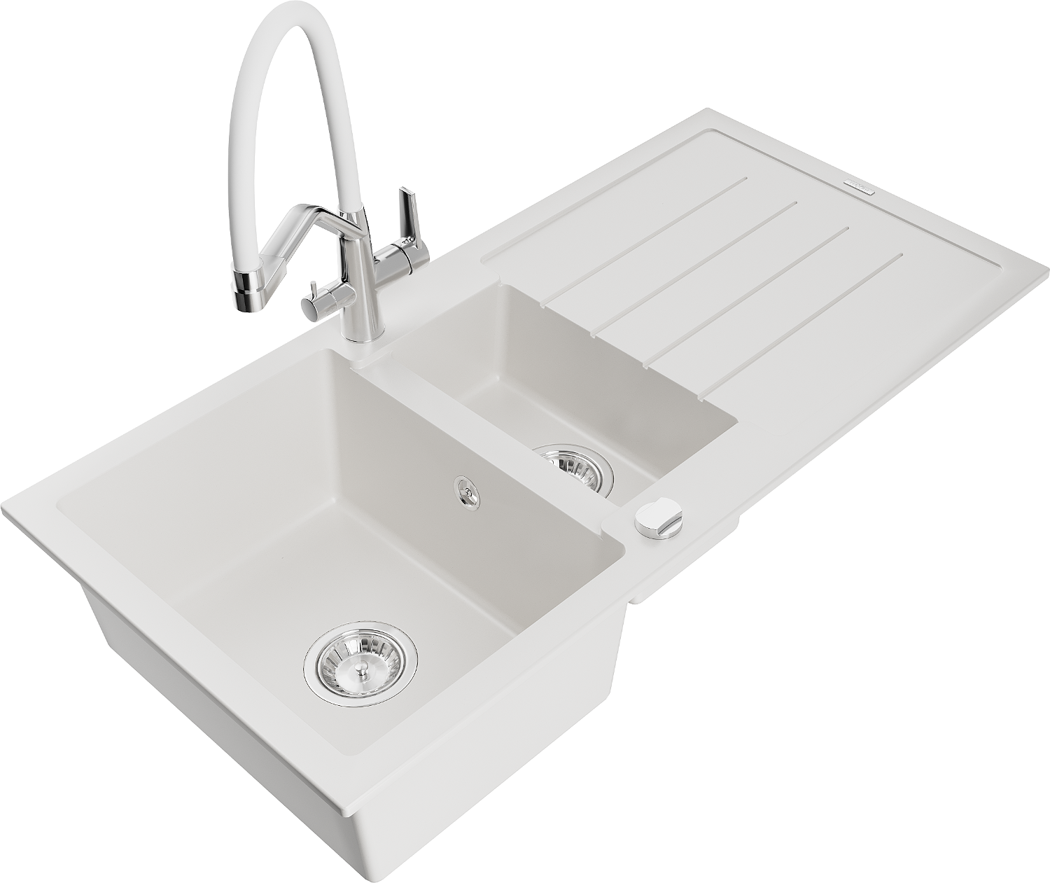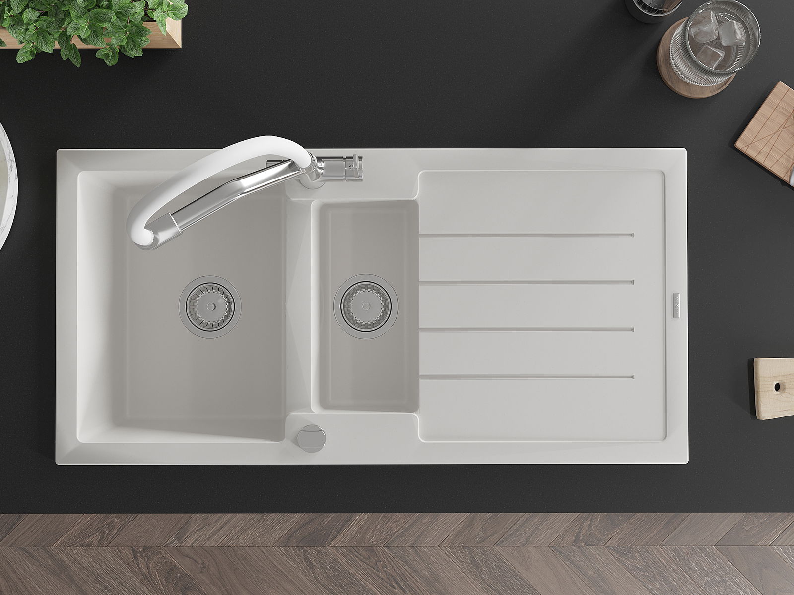 Mexen Andres zlewozmywak granitowy 1,5-komorowy z ociekaczem i baterią kuchenną Duo, biały - 6515-20-671701-02