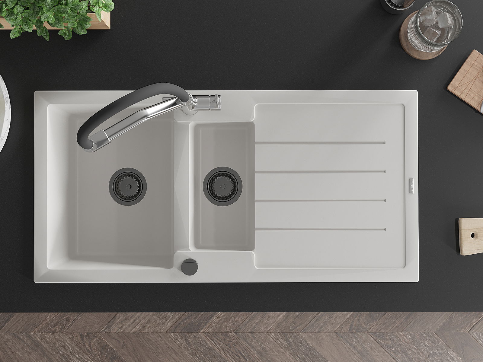 Dzięki zastosowaniu uniwersalnego systemu mocowania, zlew jest odwracalny, a ociekacz może zostać zamontowany na blacie po lewej lub prawej stronie. W ten sposób możesz z łatwością dopasować stronę do swoich potrzeb i warunków.