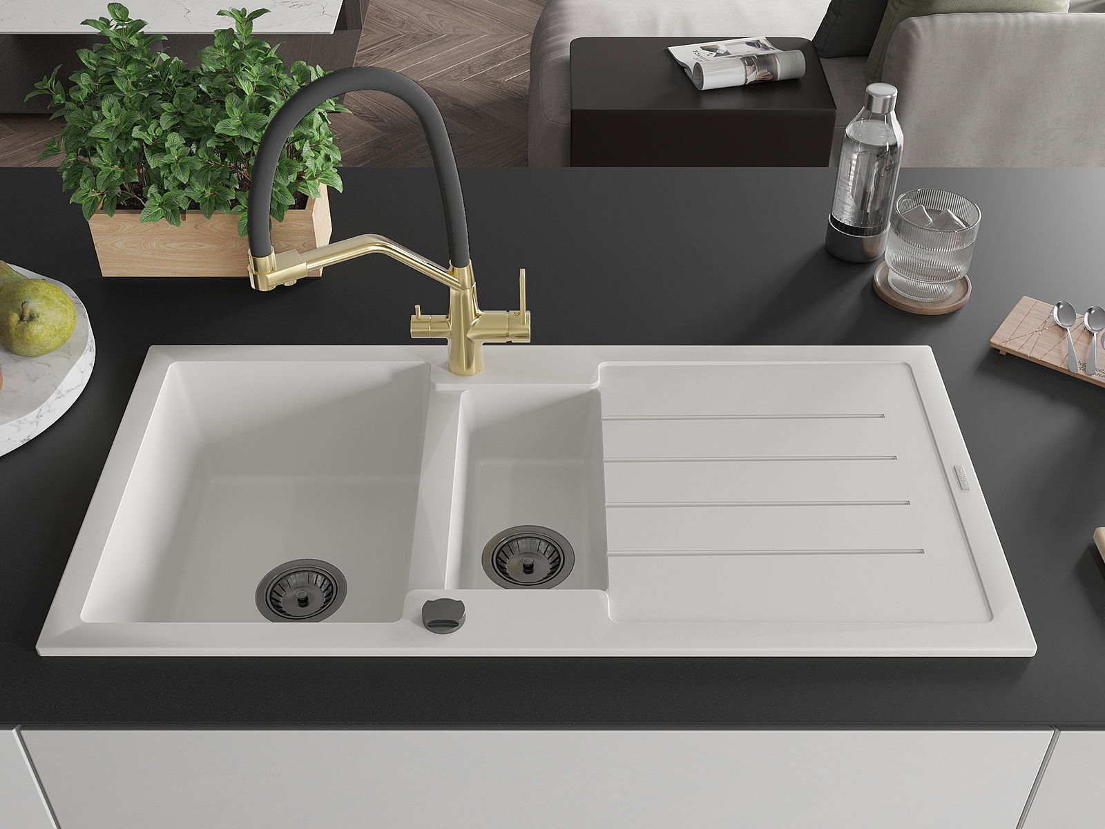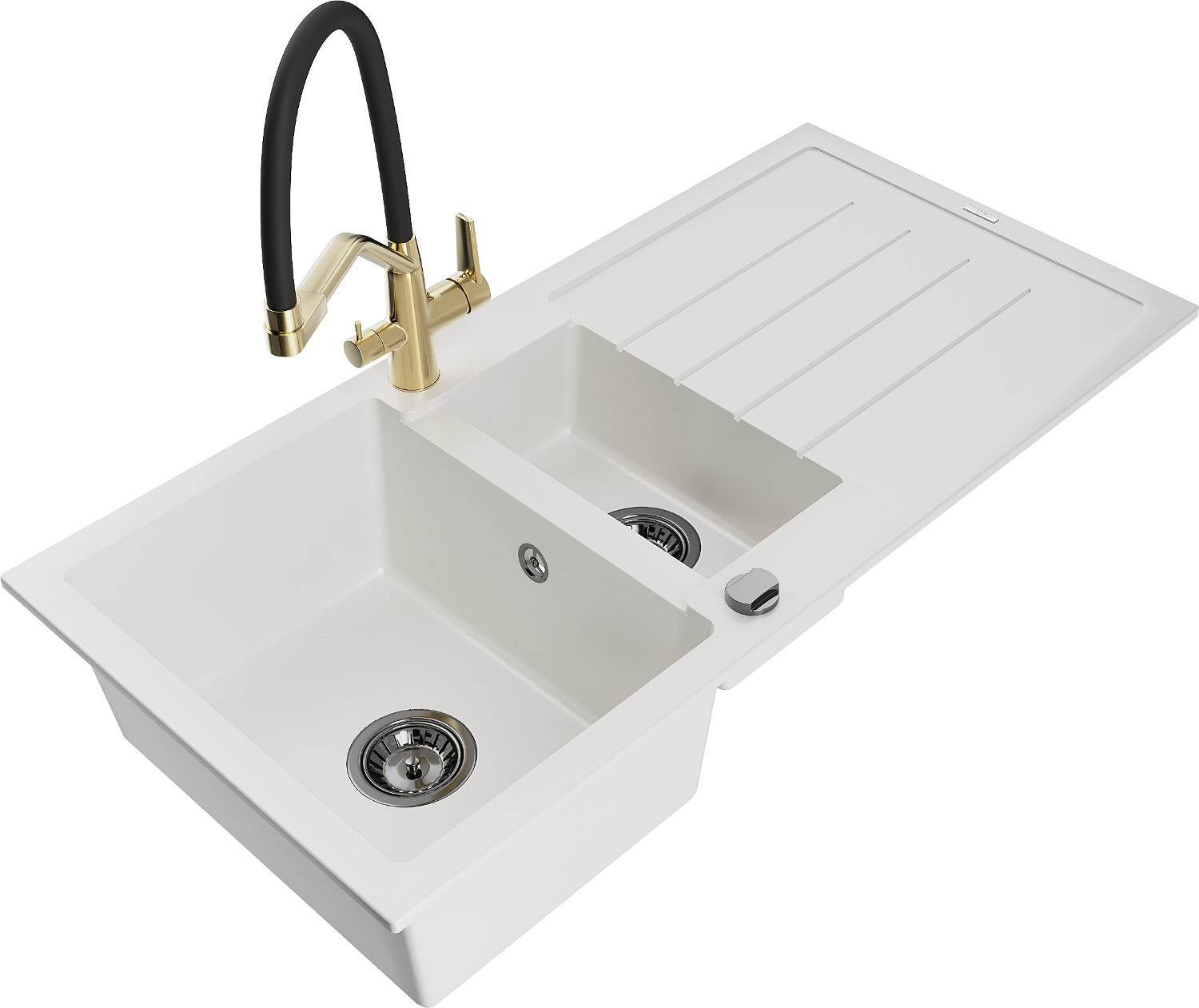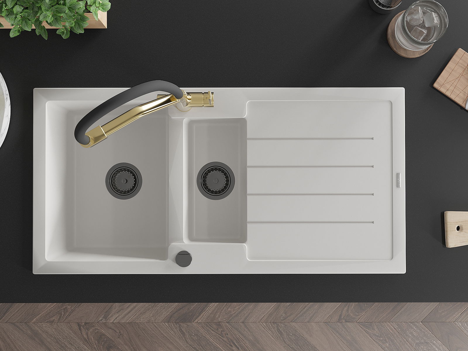 Mexen Andres zlewozmywak granitowy 1,5-komorowy z ociekaczem i baterią kuchenną Duo, biały - 6515-20-671701-57-B