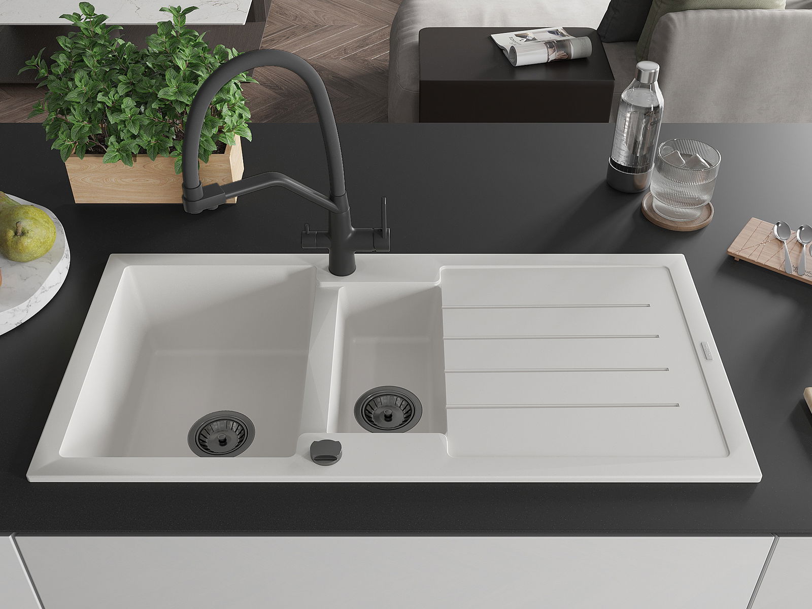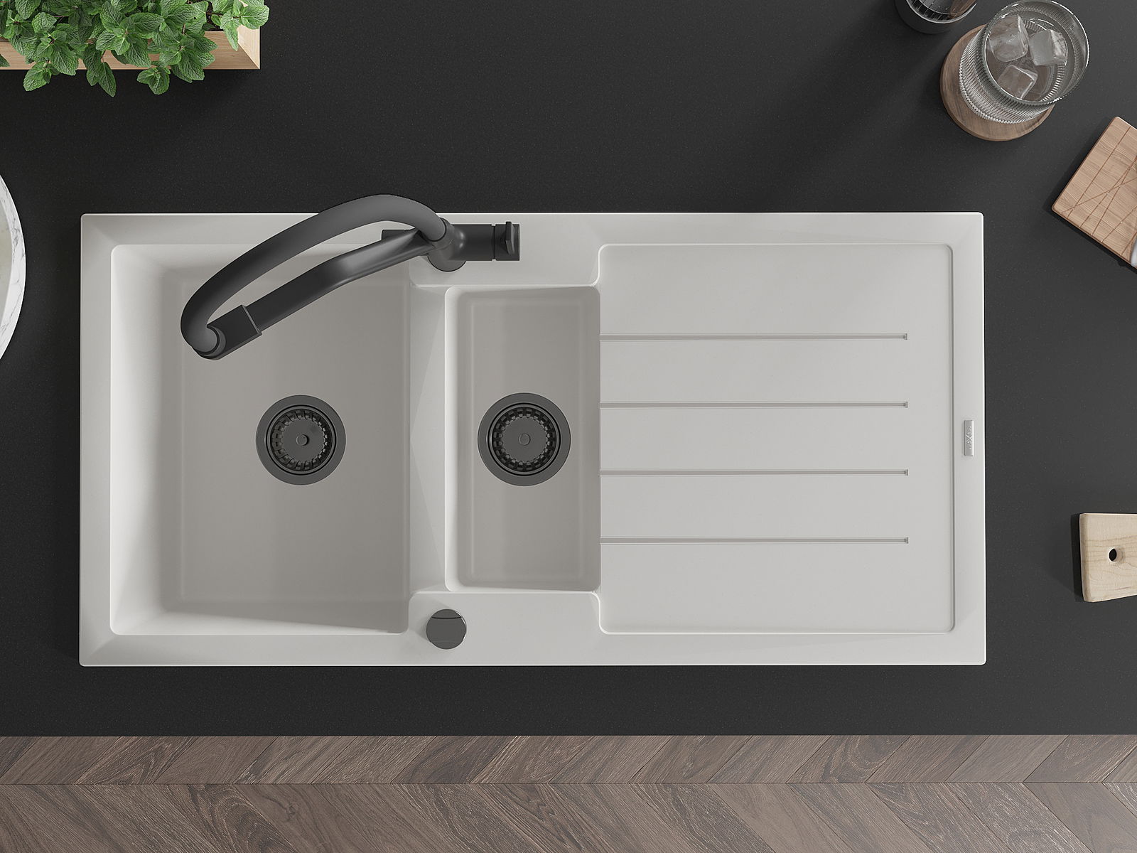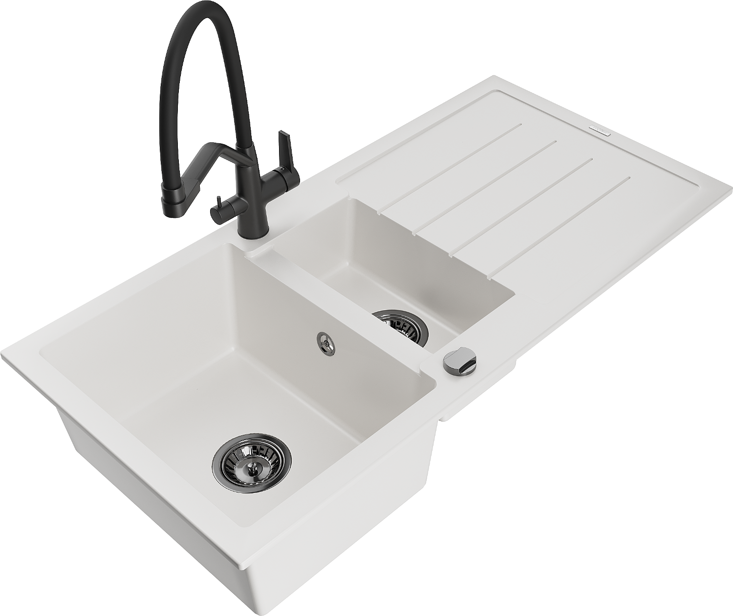 Mexen Andres zlewozmywak granitowy 1,5-komorowy z ociekaczem i baterią kuchenną Duo, biały - 6515-20-671701-70-B