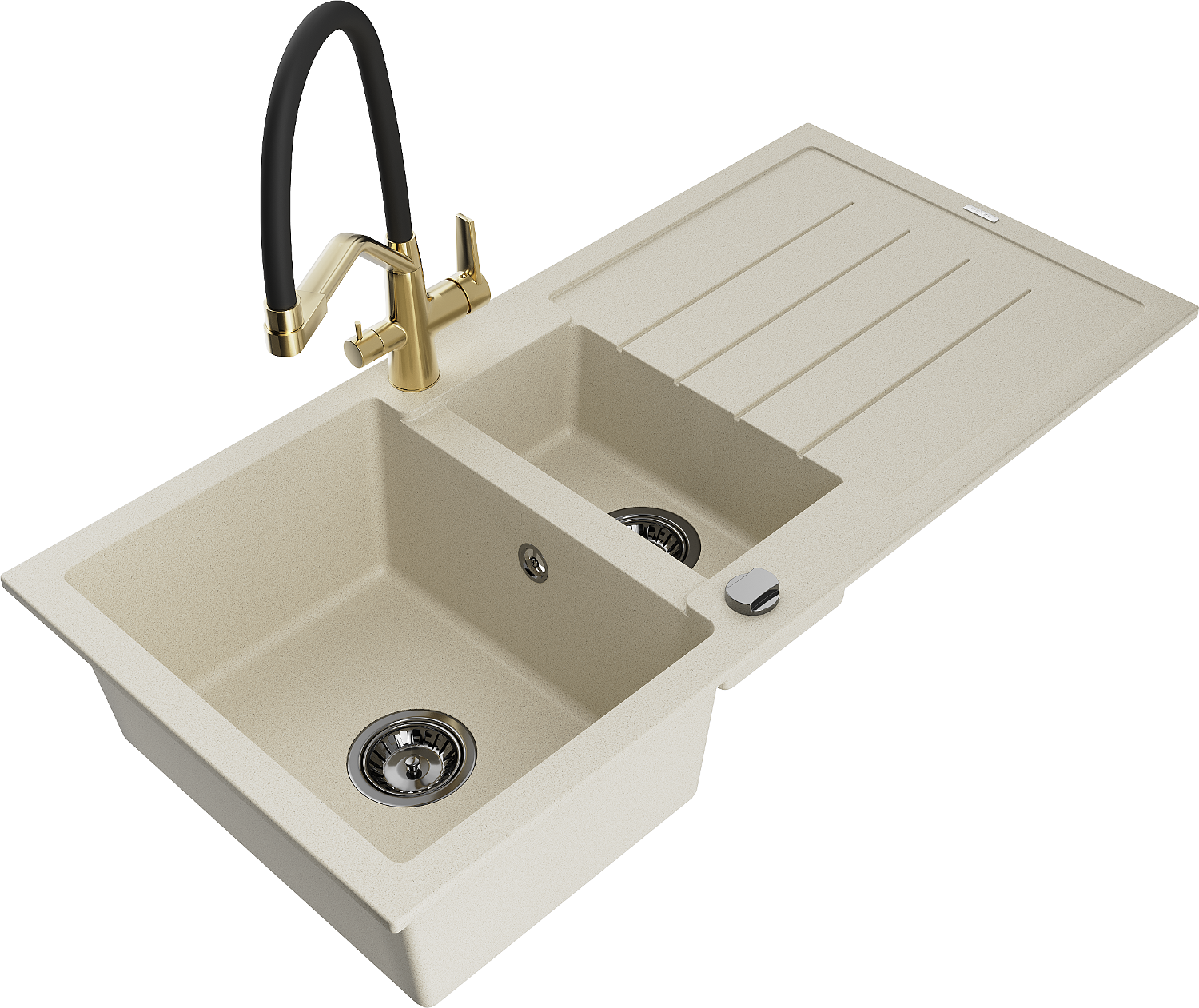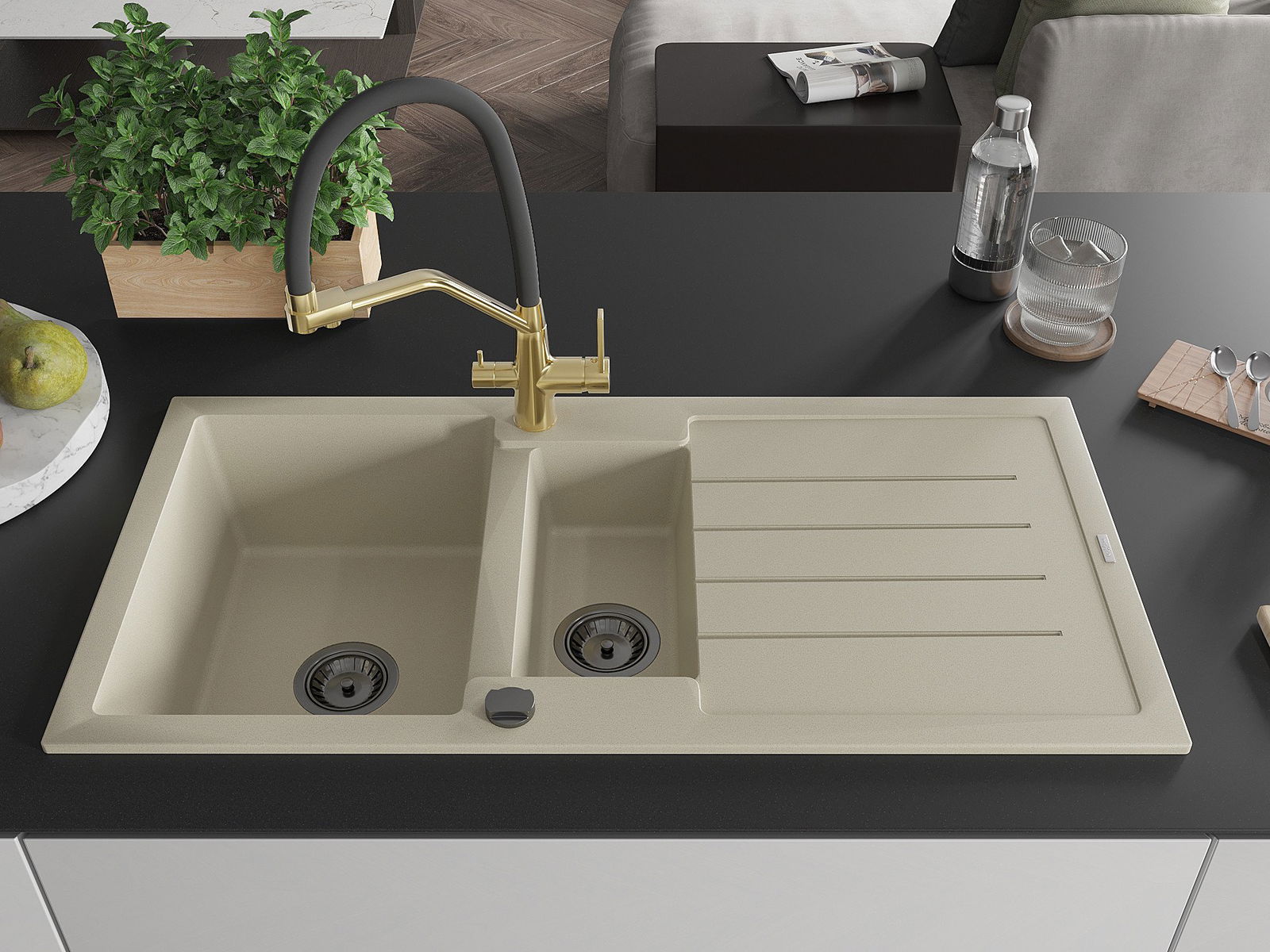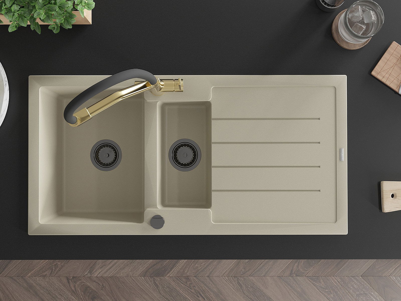 Mexen Andres zlewozmywak granitowy 1,5-komorowy z ociekaczem i baterią kuchenną Duo, beżowy - 6515-69-671701-57-B