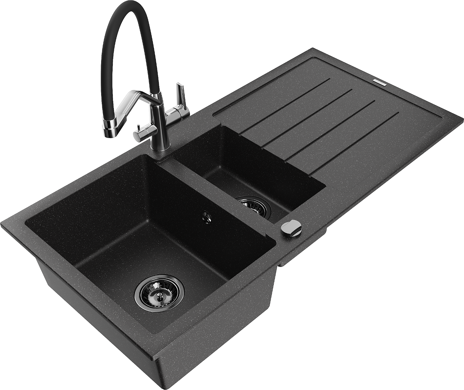 Mexen Andres zlewozmywak granitowy 1,5-komorowy z ociekaczem i baterią kuchenną Duo, czarny/srebrny - 6515-73-671701-07-B