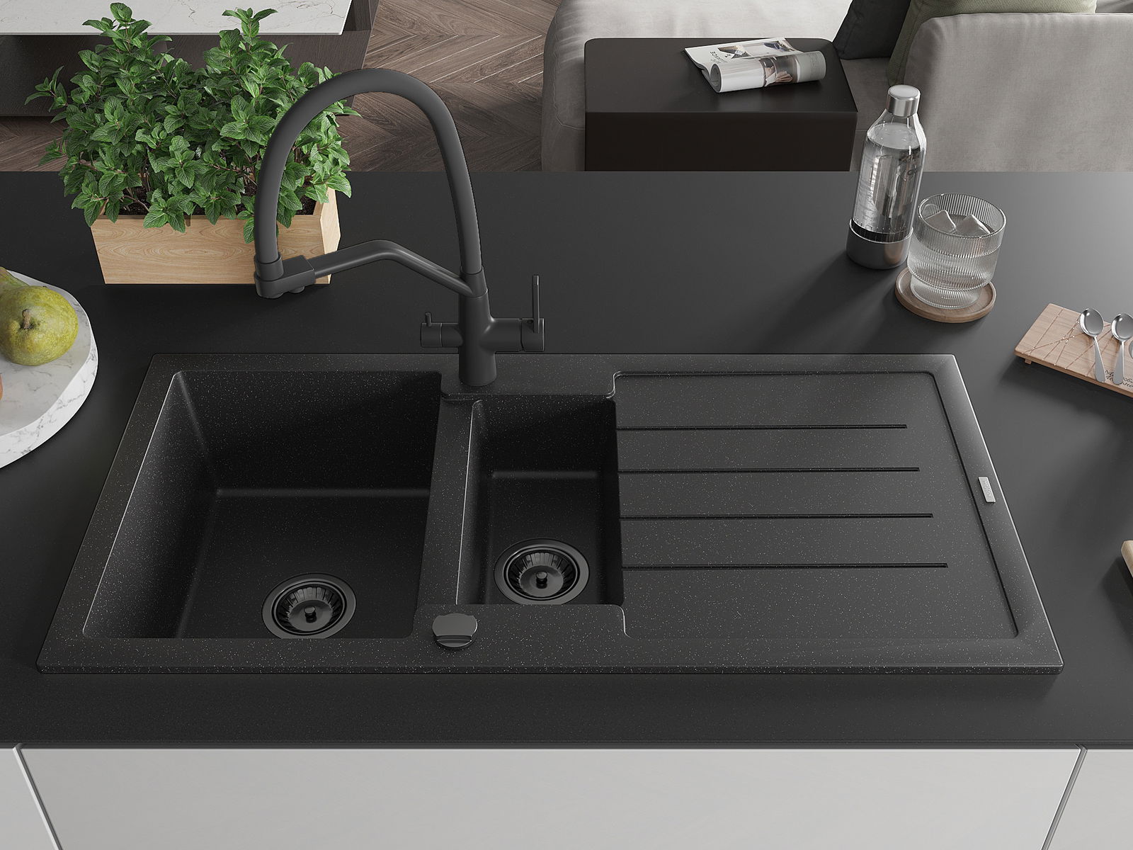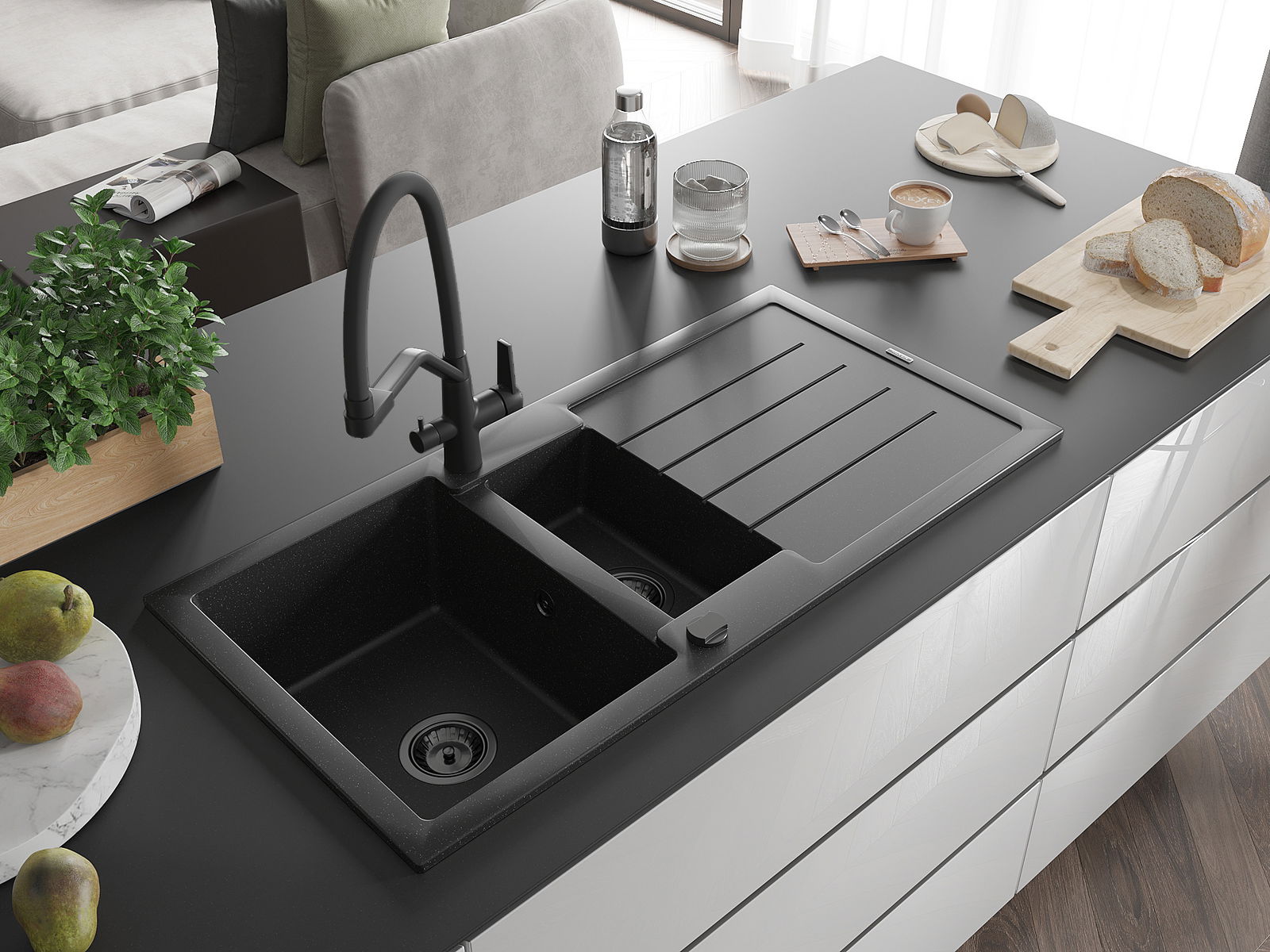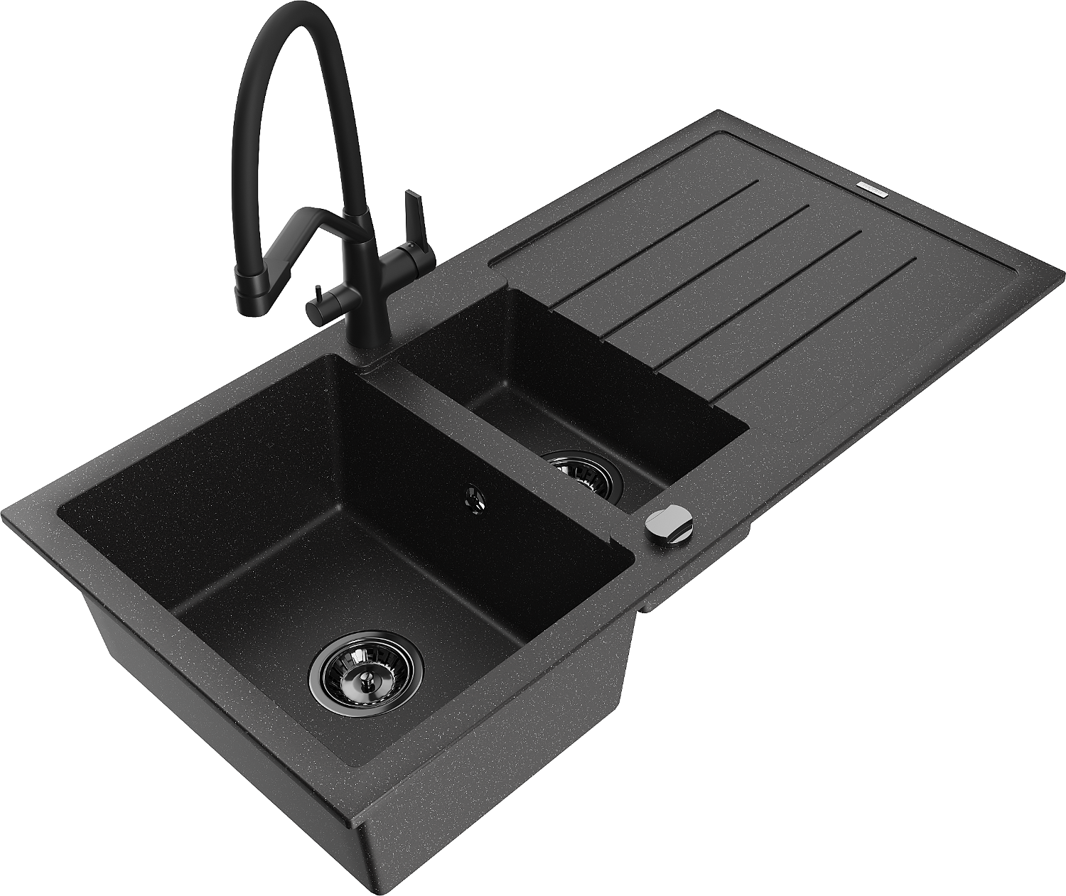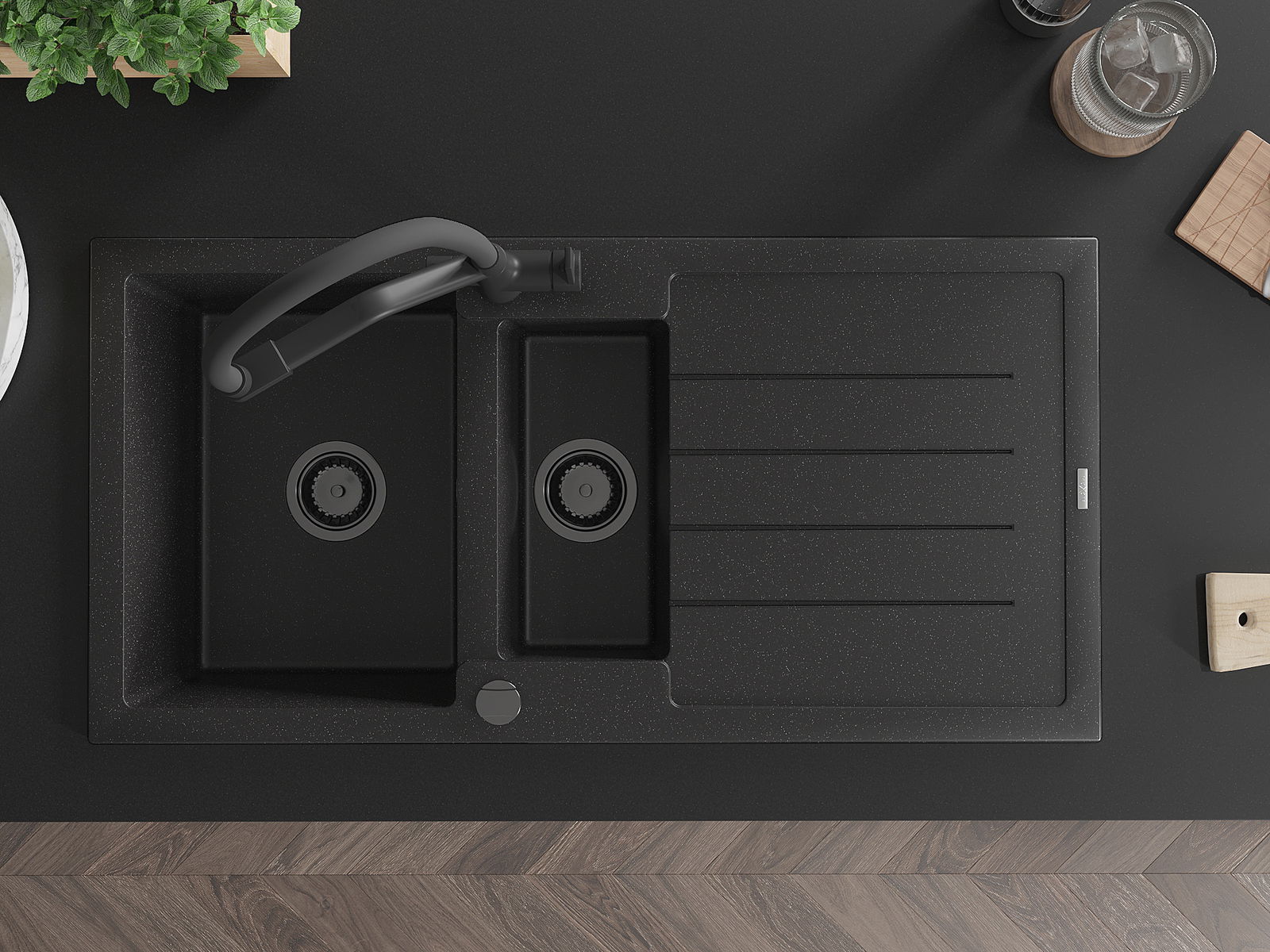 Mexen Andres zlewozmywak granitowy 1,5-komorowy z ociekaczem i baterią kuchenną Duo, czarny/srebrny - 6515-73-671701-70-B