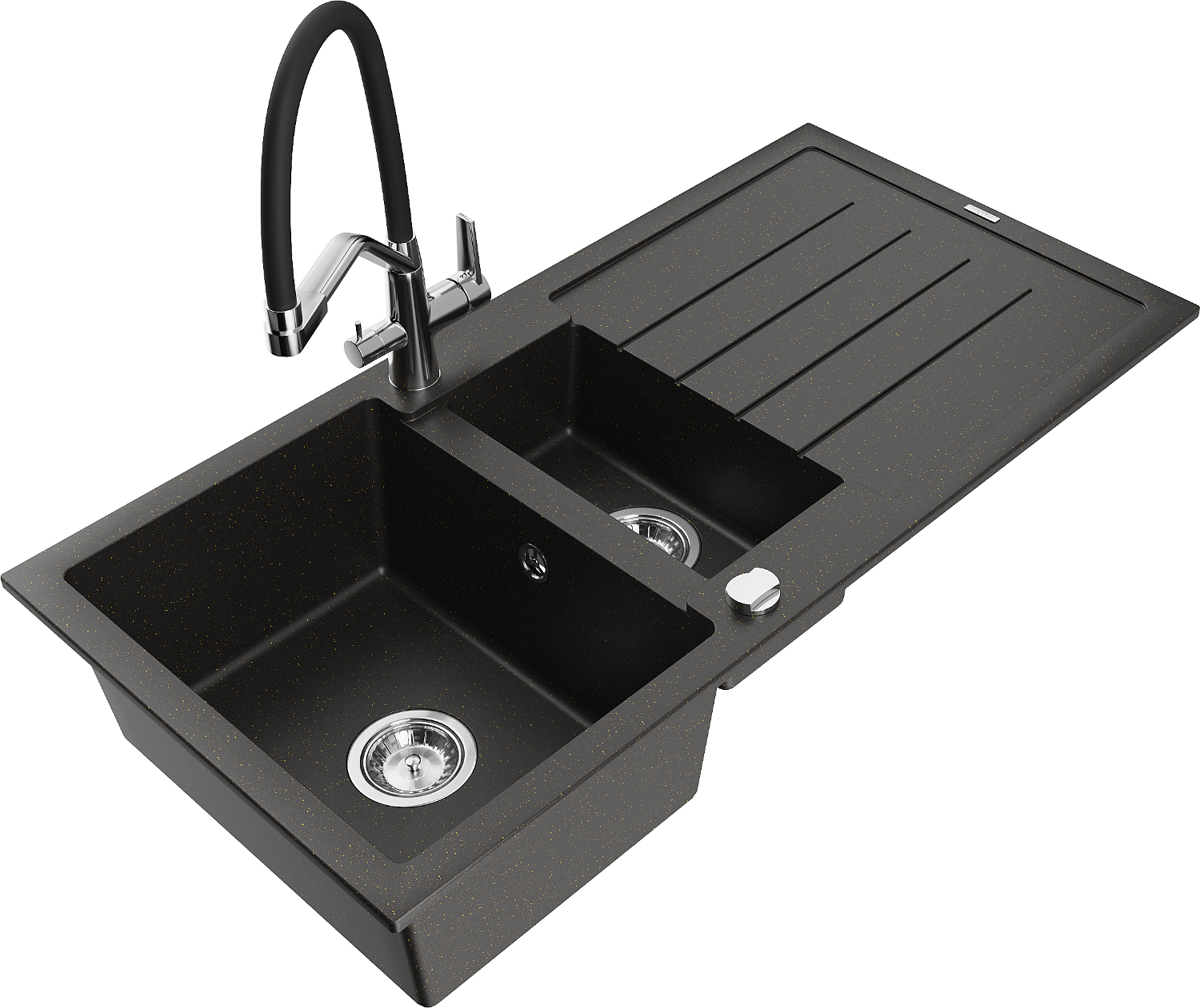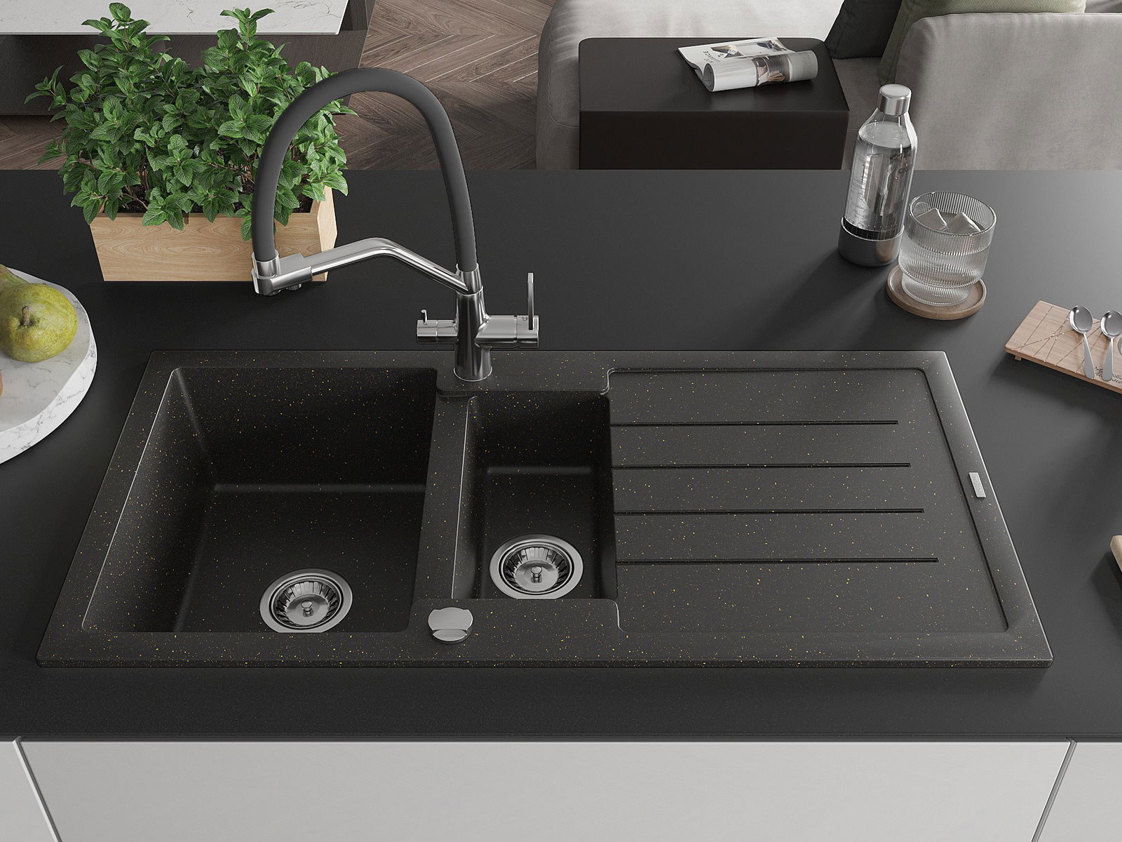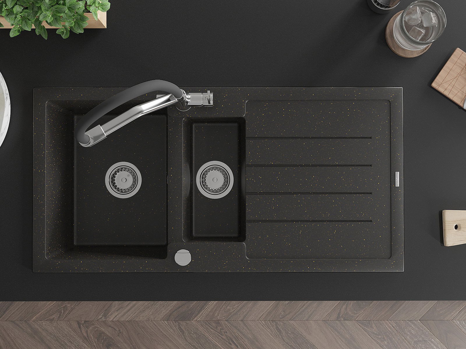 Mexen Andres zlewozmywak granitowy 1,5-komorowy z ociekaczem i baterią kuchenną Duo, czarny/złoty metalik - 6515-75-671701-07