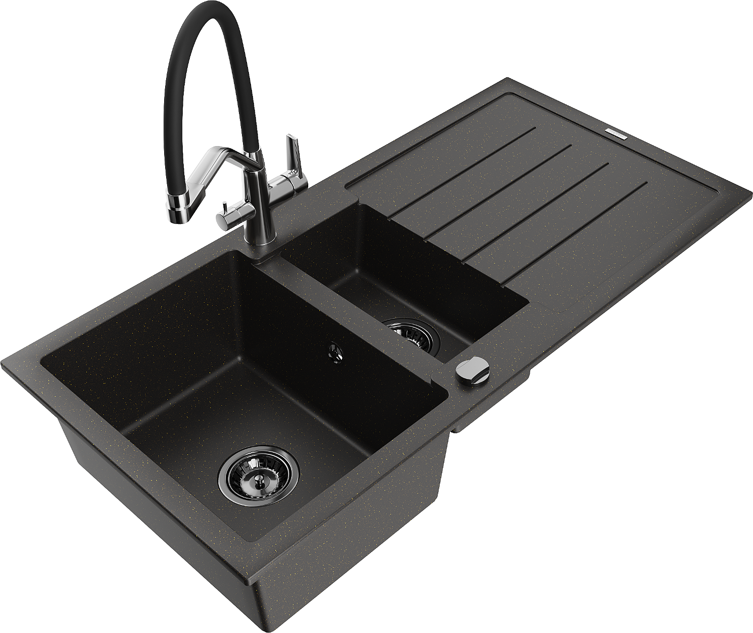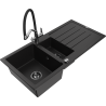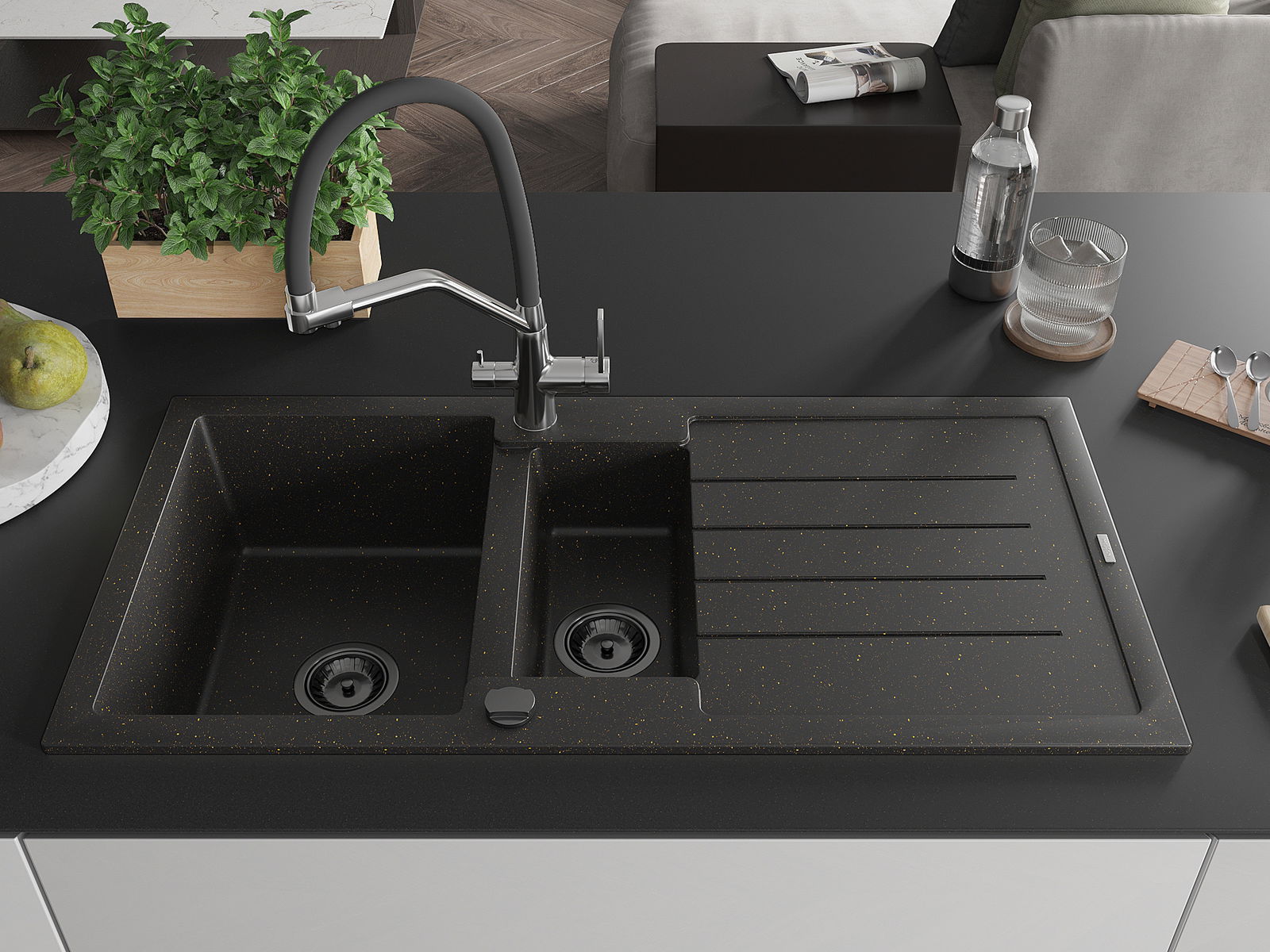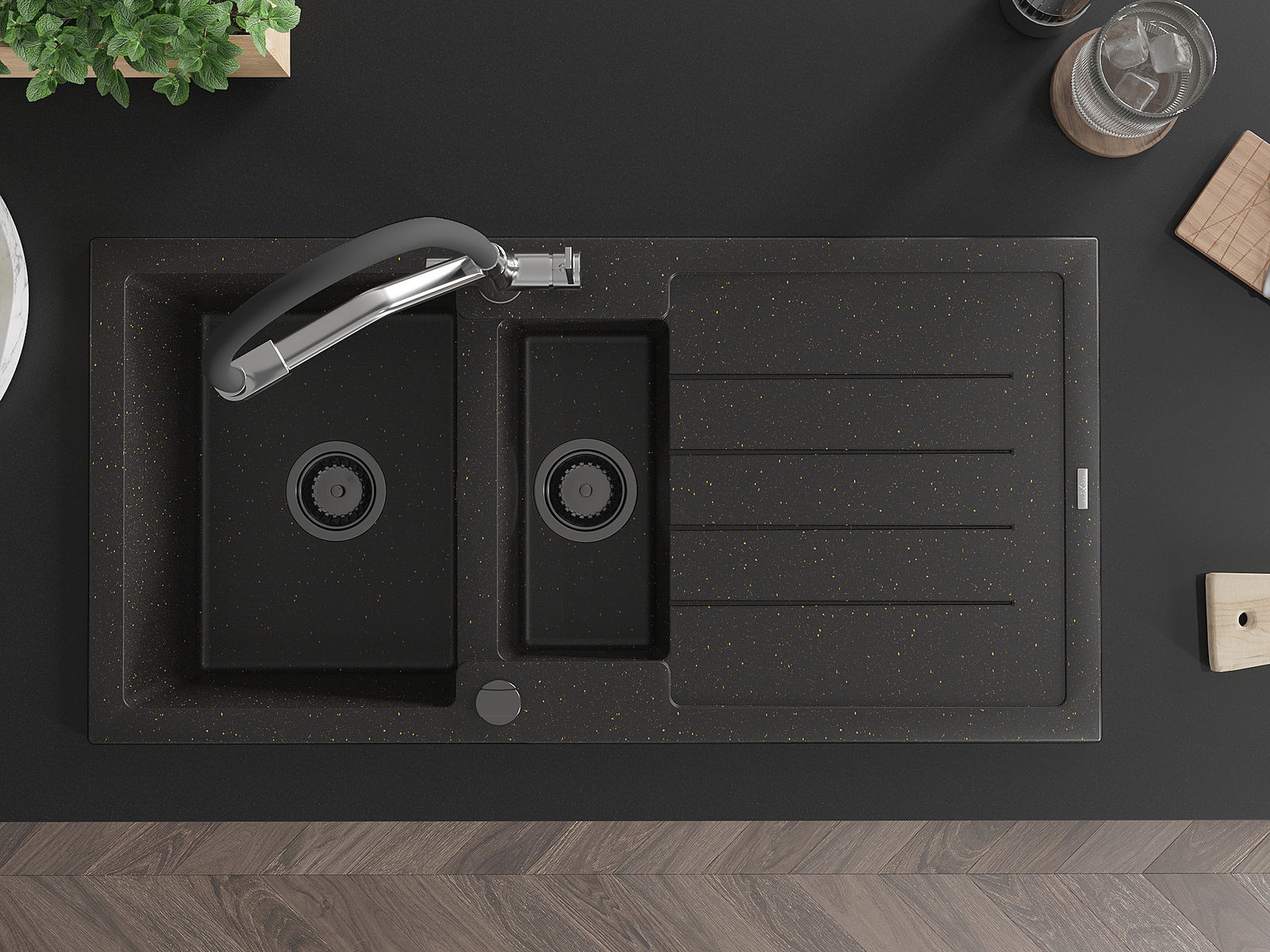 Mexen Andres zlewozmywak granitowy 1,5-komorowy z ociekaczem i baterią kuchenną Duo, czarny/złoty metalik - 6515-75-671701-07-B