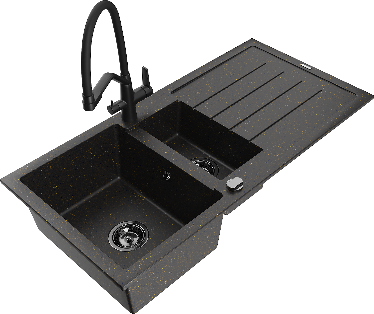 Mexen Andres zlewozmywak granitowy 1,5-komorowy z ociekaczem i baterią kuchenną Duo, czarny/złoty metalik - 6515-75-671701-70-B