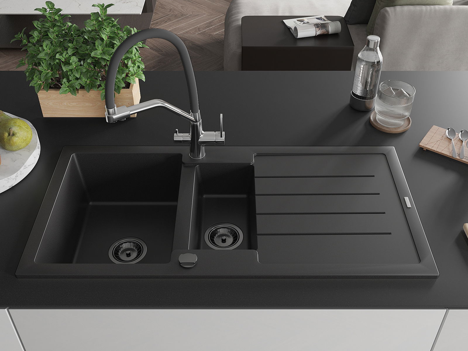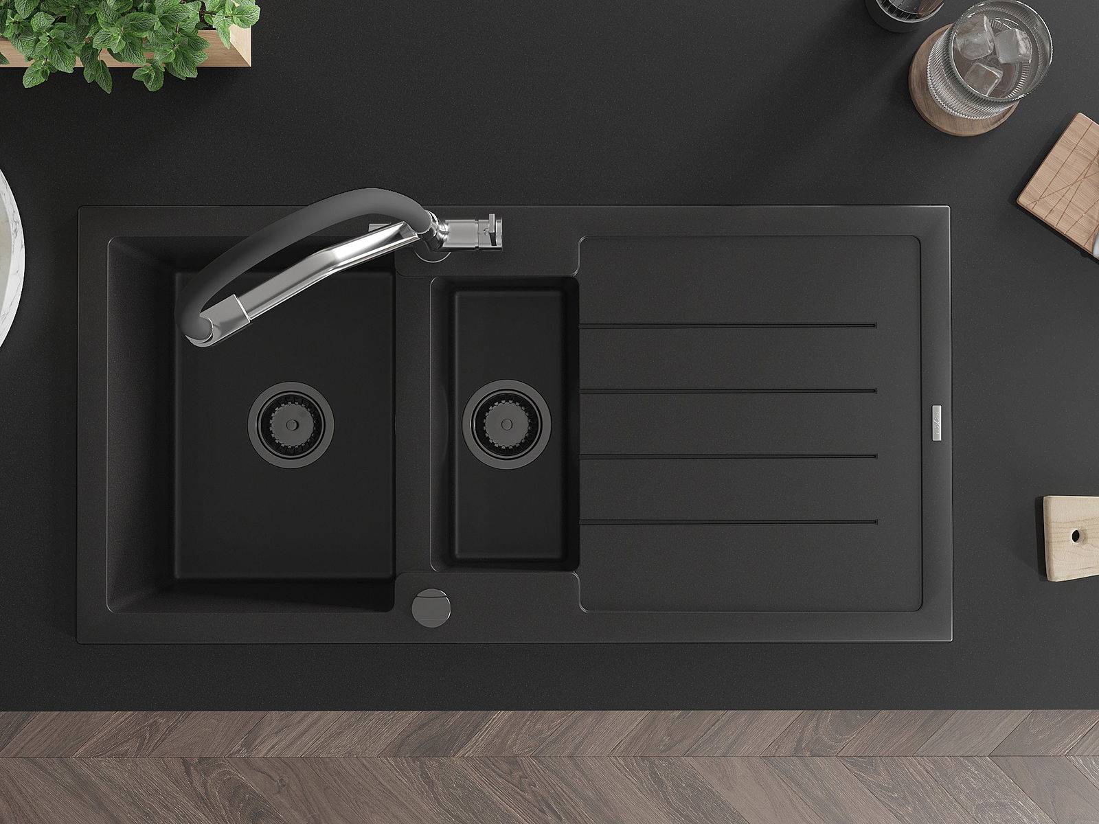 Mexen Andres zlewozmywak granitowy 1,5-komorowy z ociekaczem i baterią kuchenną Duo, czarny - 6515-77-671701-07-B