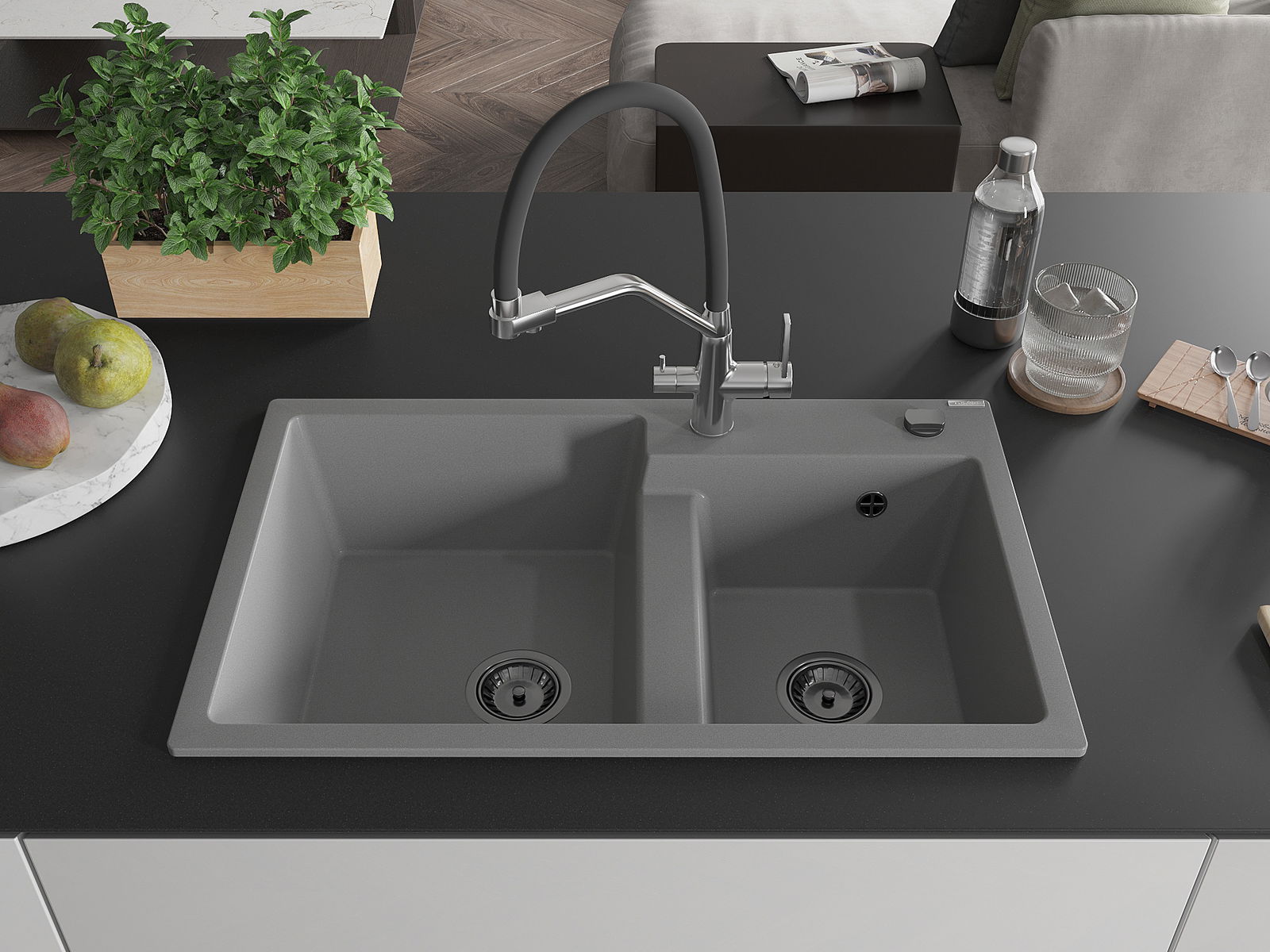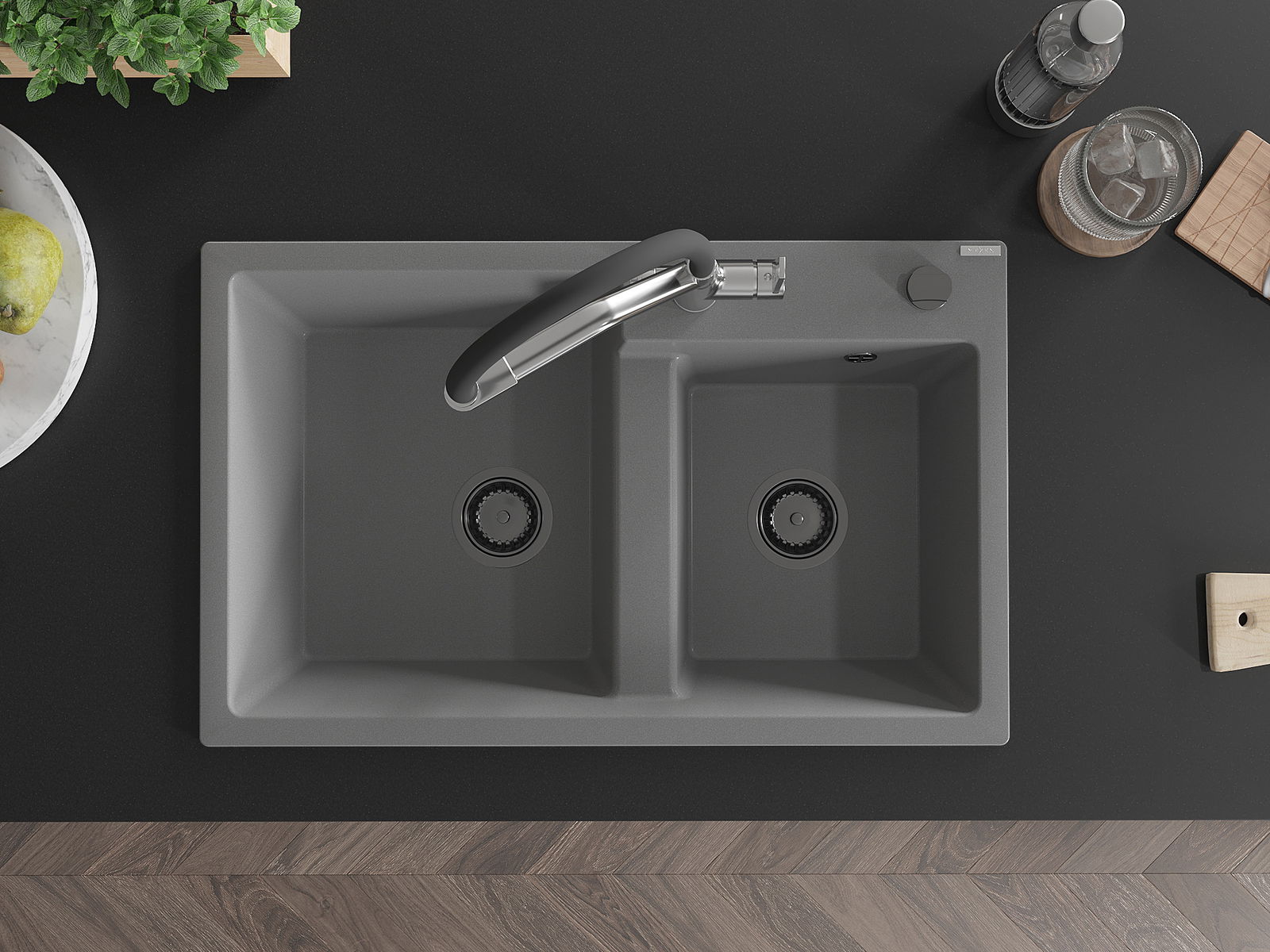Mexen Tomas zlewozmywak granitowy 2-komorowy z baterią kuchenną Duo, szary - 6516-71-671701-07-B