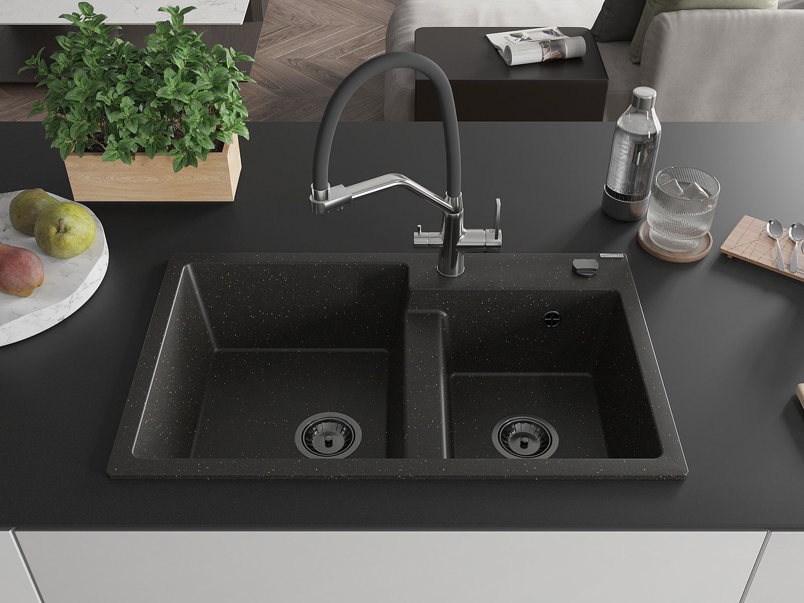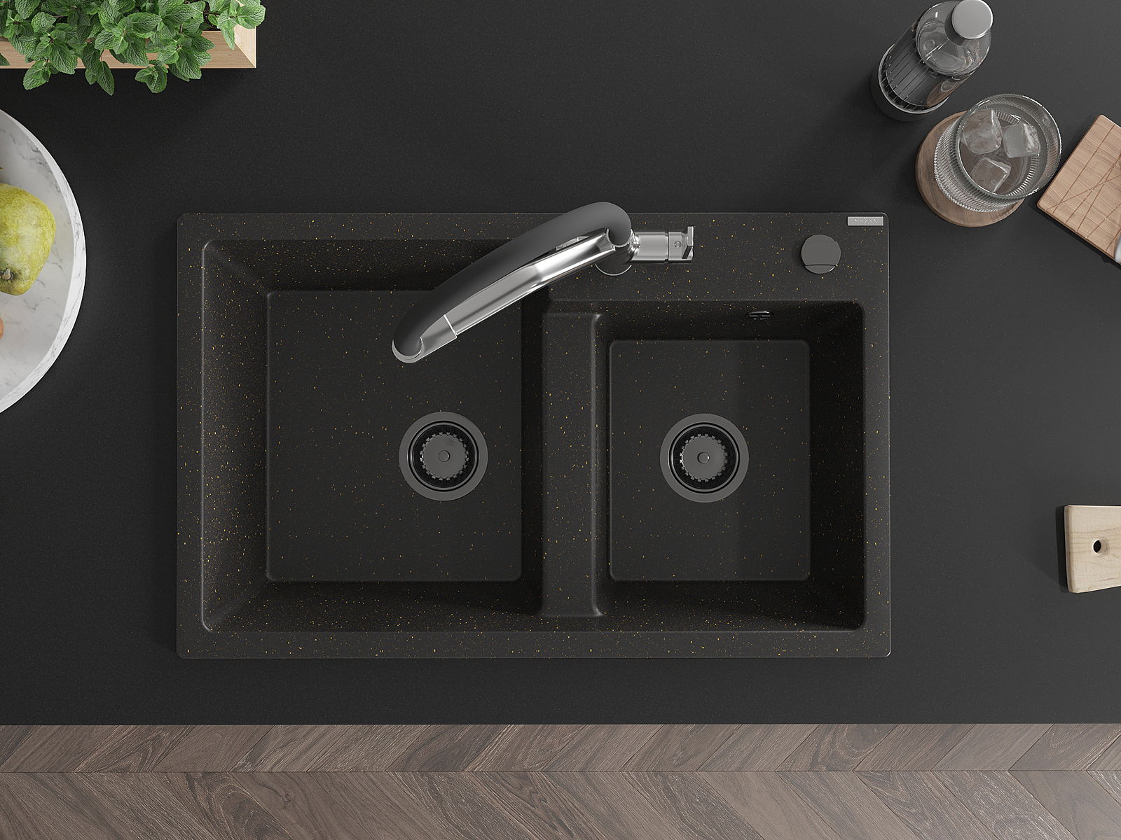 Mexen Tomas zlewozmywak granitowy 2-komorowy z baterią kuchenną Duo, czarny/złoty metalik - 6516-75-671701-07-B
