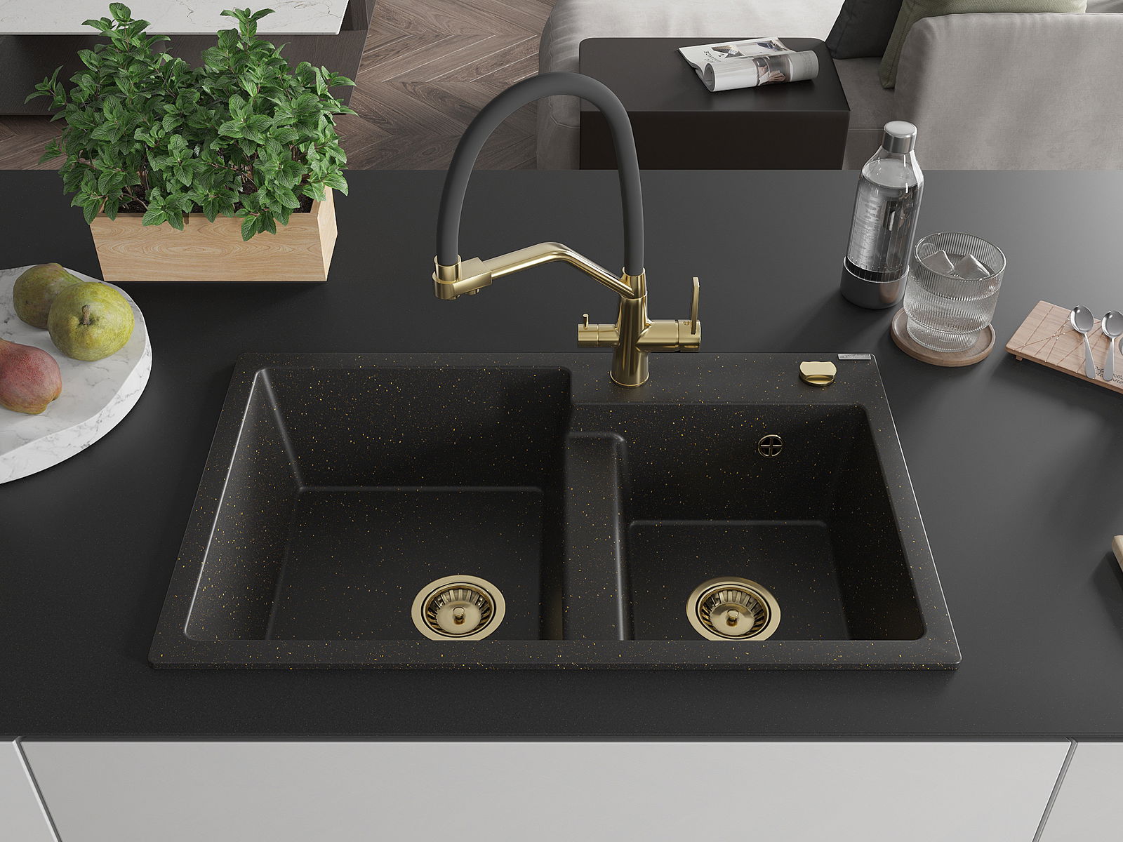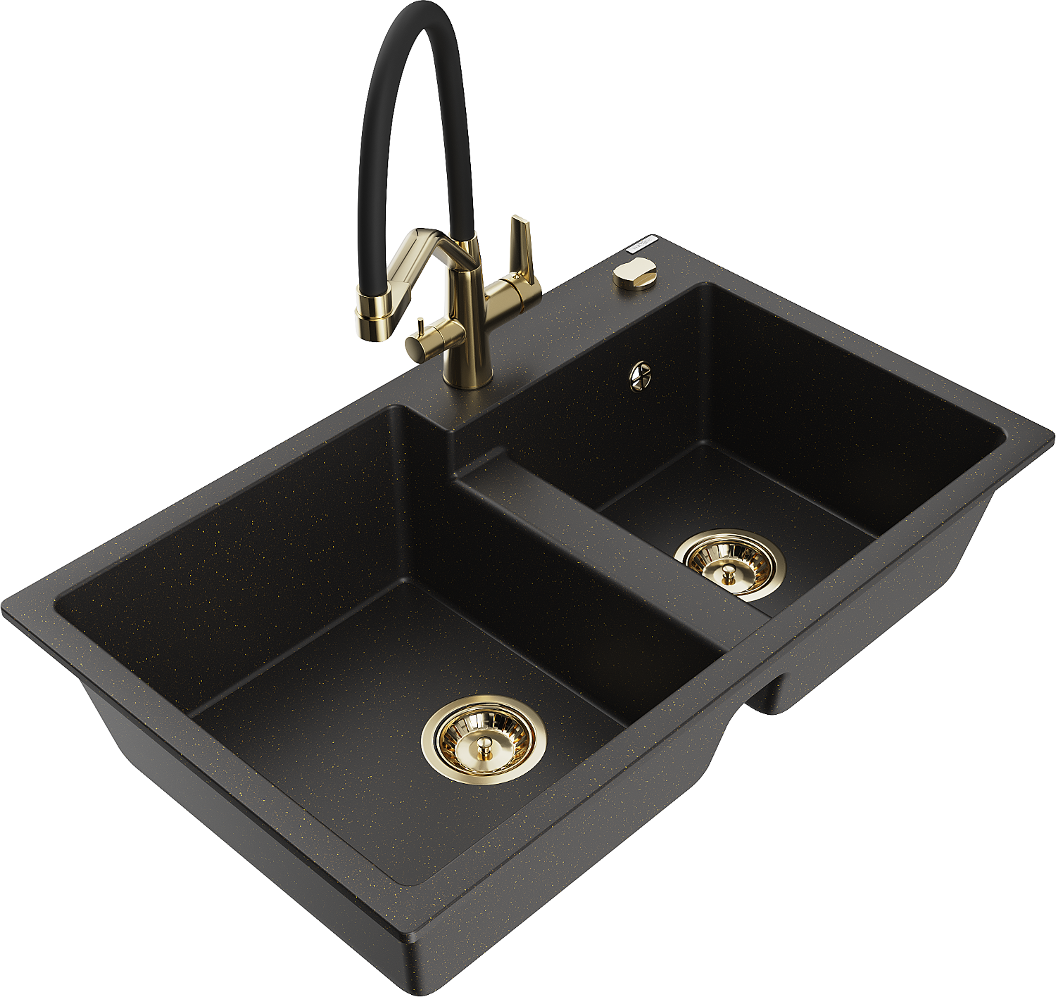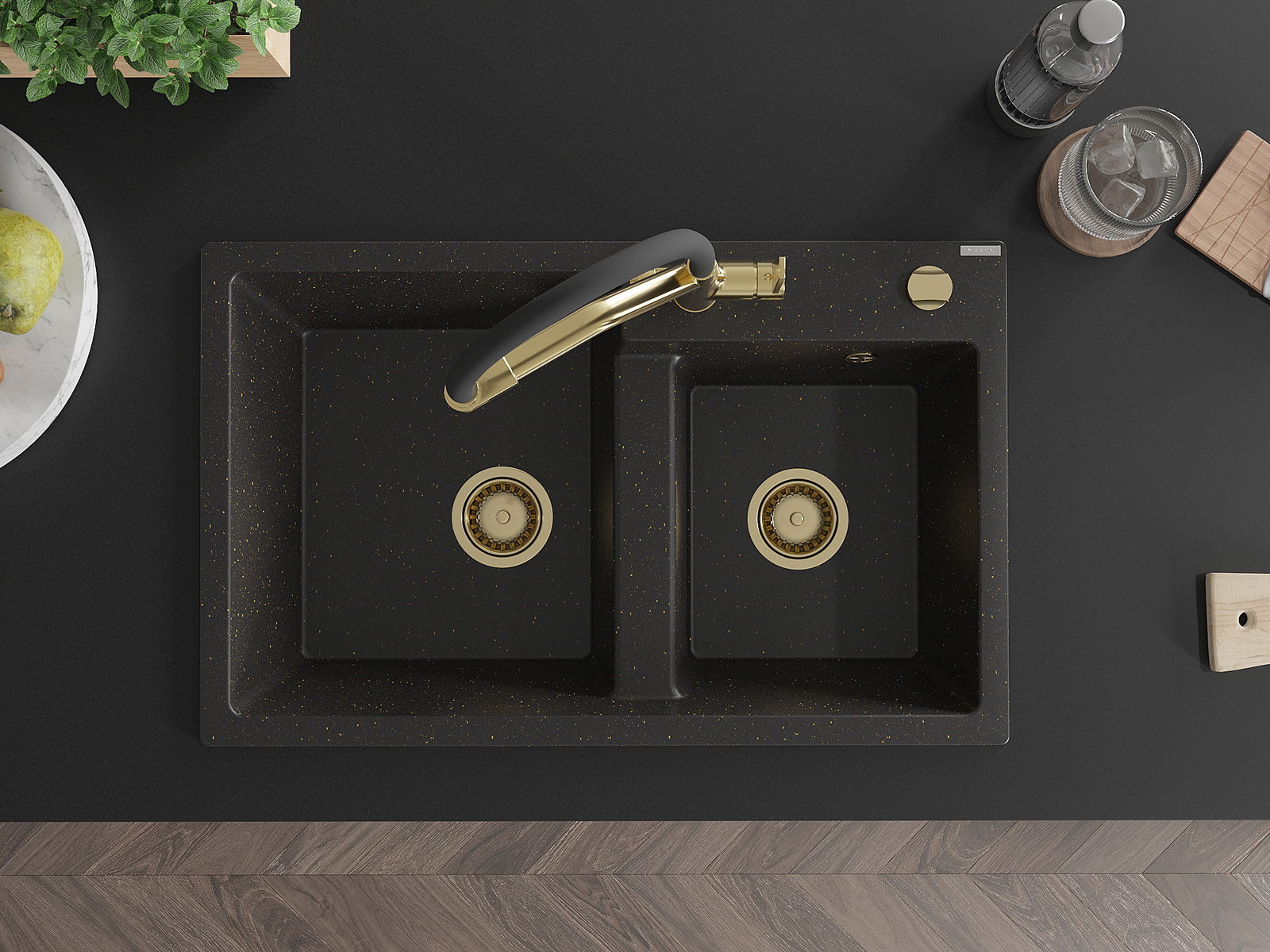 Mexen Tomas zlewozmywak granitowy 2-komorowy z baterią kuchenną Duo, czarny/złoty metalik - 6516-75-671701-57-G