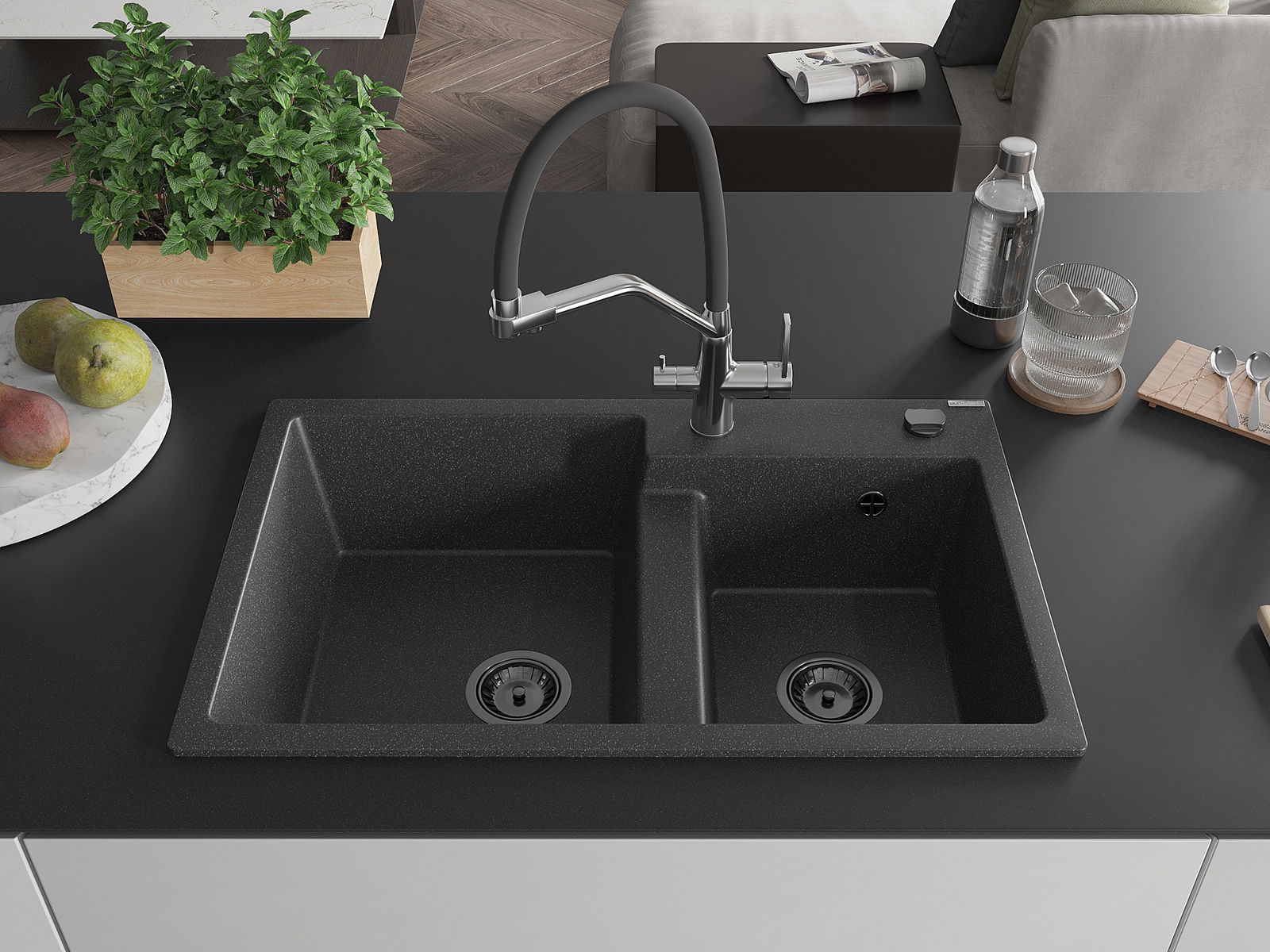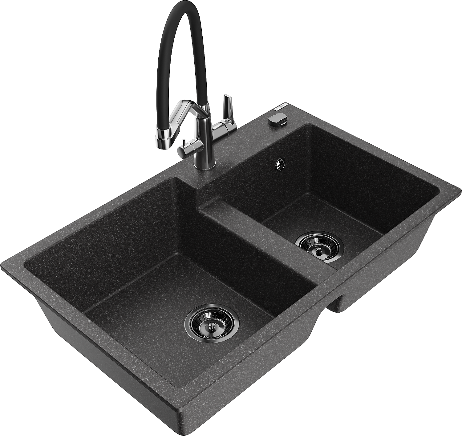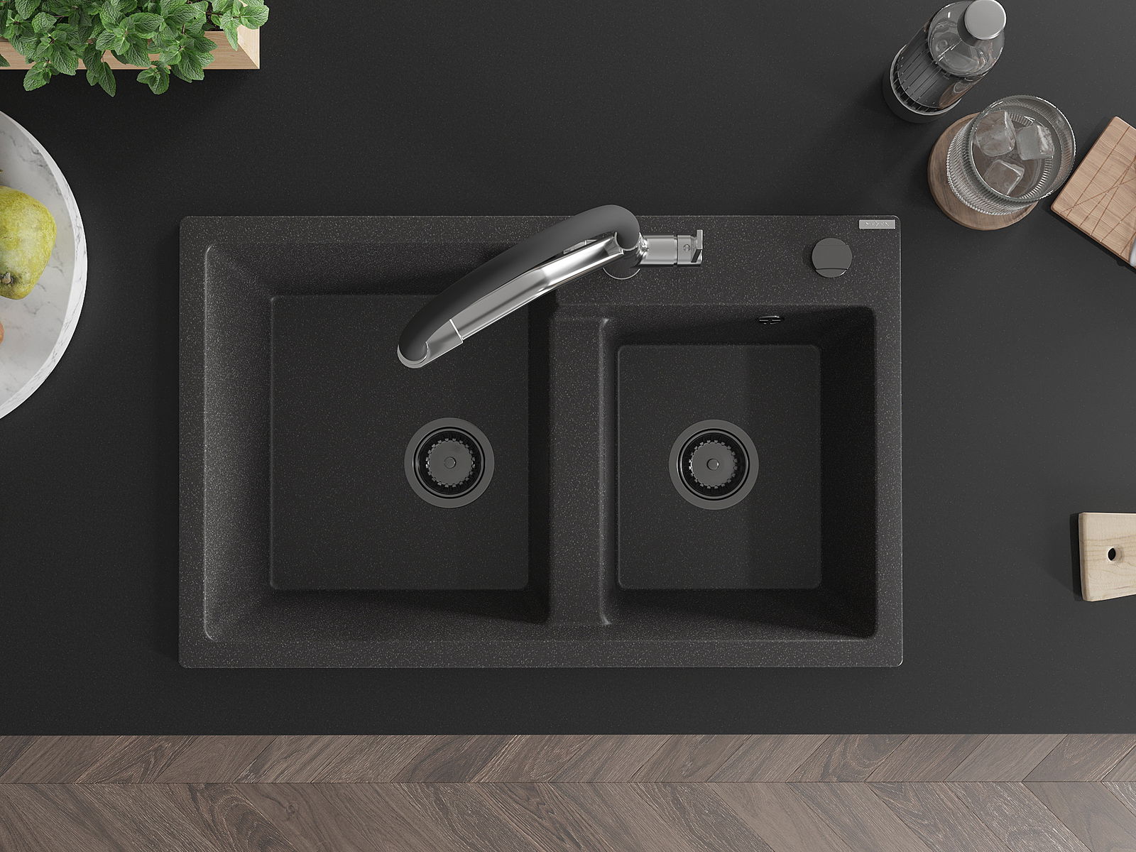 Mexen Tomas zlewozmywak granitowy 2-komorowy z baterią kuchenną Duo, czarny nakrapiany - 6516-76-671701-07-B