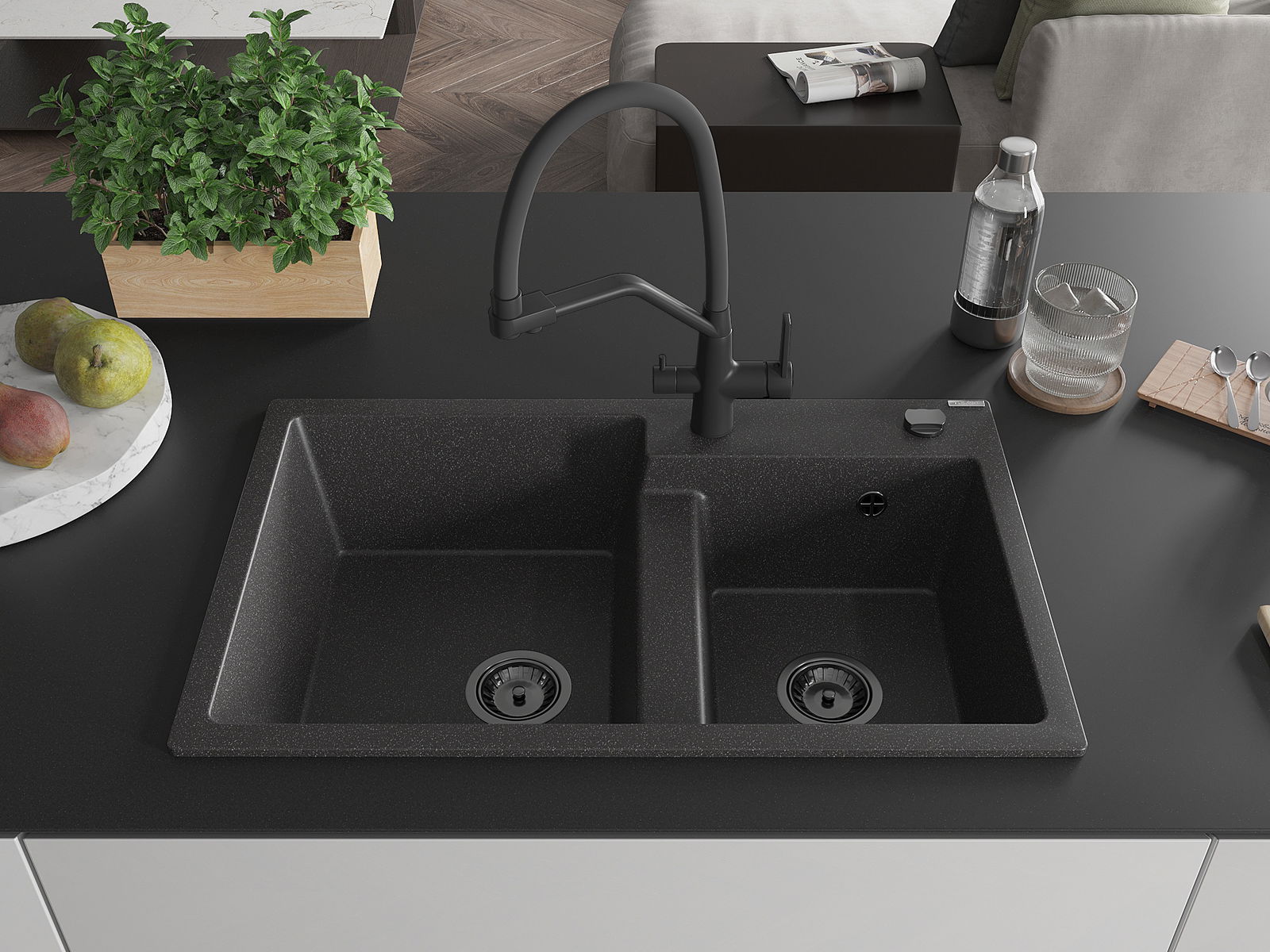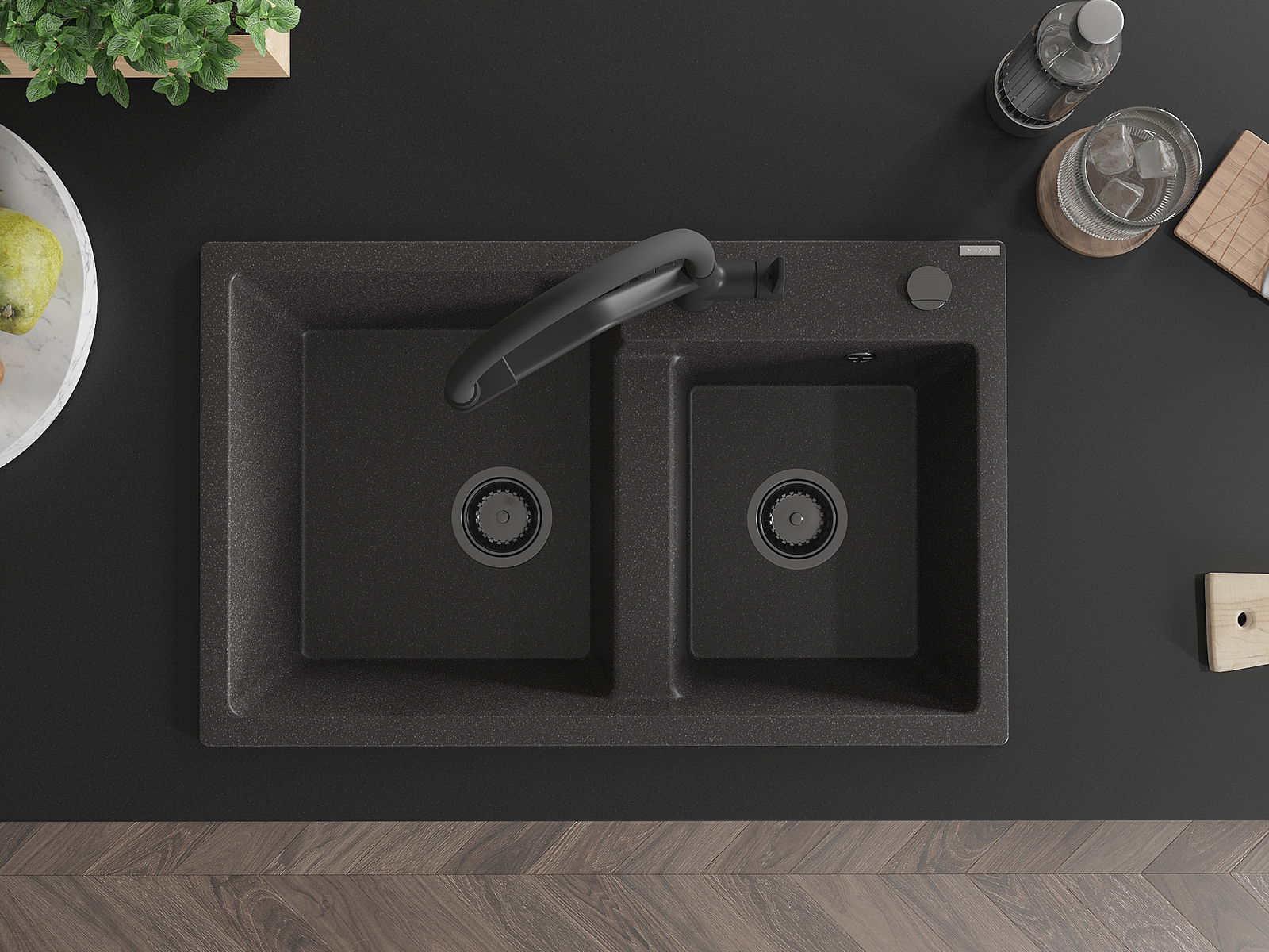 Mexen Tomas zlewozmywak granitowy 2-komorowy z baterią kuchenną Duo, czarny nakrapiany - 6516-76-671701-70-B