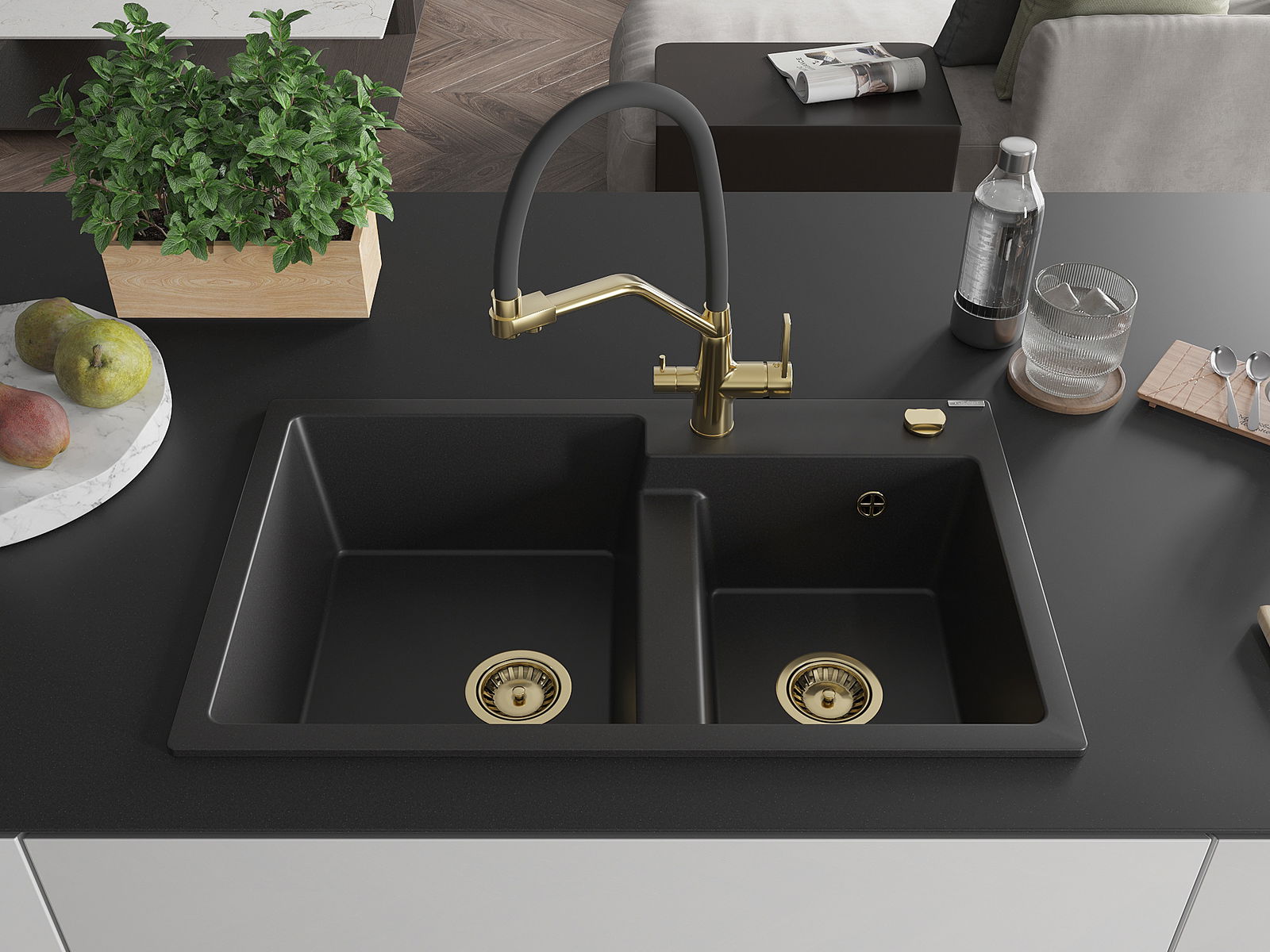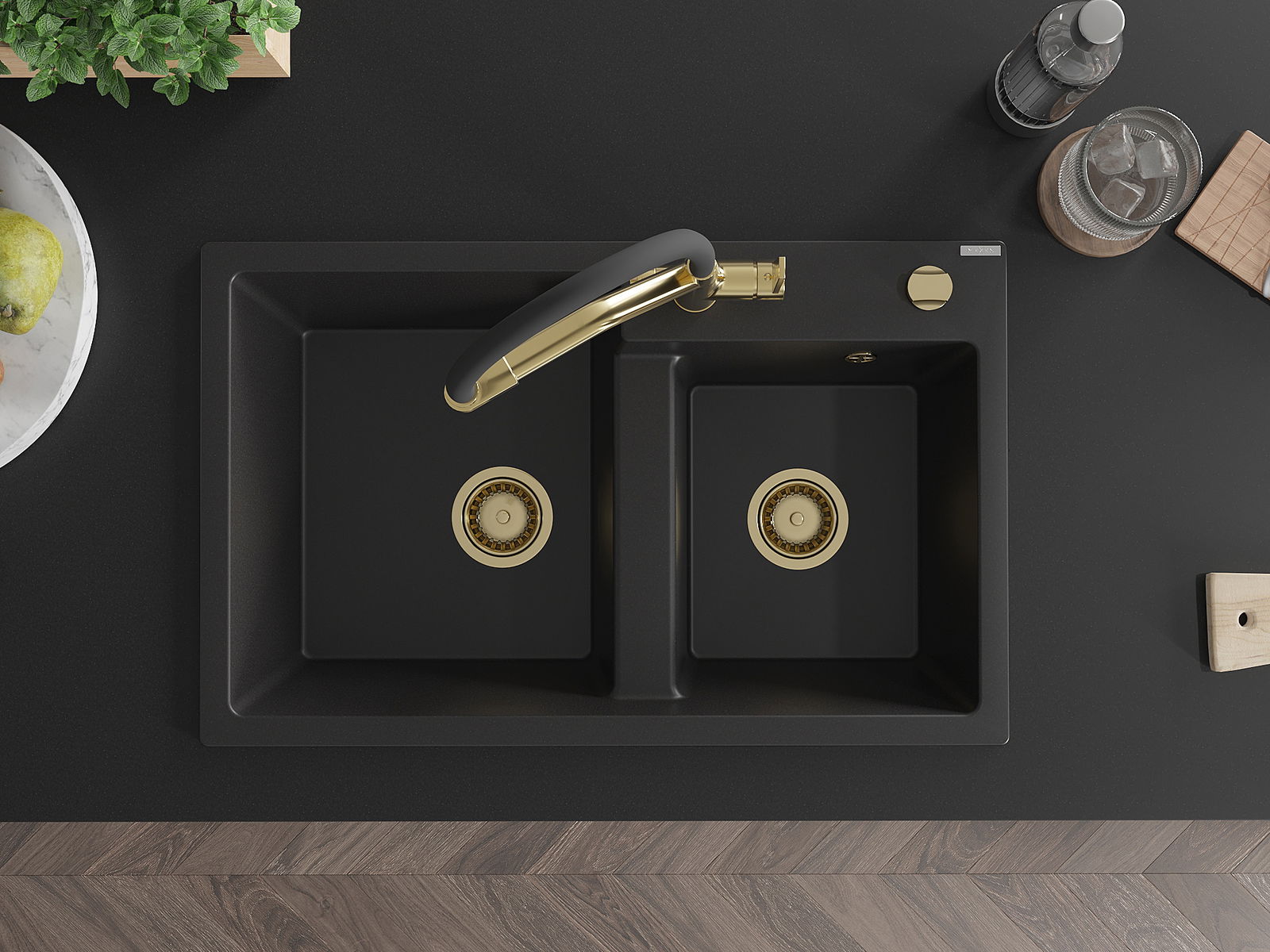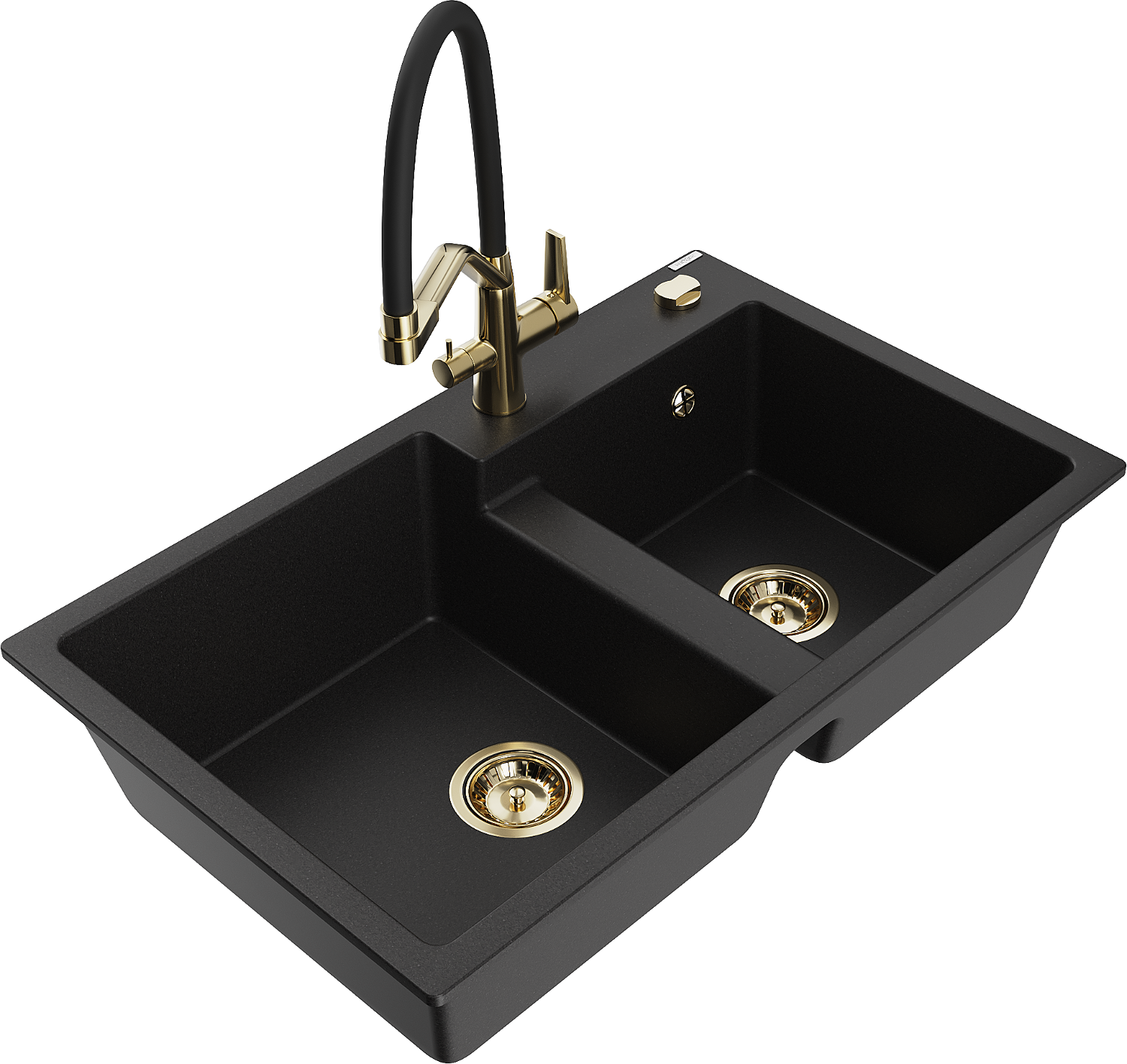 Mexen Tomas zlewozmywak granitowy 2-komorowy z baterią kuchenną Duo, czarny - 6516-77-671701-57-G