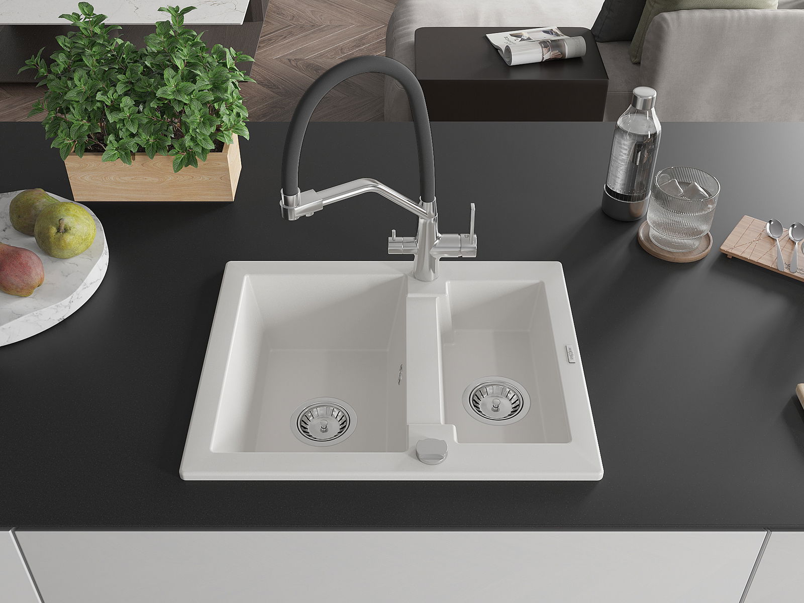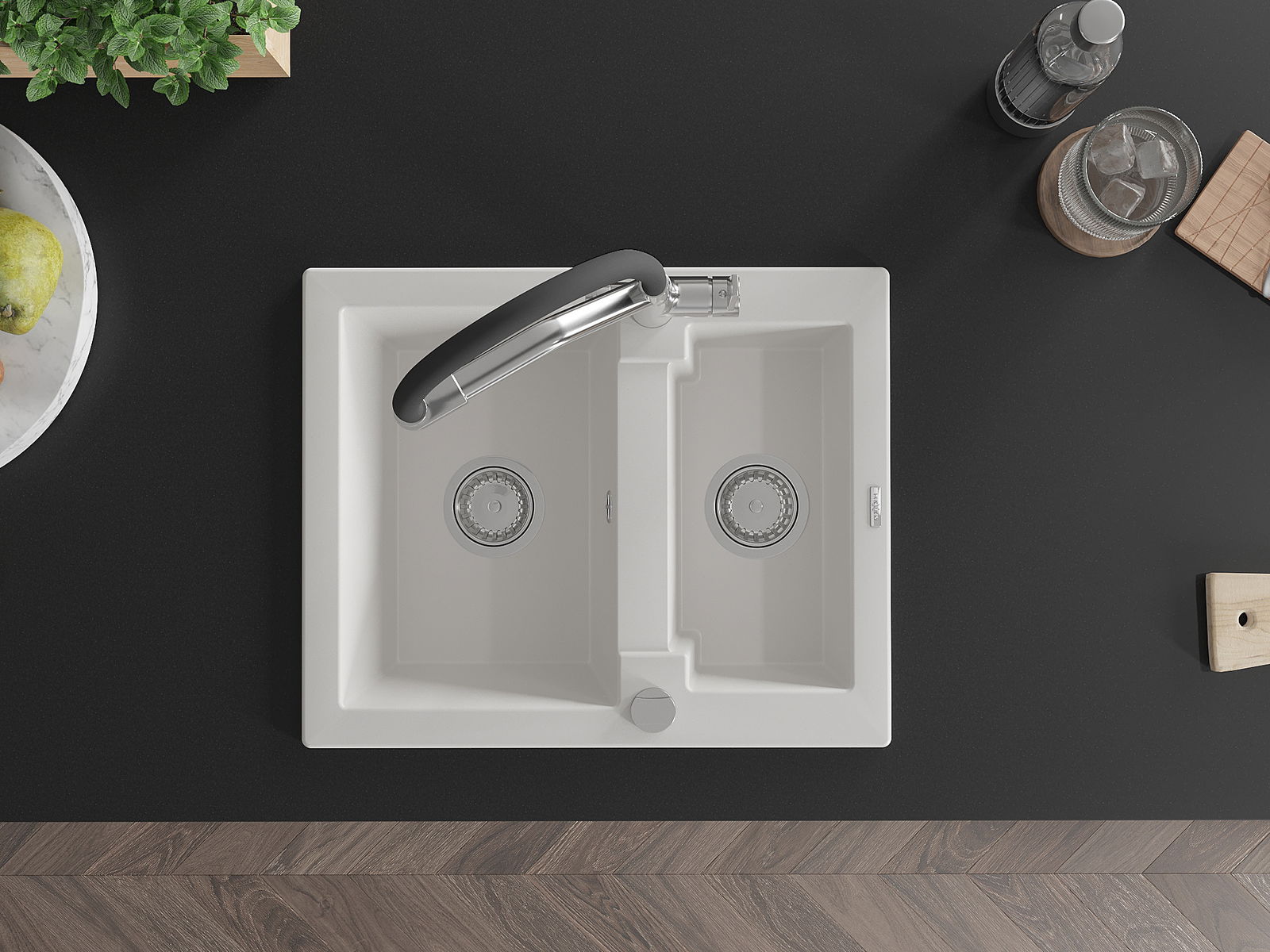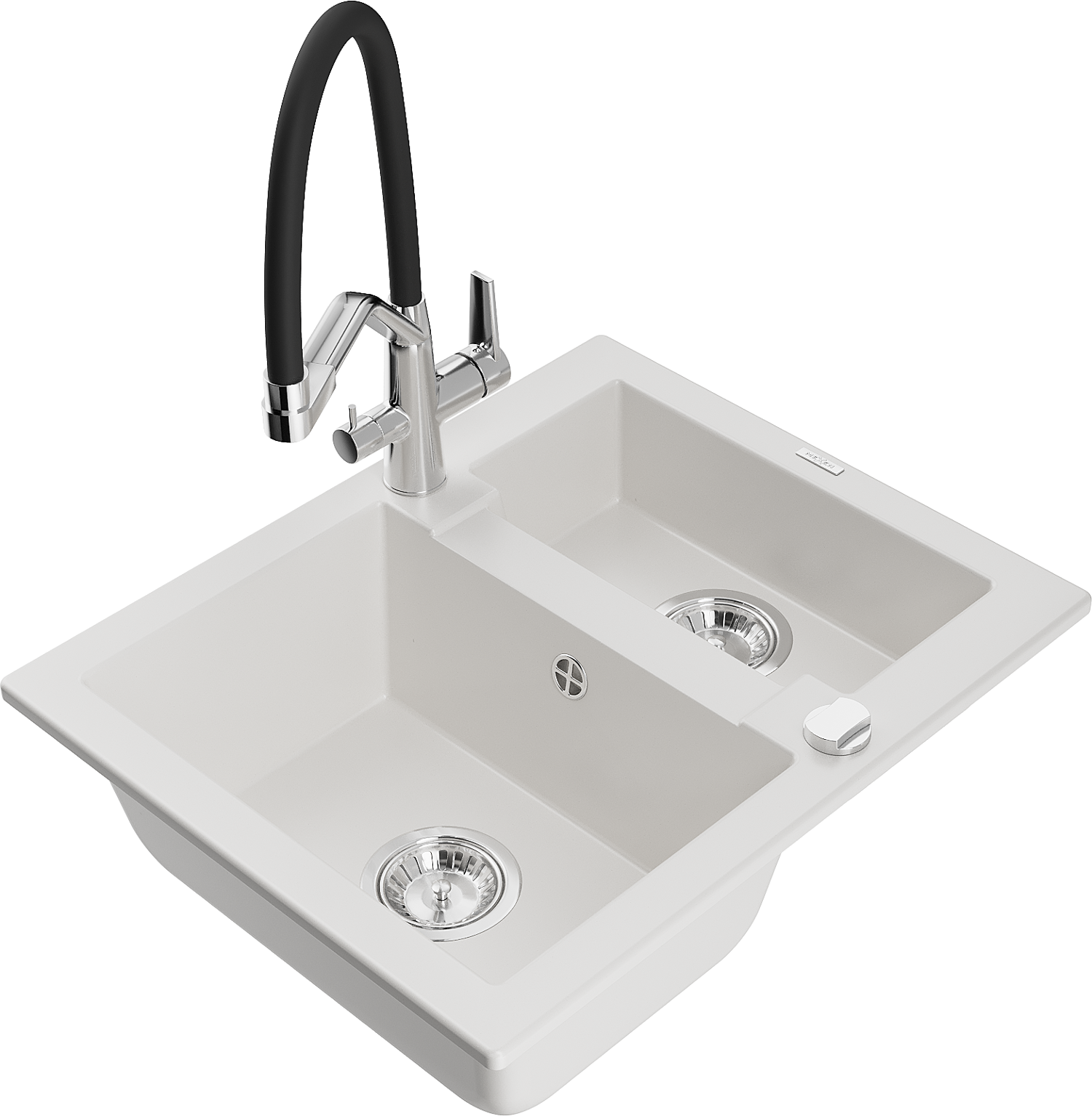 Mexen Carlos zlewozmywak granitowy 1,5-komorowy z baterią kuchenną Duo, biały - 6518-20-671701-07