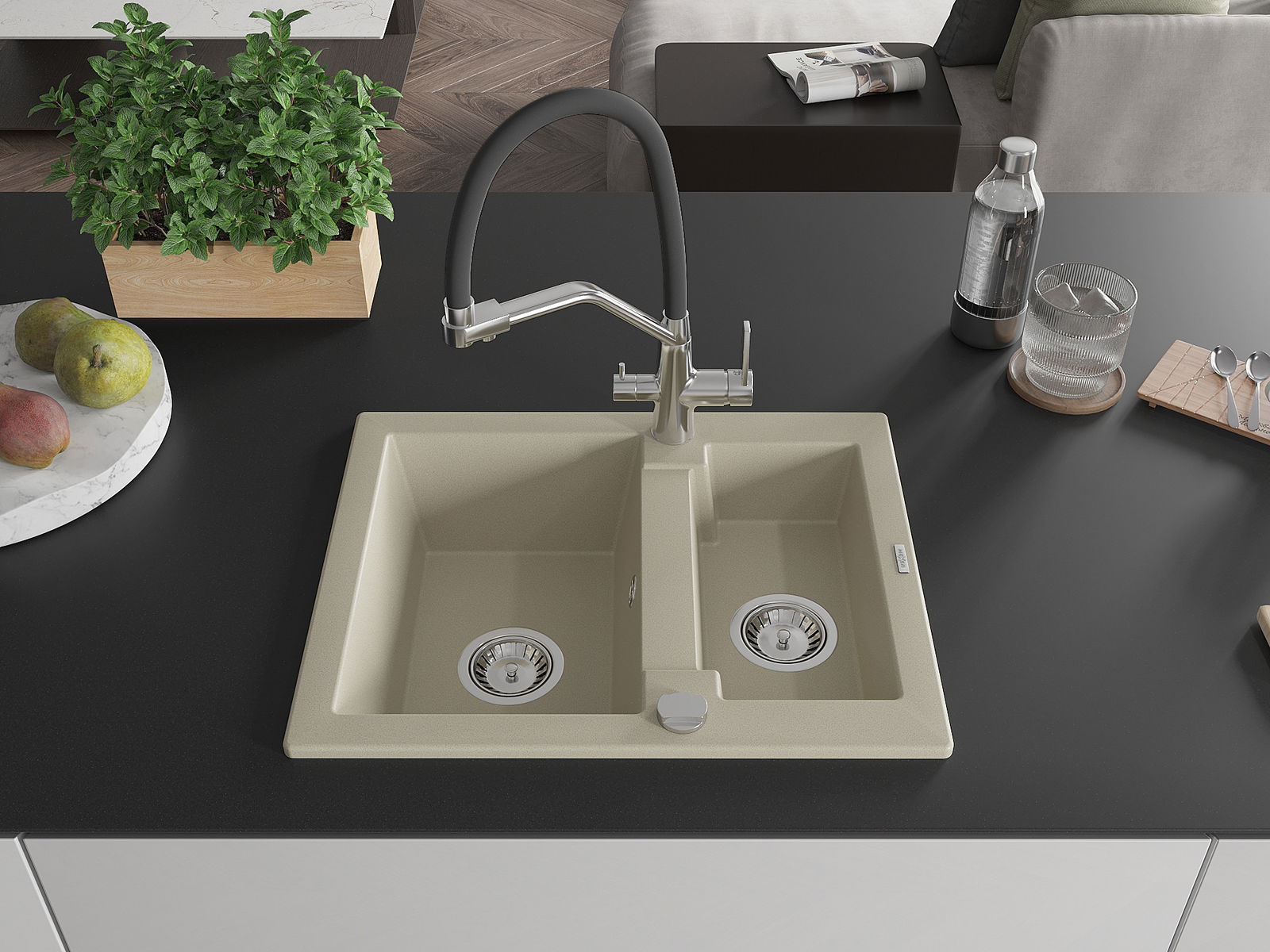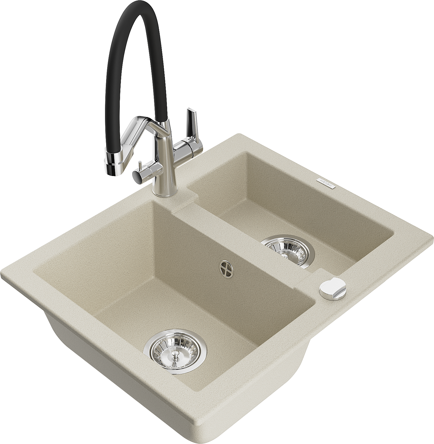 Mexen Carlos zlewozmywak granitowy 1,5-komorowy z baterią kuchenną Duo, beżowy - 6518-69-671701-07