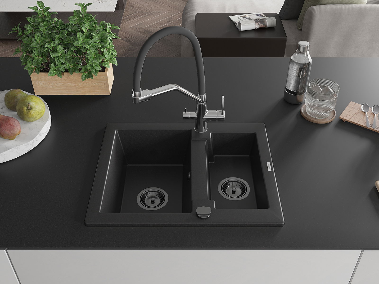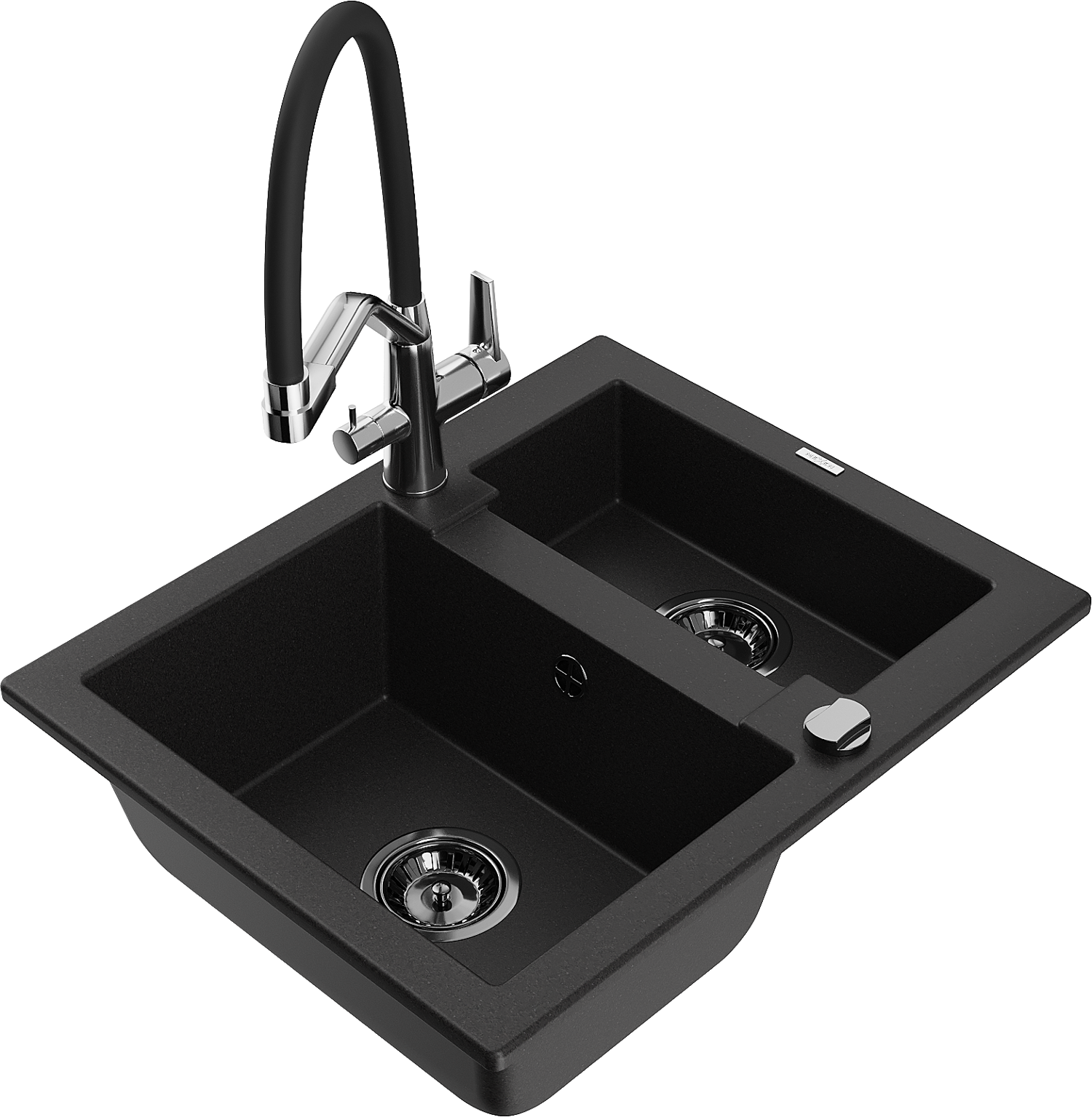 Mexen Carlos zlewozmywak granitowy 1,5-komorowy z baterią kuchenną Duo, czarny - 6518-77-671701-07-B