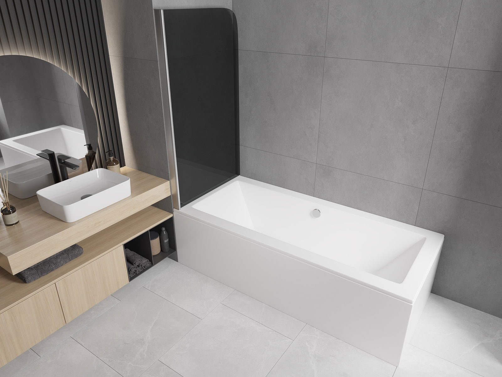 Parawan posiada jedno ruchome skrzydło z możliwością złożenia. Takie rozwiązanie pozwala zaoszczędzić więcej miejsca w łazience i umożliwia swobodne korzystanie z pozostałej przestrzeni, gdy nie korzystamy ze strefy kąpielowej.