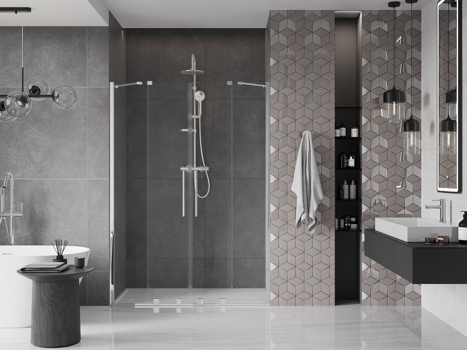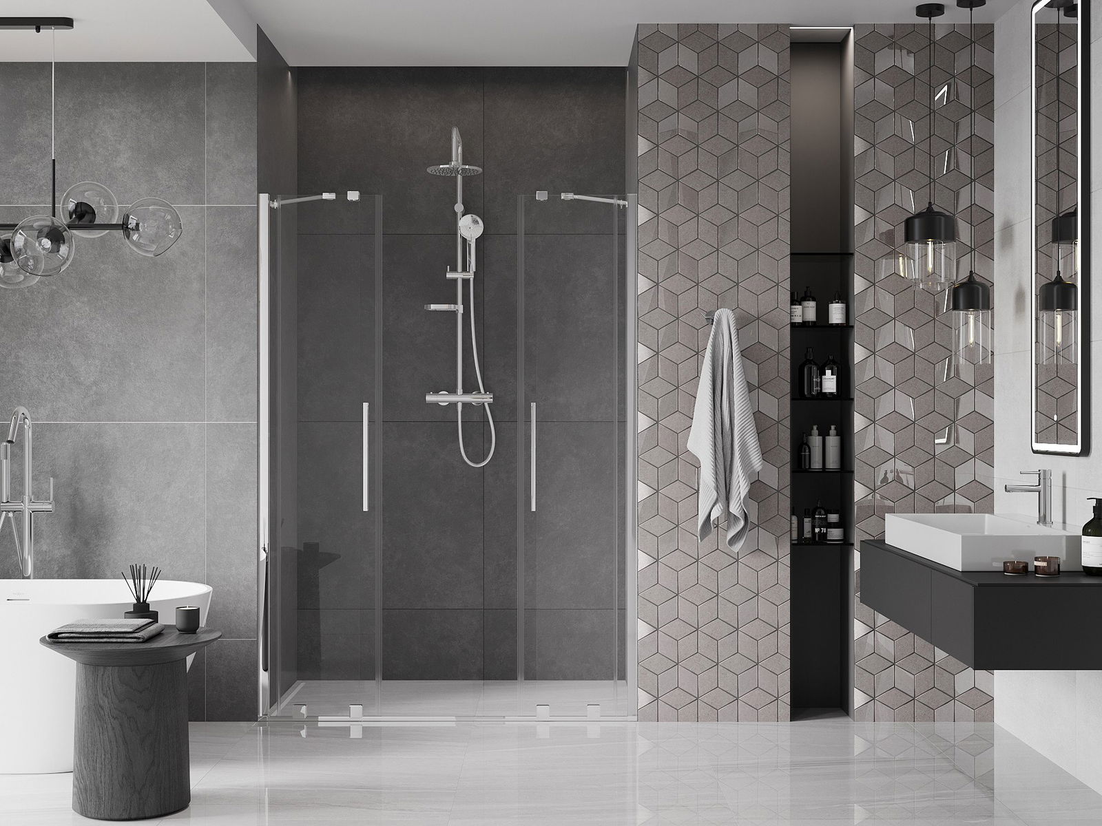 Dzięki zastosowaniu uniwersalnego systemu mocowania, drzwi prysznicowe mogą zostać zamontowane z prawej lub z lewej strony, zależnie od potrzeb. Dzięki temu możesz z łatwością zaprojektować prysznic dopasowany do przestrzeni łazienki.