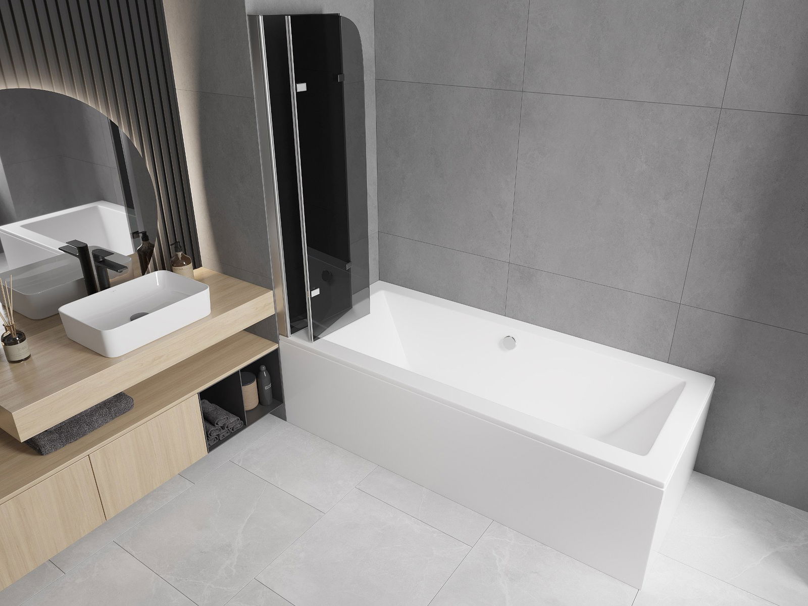 Parawan wykonany z trzech skrzydeł z możliwością złożenia. Takie rozwiązanie pozwala zaoszczędzić więcej miejsca w łazience i umożliwia swobodne korzystanie z pozostałej przestrzeni, gdy nie korzystamy ze strefy kąpielowej.
