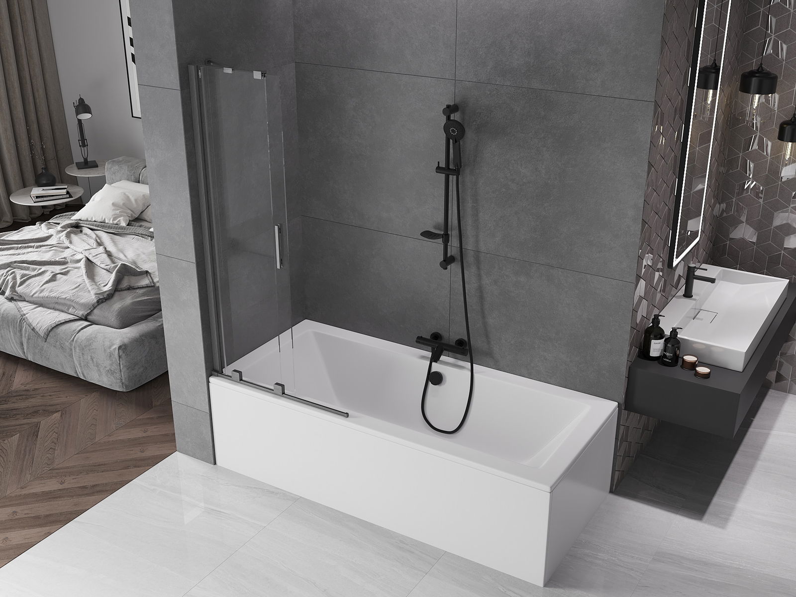 Dzięki zastosowaniu uniwersalnego systemu mocowania, parawan może być zamontowany z prawej lub z lewej strony, zależnie od potrzeb. W ten sposób możesz z łatwością zaprojektować prysznic dopasowany do przestrzeni łazienki.