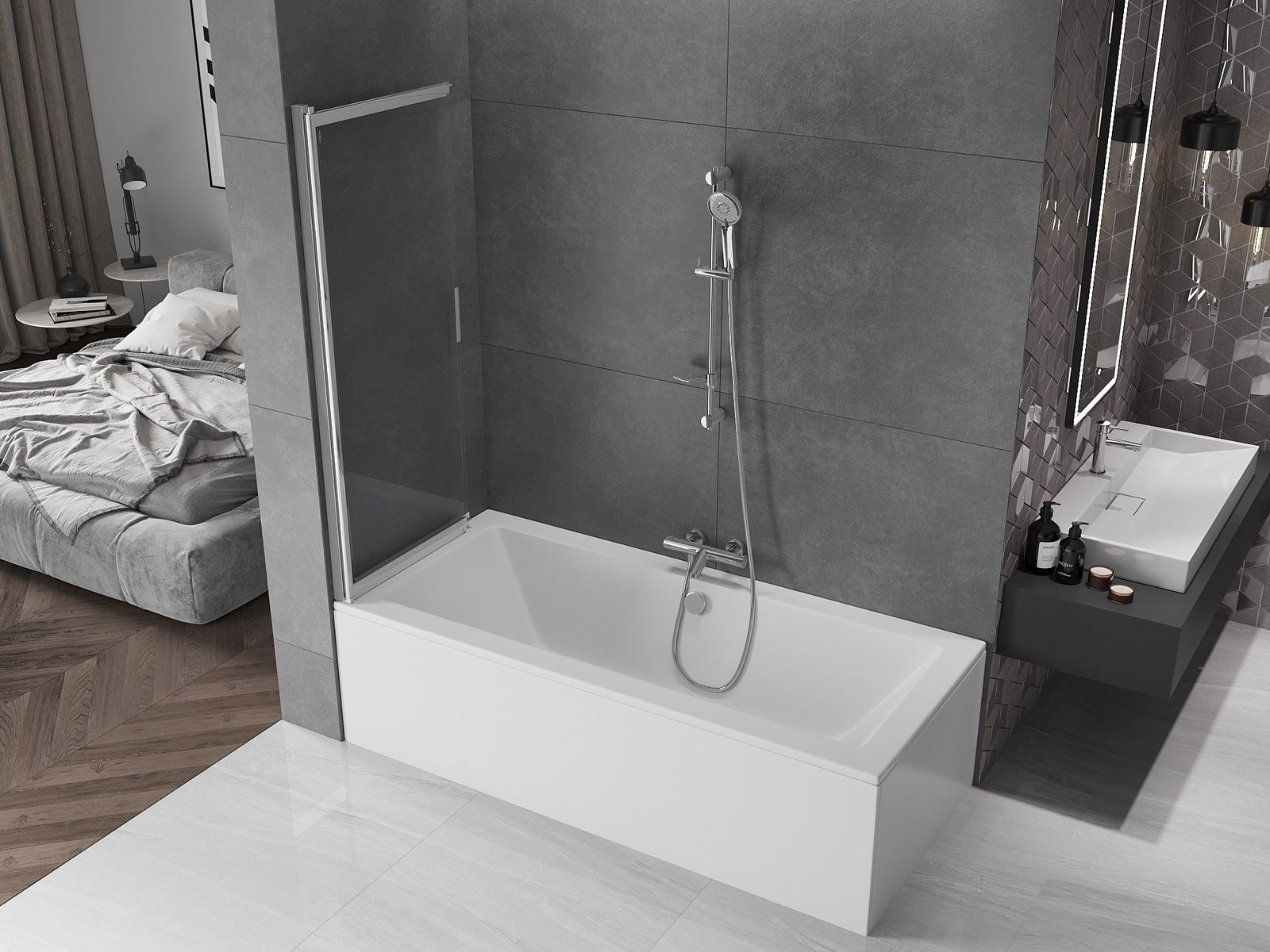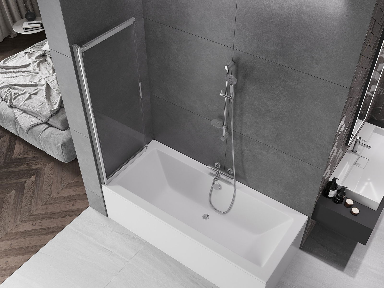 Dzięki zastosowaniu uniwersalnego systemu mocowania, parawan może być zamontowany z prawej lub z lewej strony, zależnie od potrzeb. W ten sposób możesz z łatwością zaprojektować prysznic dopasowany do przestrzeni łazienki.