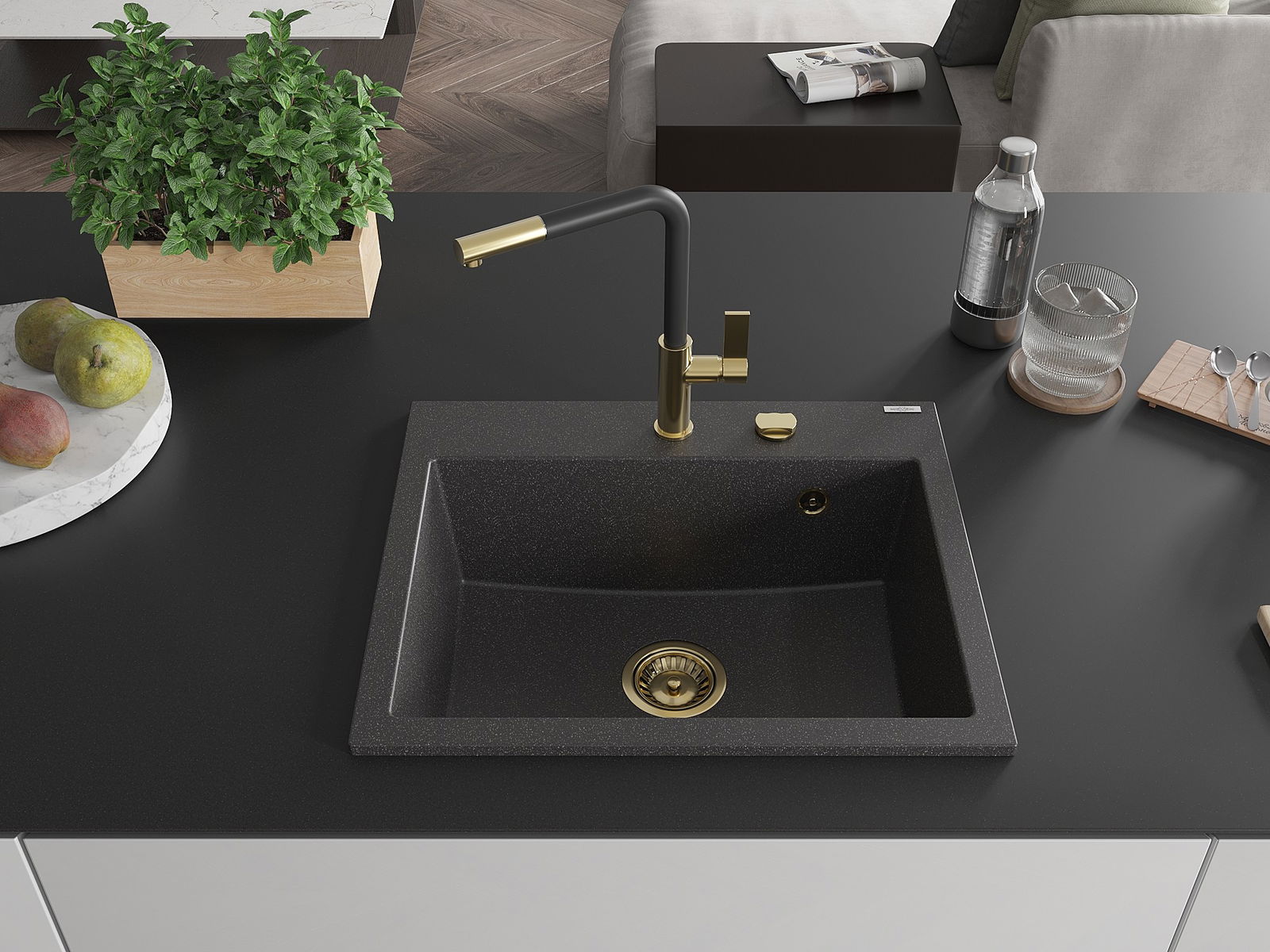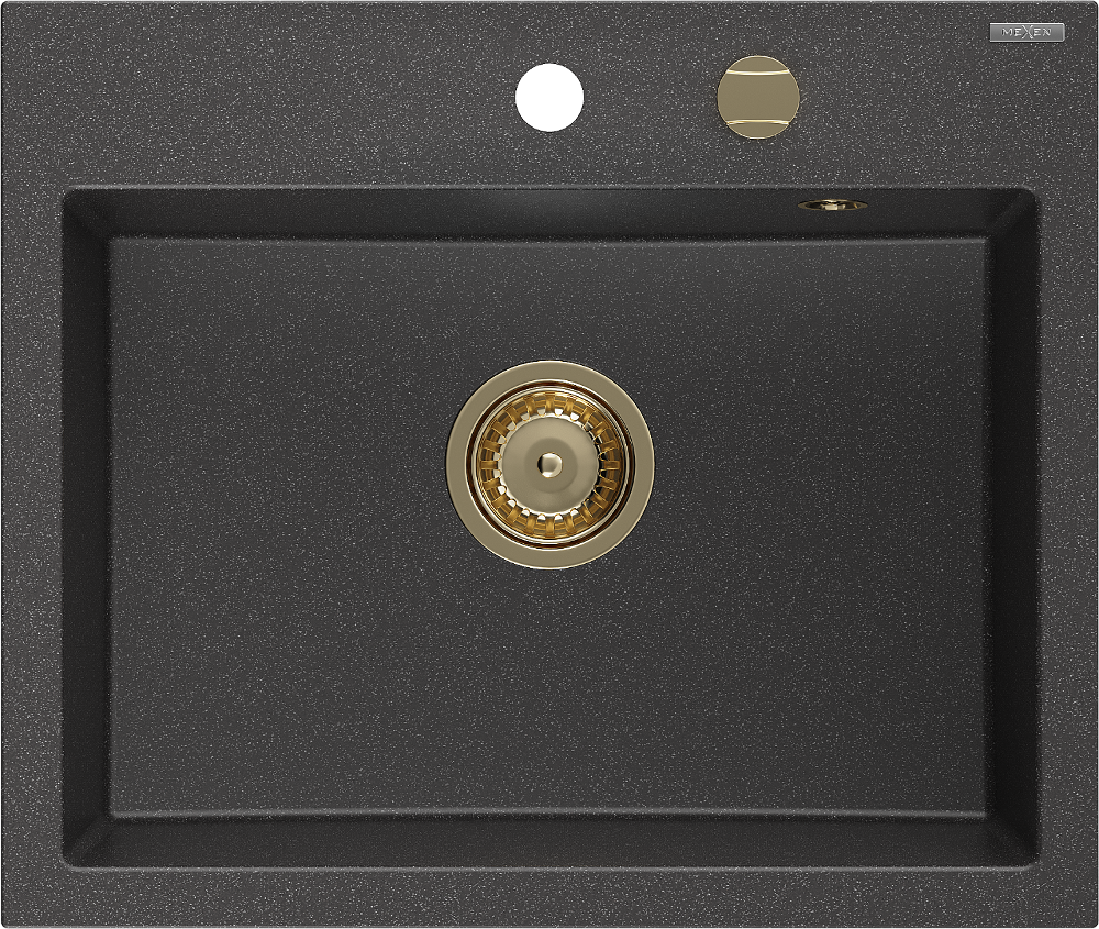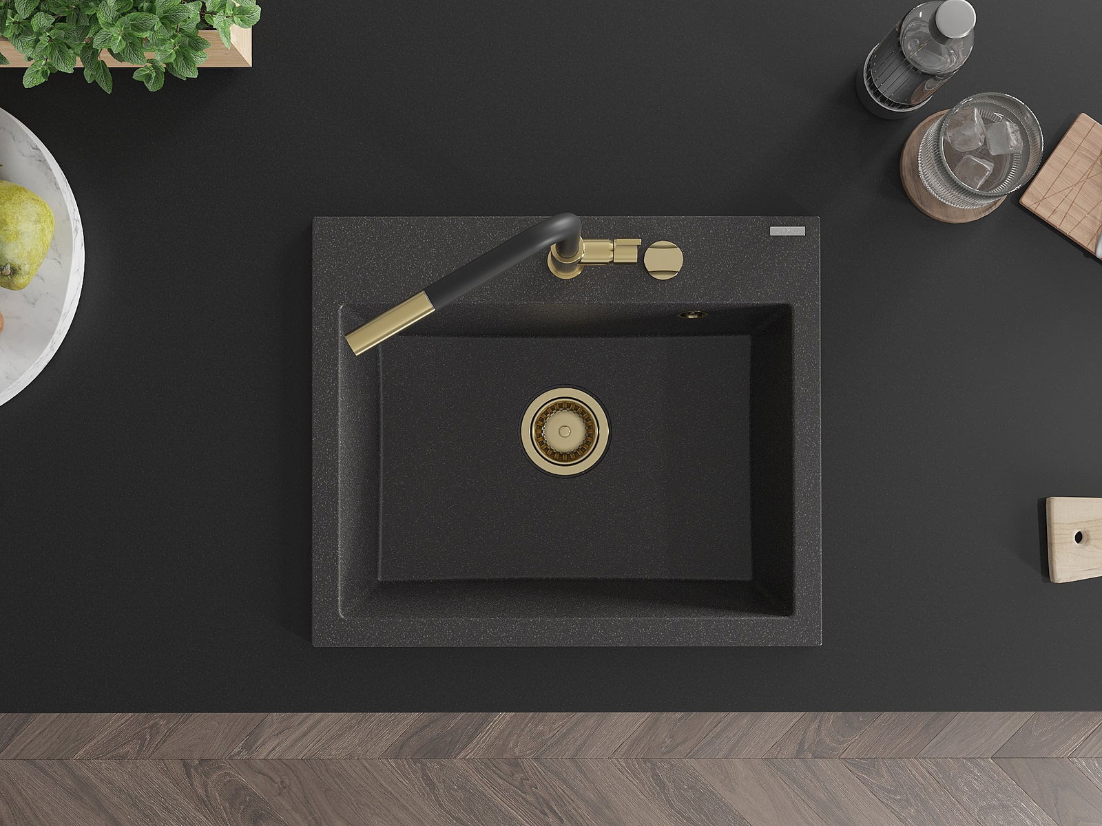 Mexen Oscar zlewozmywak granitowy 1-komorowy 580 x 490 mm, czarny nakrapiany, syfon złoty - 6519581000-76-G