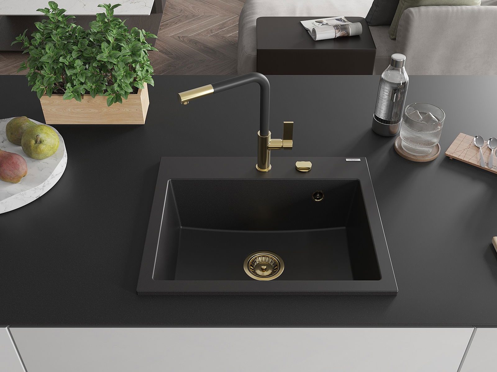 Zlew posiada podfrezowany otwór o średnicy 35 mm do samodzielnego wybicia. Można go wykorzystać m.in. do montażu dozownika na płyn, który wyeliminuje obecność plastikowych butelek w kuchni i nada jej eleganckiego wykończenia.
