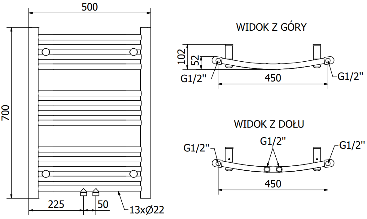 - 4xG ½″ od góry oraz dołu z prawej lub lewej strony