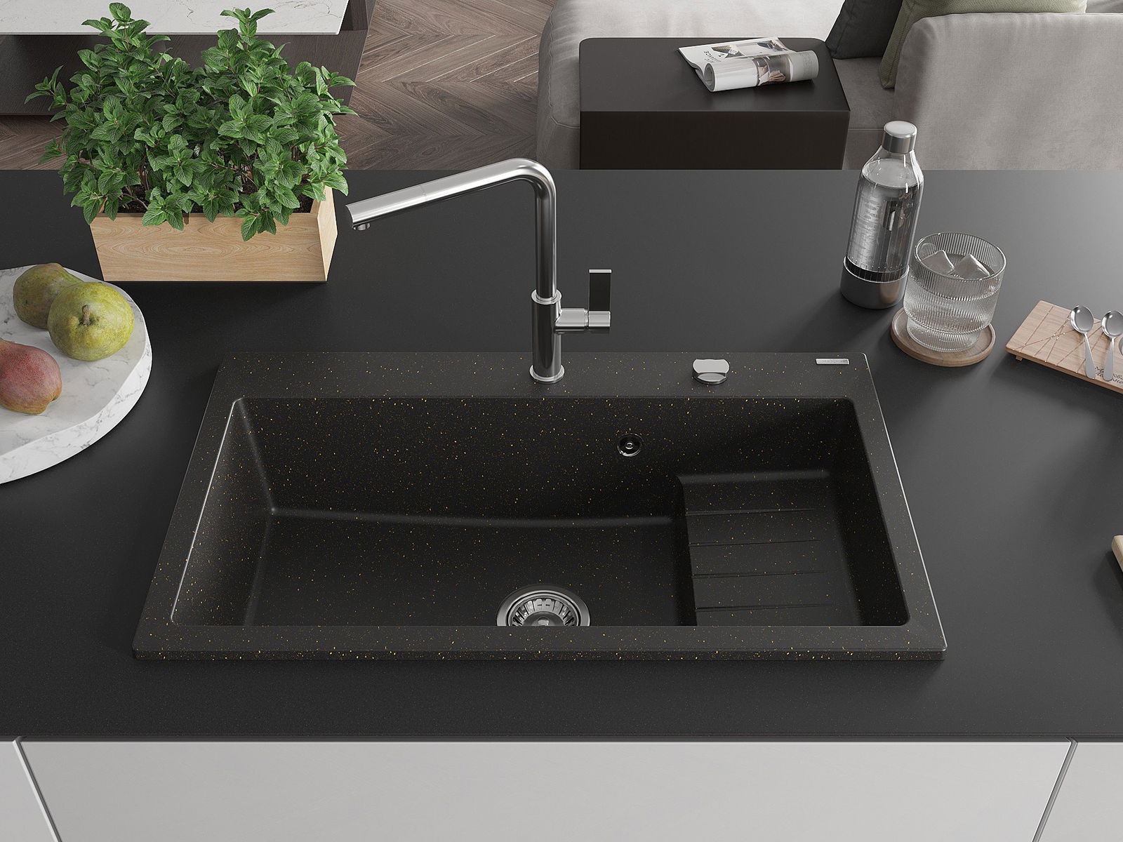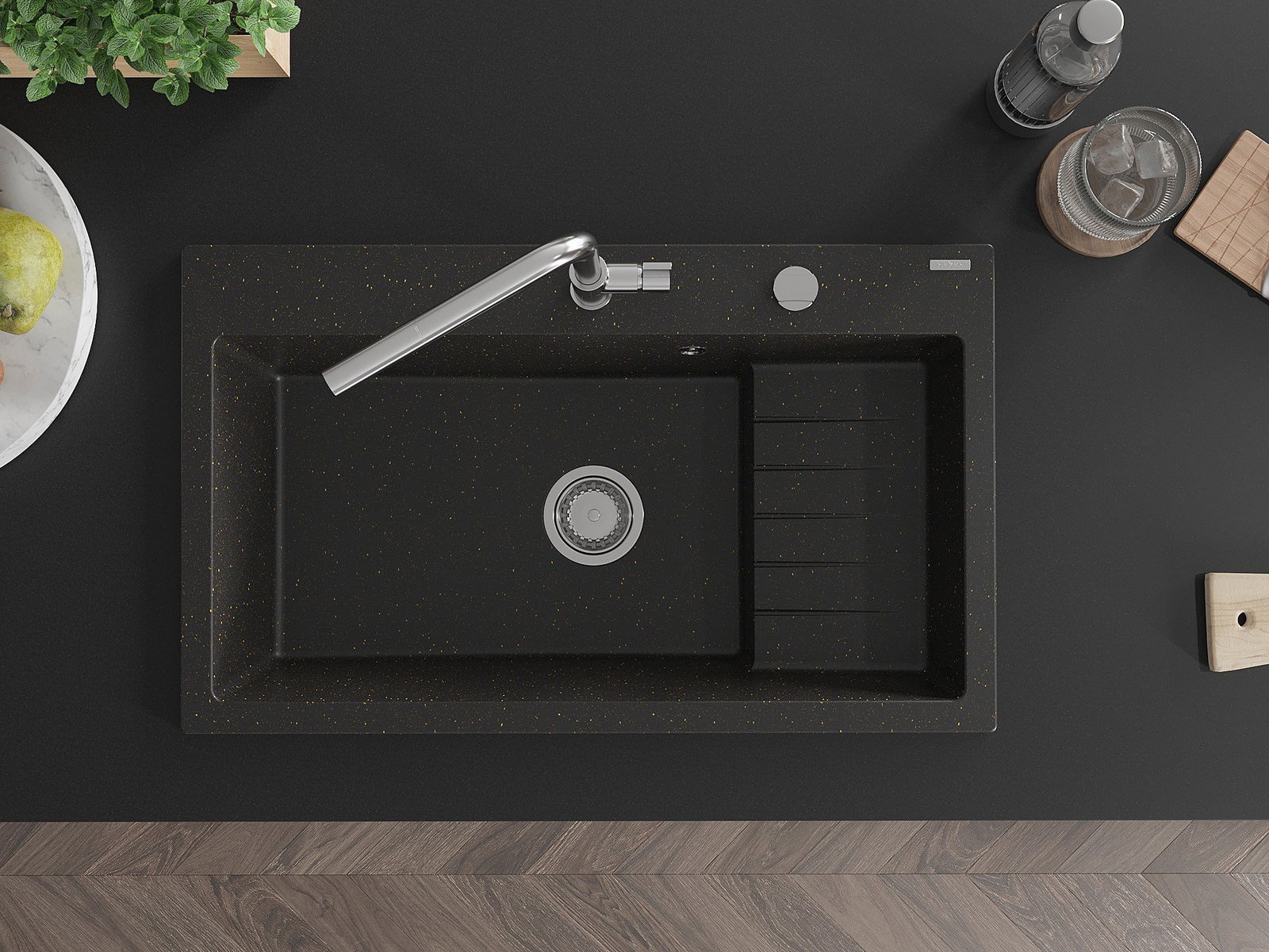 Mexen Omar zlewozmywak granitowy 1-komorowy 800 x 480 mm, czarny/złoty metalik, syfon chrom - 6520801005-75